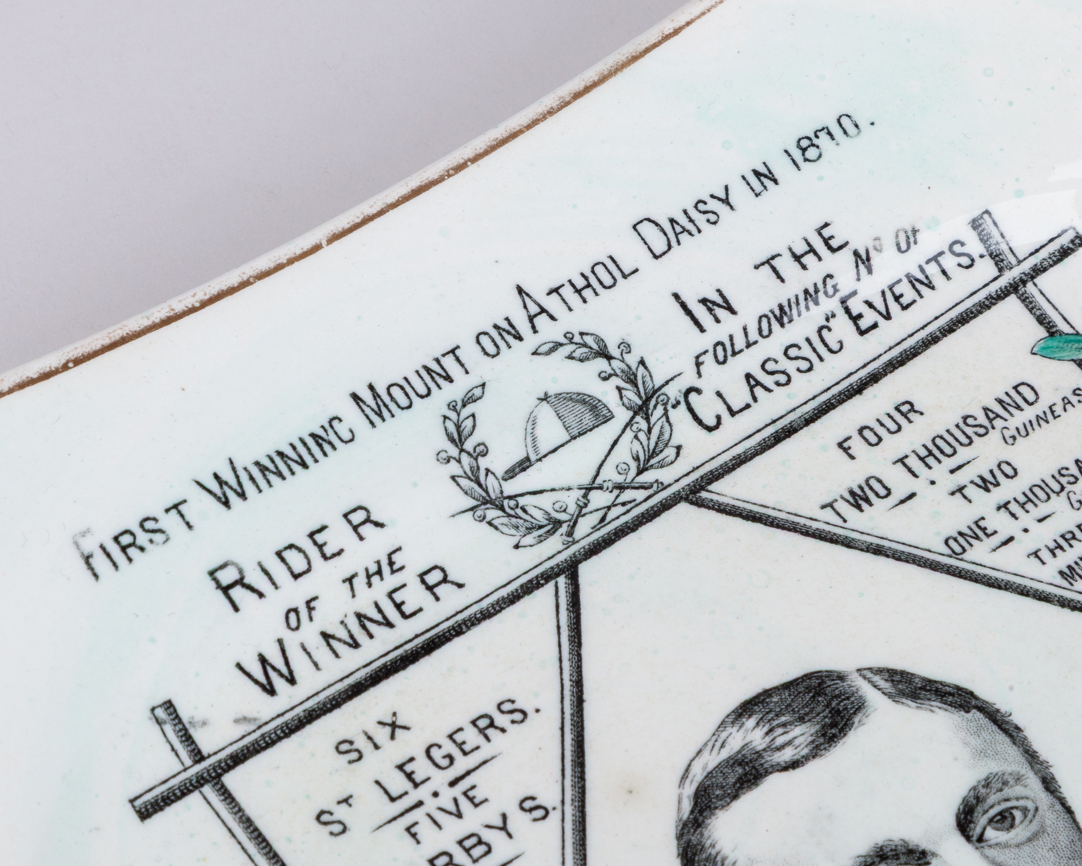printed with a portrait of the jockey and details of his career in the saddle, with colour forget me not floral decoration, diameter 24cm.
