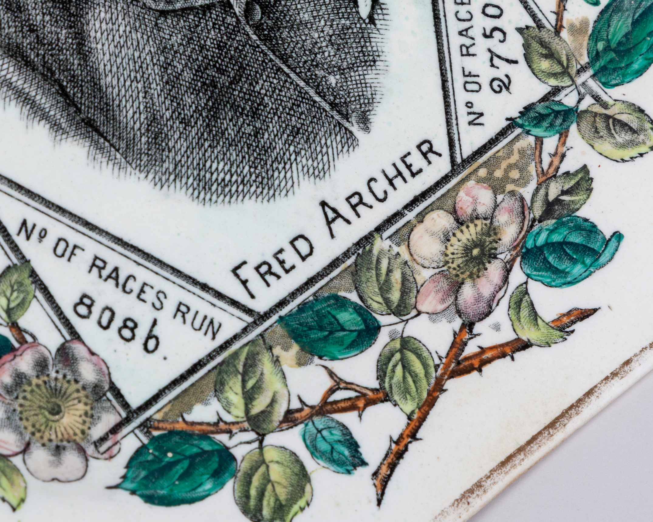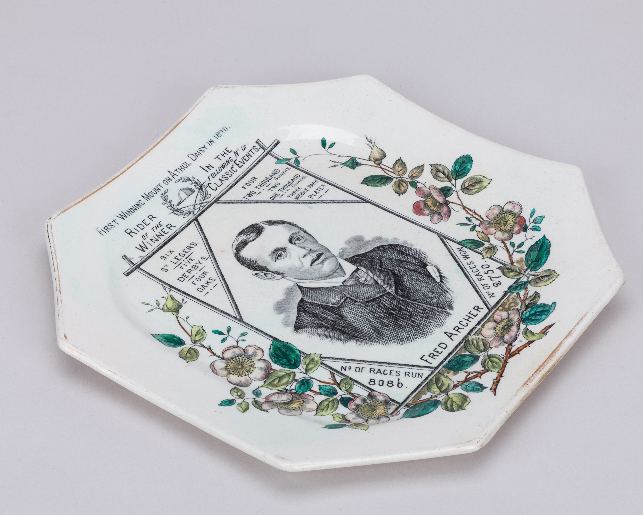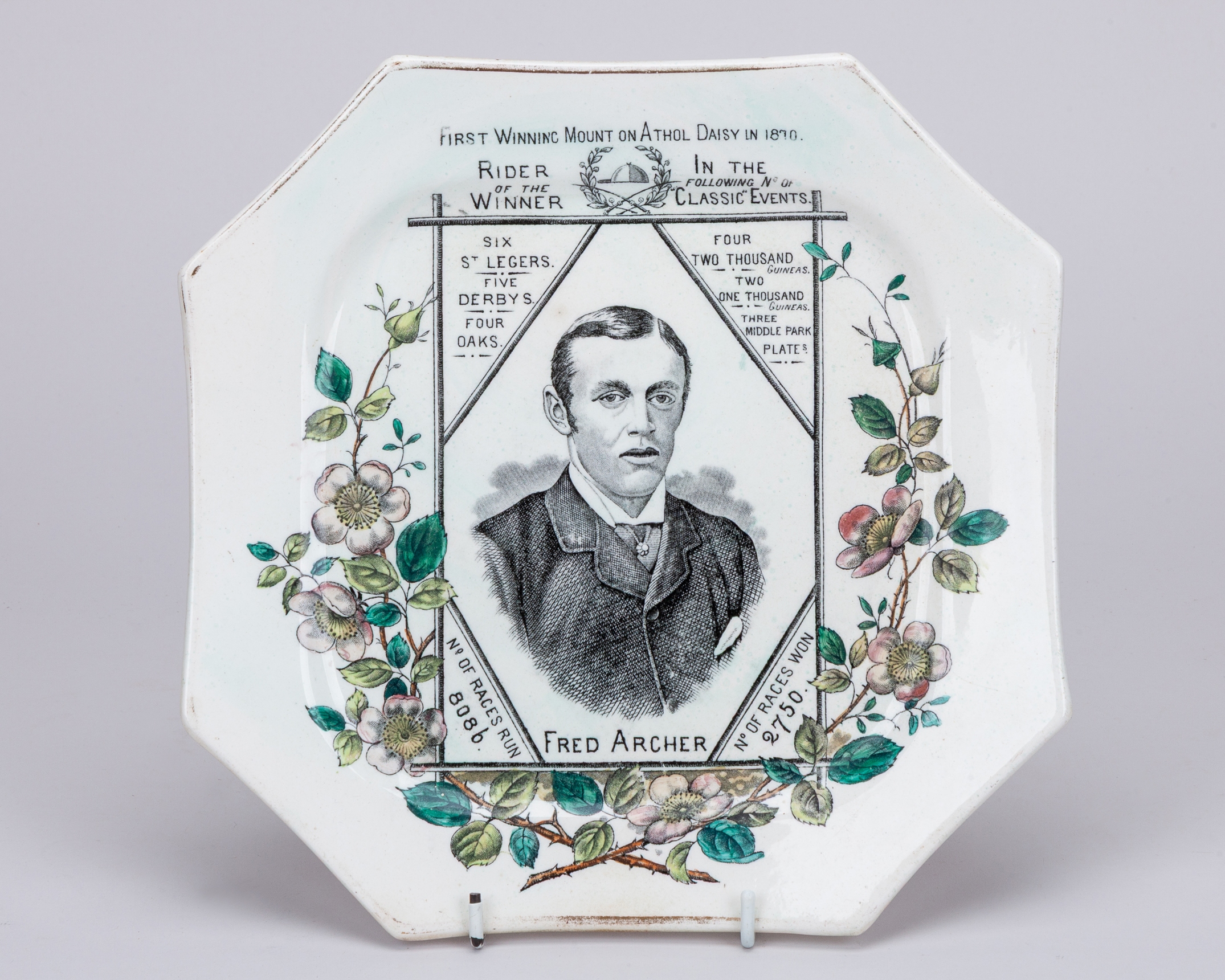Octagonal Staffordshire pottery plate commemorating the jockey Fred Archer circa 1886,