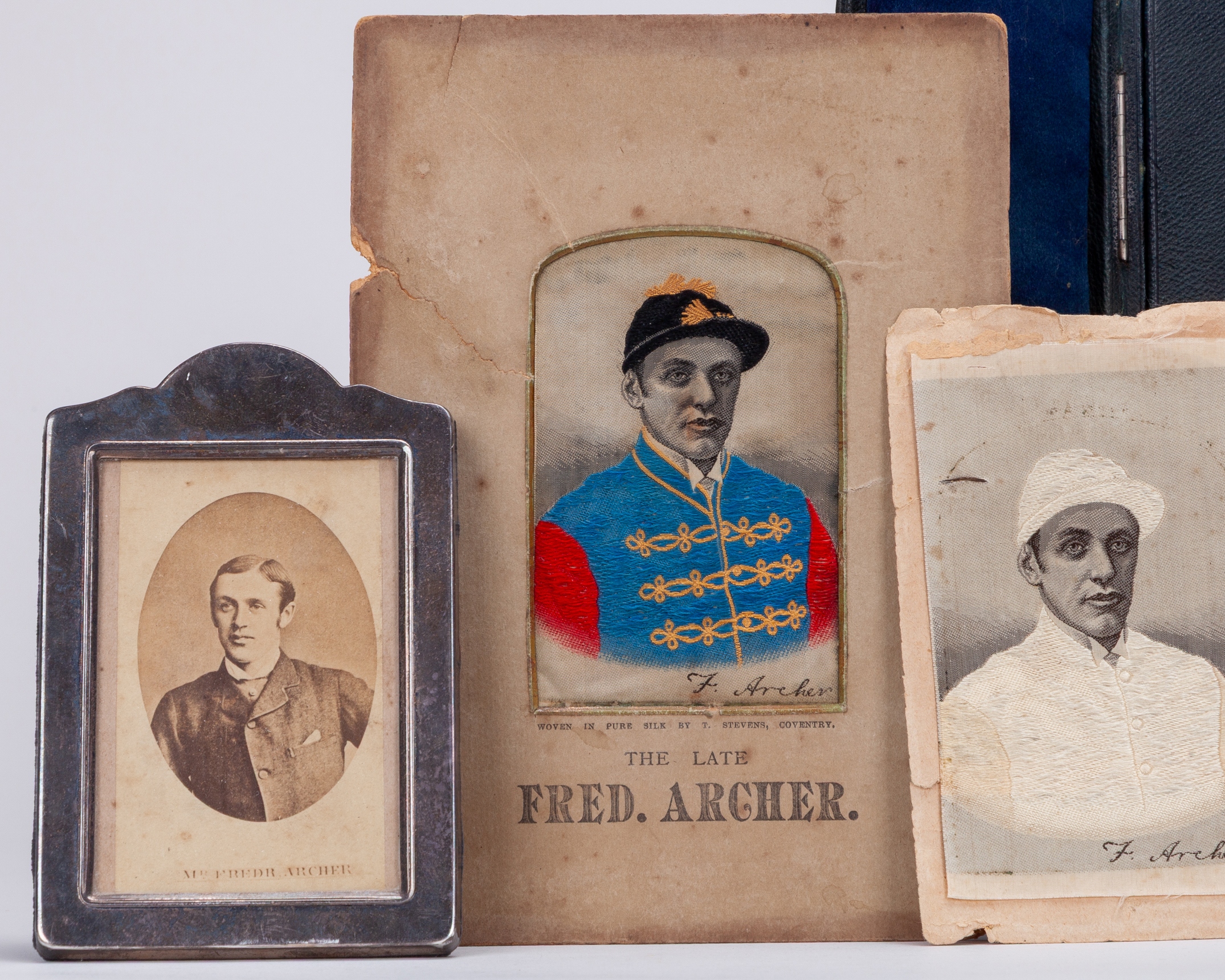 a cased memorial print titled F. ARCHER, 1857-86; a velvet-lined cased portrait photograph in gilt oval frame; two similar portrait photographs on in a hallmarked silver picture frame, the other in a wooden frame, and two stevengraphs, one in original matting, Archer depicted in the Royal Colours, the other trimmed to the silkwork