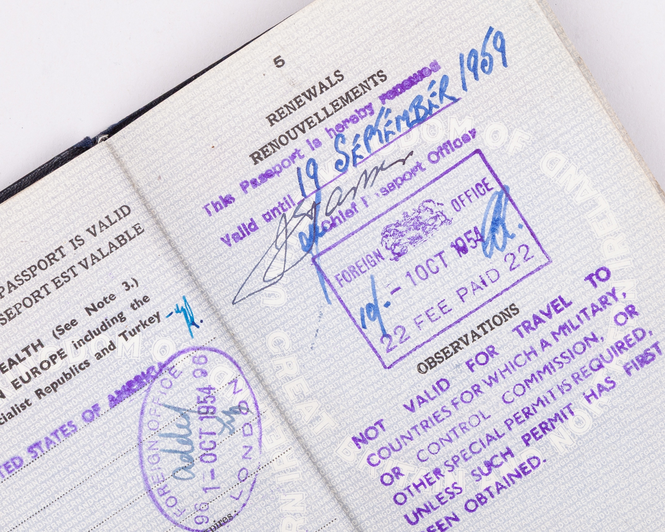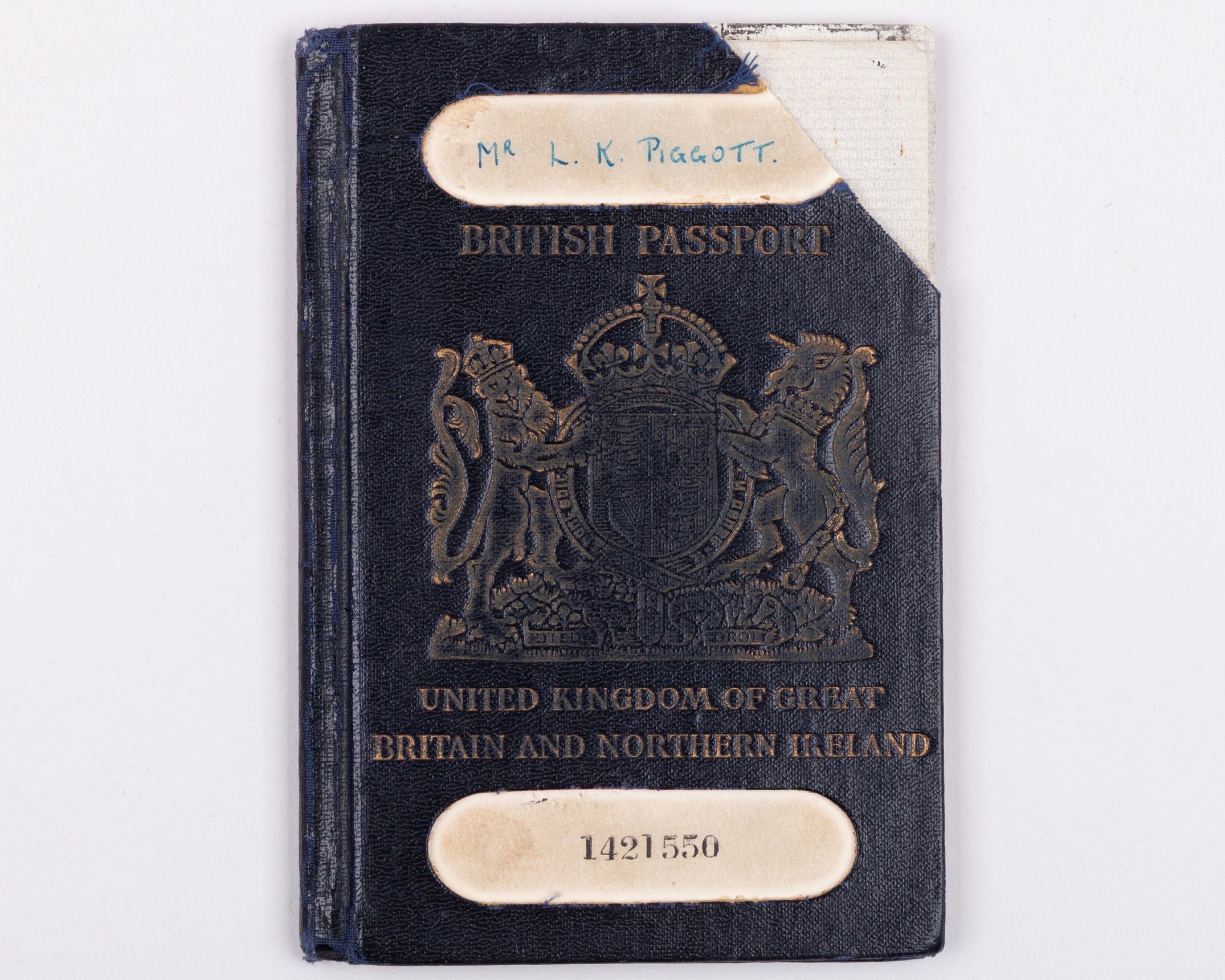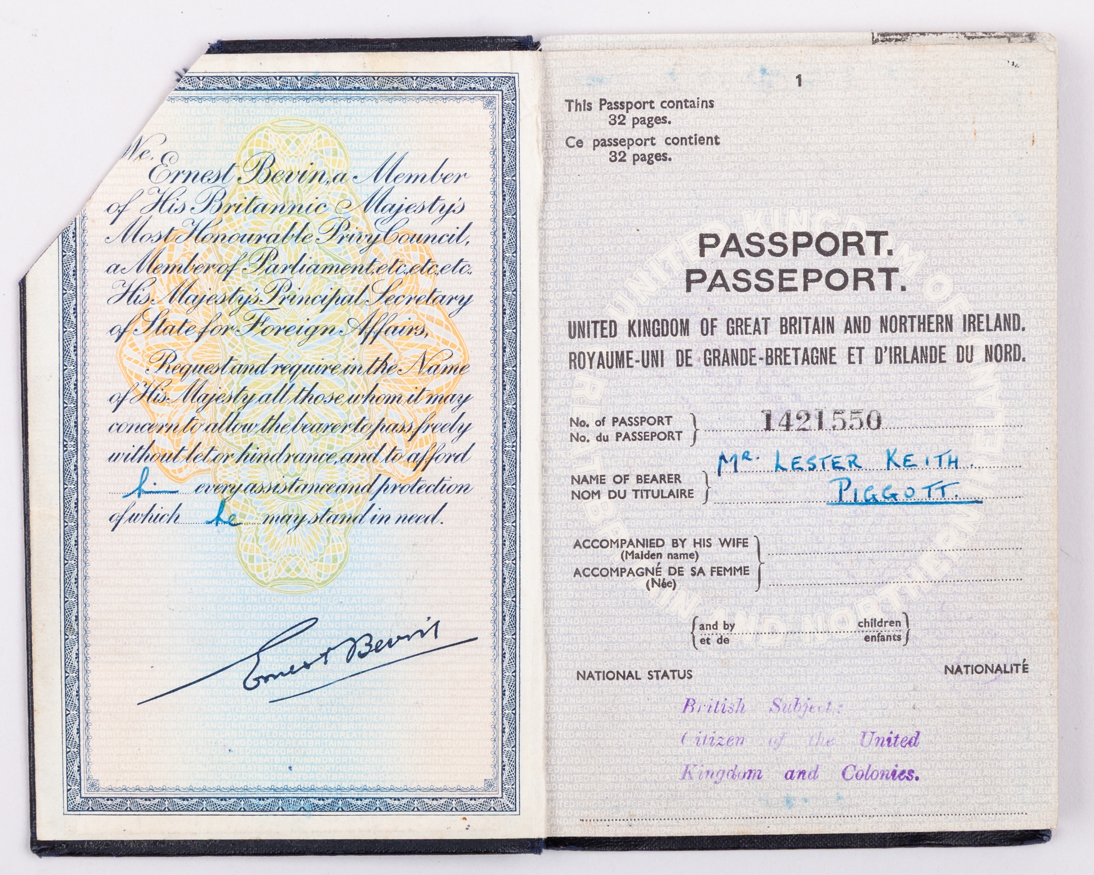 issued by the British Government Foreign office 19th September 1949 (LP 13 years old) and valid until 19th September 1959, Passport No.1421550, to Mr Lester Keith Piggott, profession "Jockey", born Wantage, England, 5 November 1935, height "4ft. 11in"., colour of eyes "blue", colour of hair "fair", the passport photo ID with full signature, bearing numerous stamps on the visa pages including Switzerland, Greece, France, Belgium, Italy, Germany, USA, Norway, Australia, Singapore and India, one page loose, front board diagonally cut top-right corner on expiry