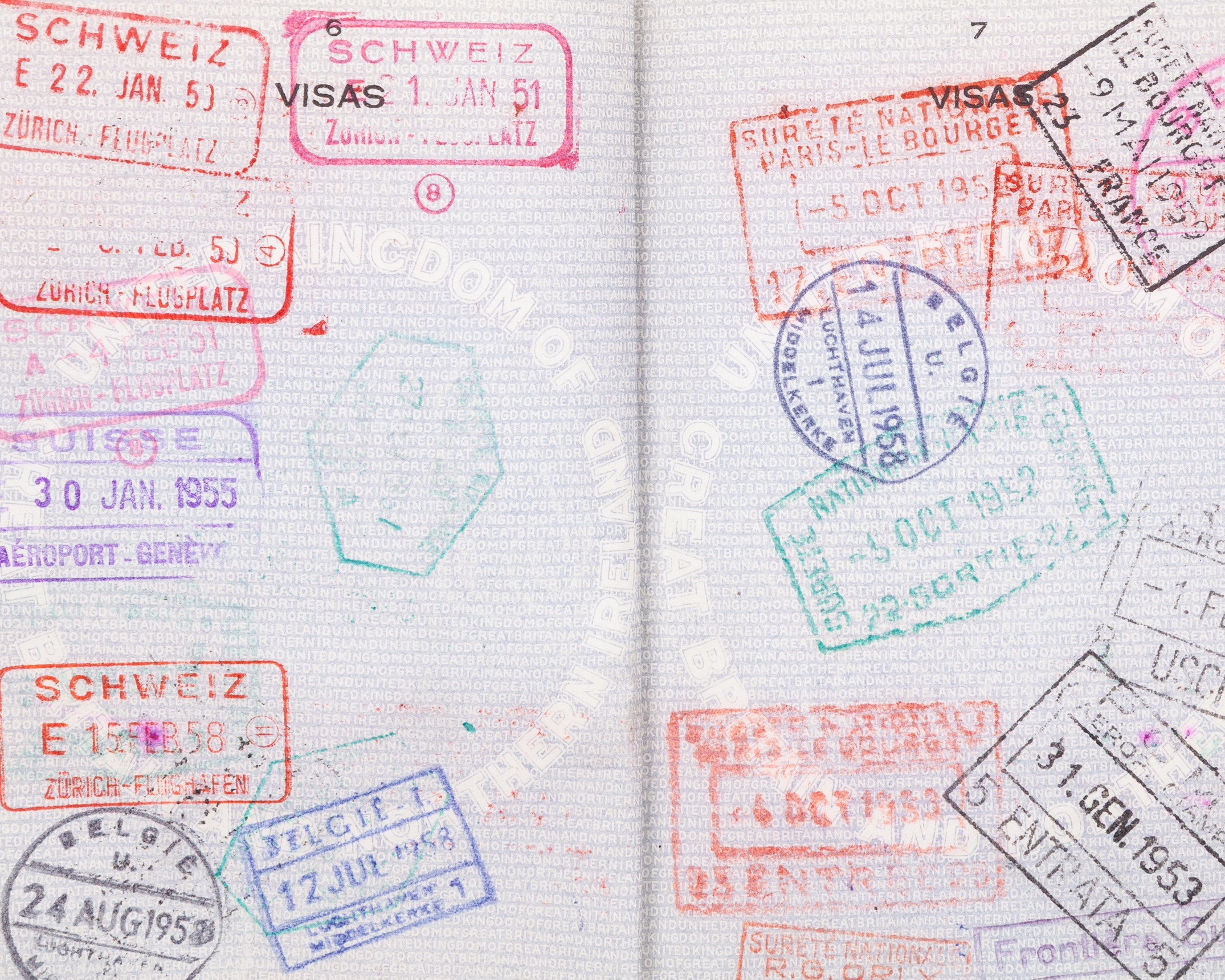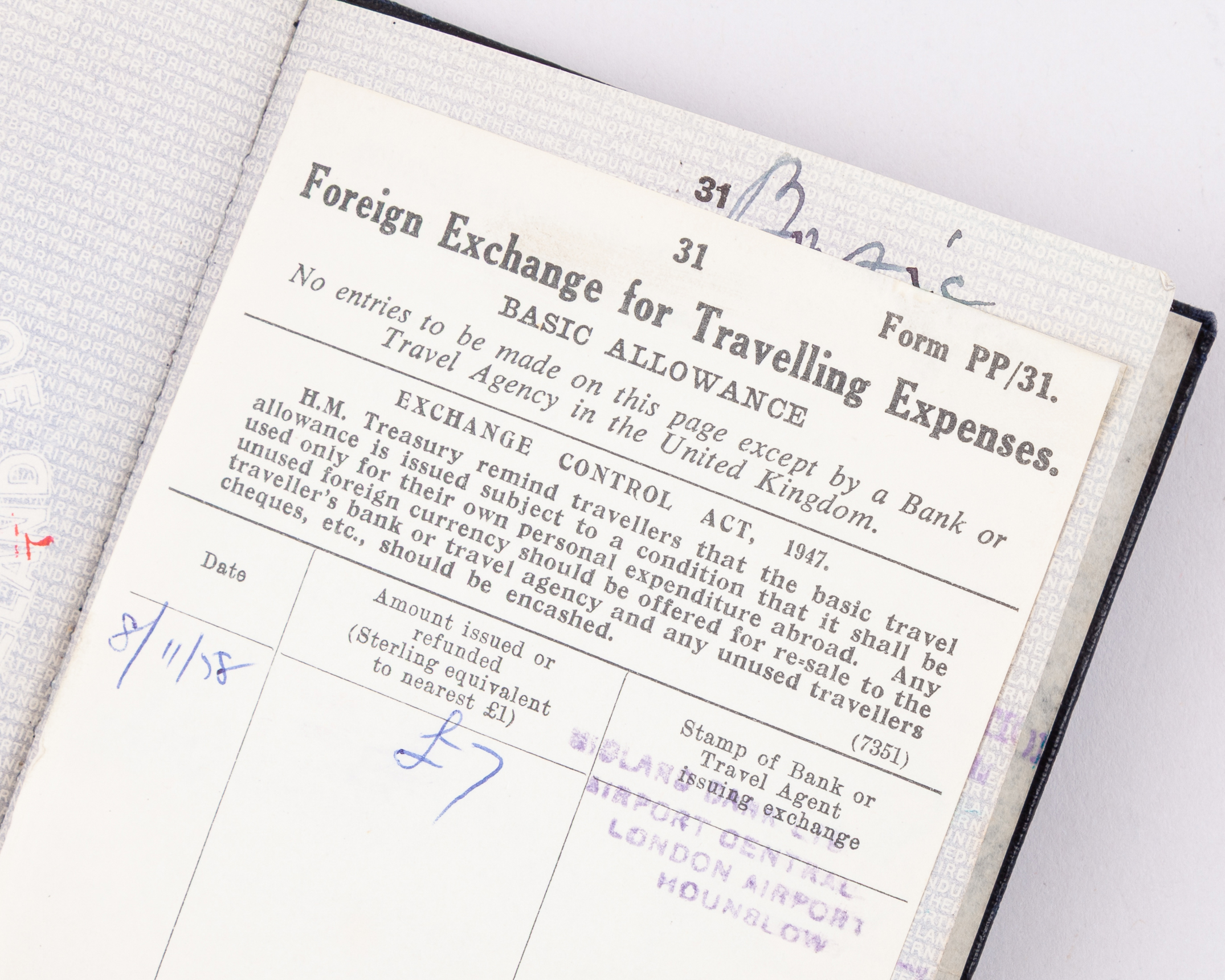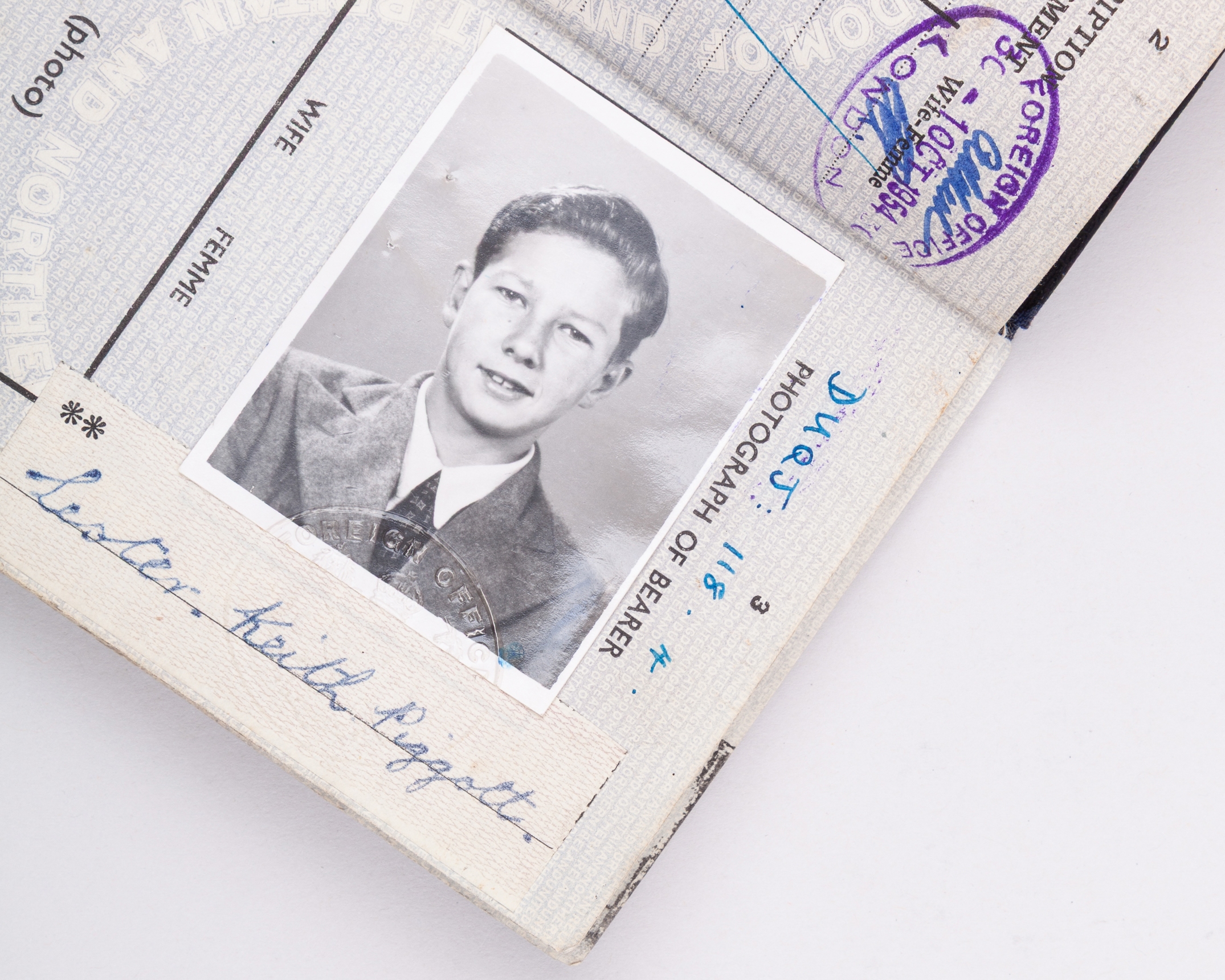 issued by the British Government Foreign office 19th September 1949 (LP 13 years old) and valid until 19th September 1959, Passport No.1421550, to Mr Lester Keith Piggott, profession "Jockey", born Wantage, England, 5 November 1935, height "4ft. 11in"., colour of eyes "blue", colour of hair "fair", the passport photo ID with full signature, bearing numerous stamps on the visa pages including Switzerland, Greece, France, Belgium, Italy, Germany, USA, Norway, Australia, Singapore and India, one page loose, front board diagonally cut top-right corner on expiry