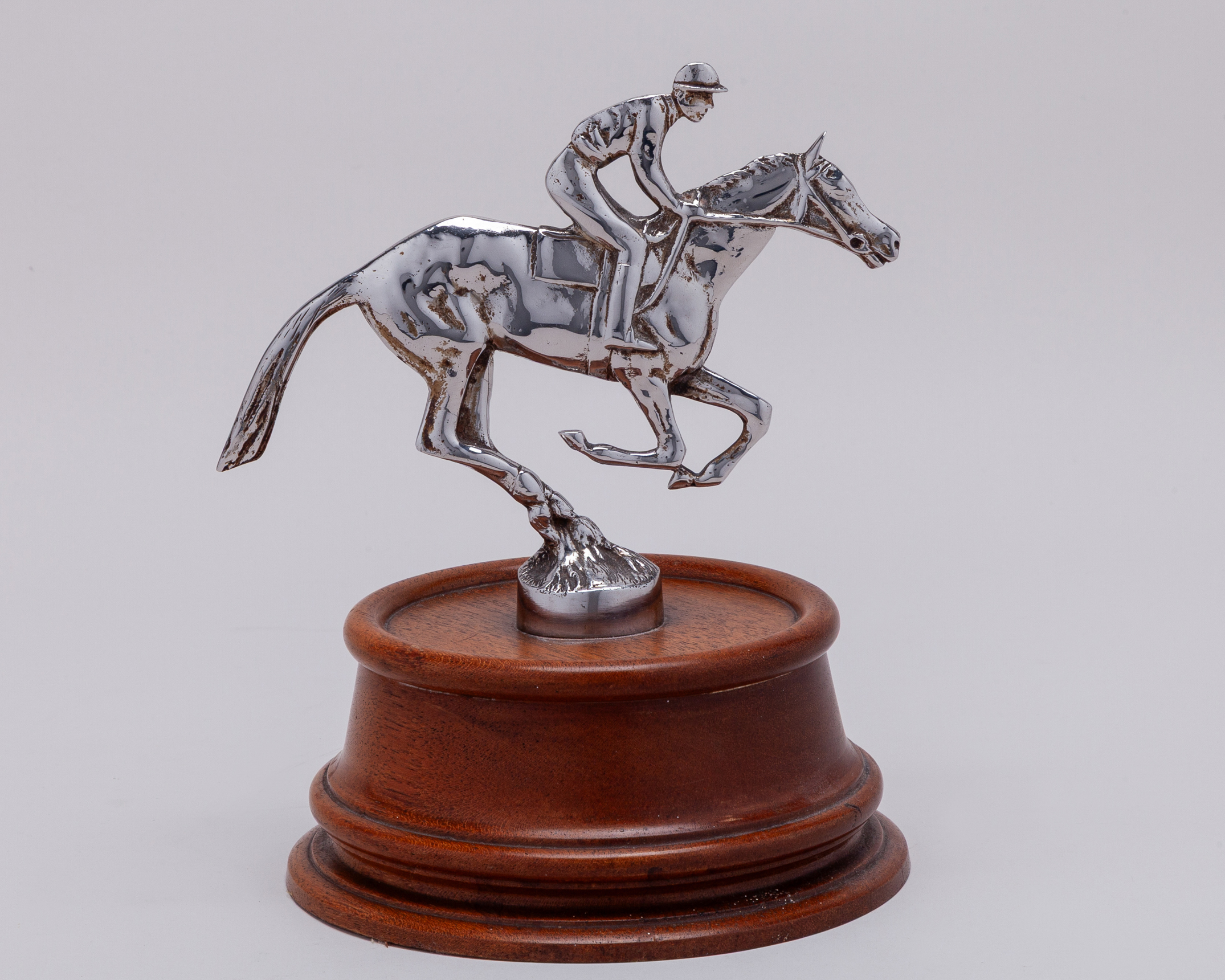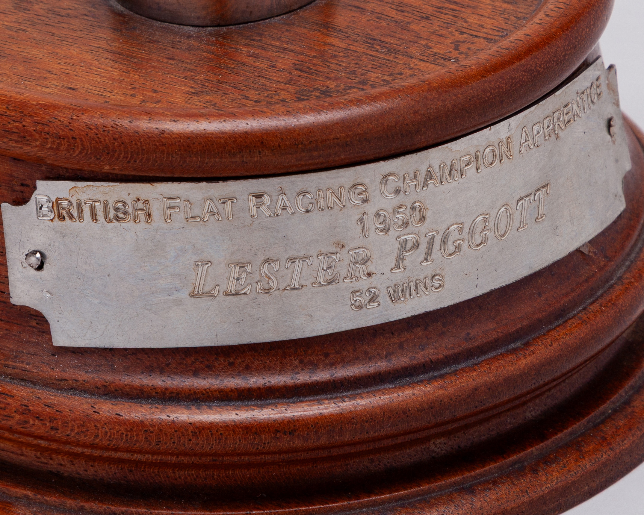 in the form of a chromed flat model of a racehorse & jockey, mounted on a turned wooden base set with metal plaque inscribed BRITISH FLAT RACING CHAMPION APPRENTICE, 1950, LESTER PIGGOTT, 52 WINS, height 21cm.