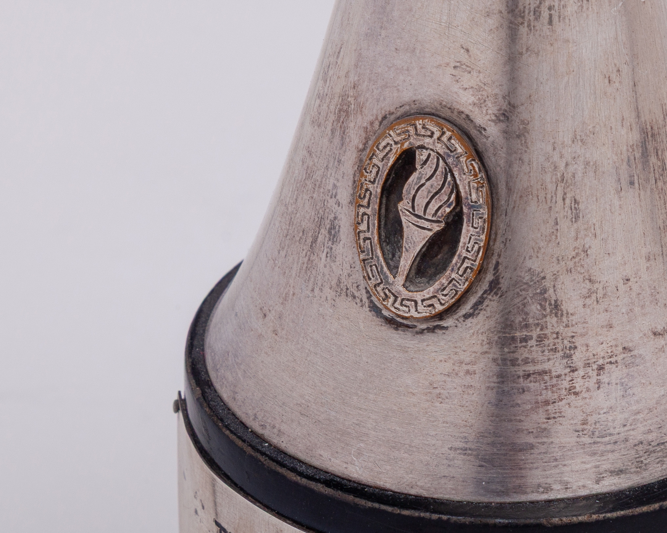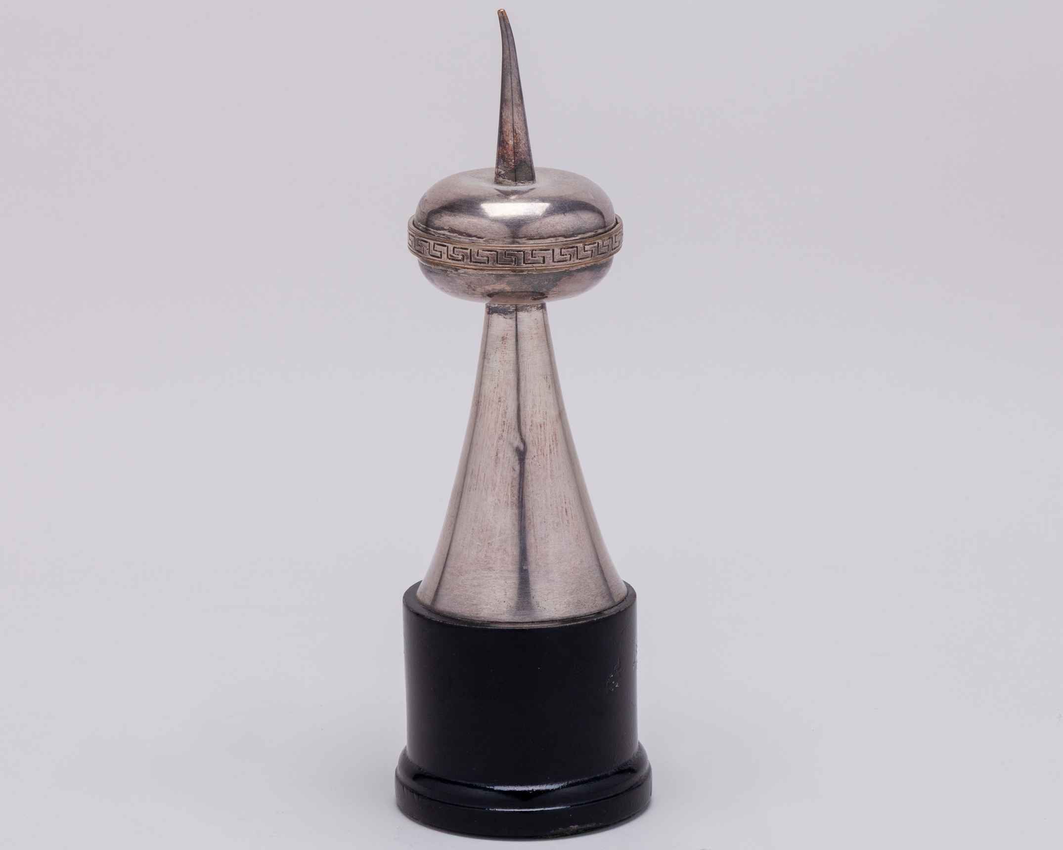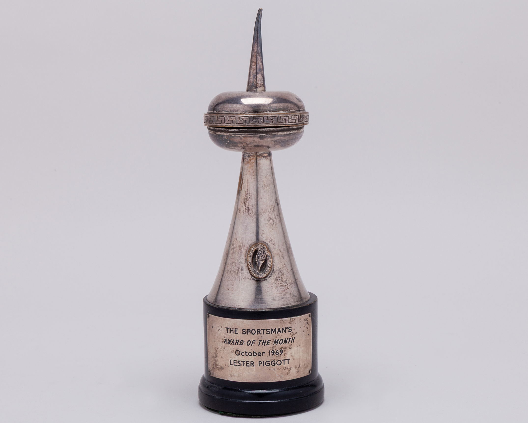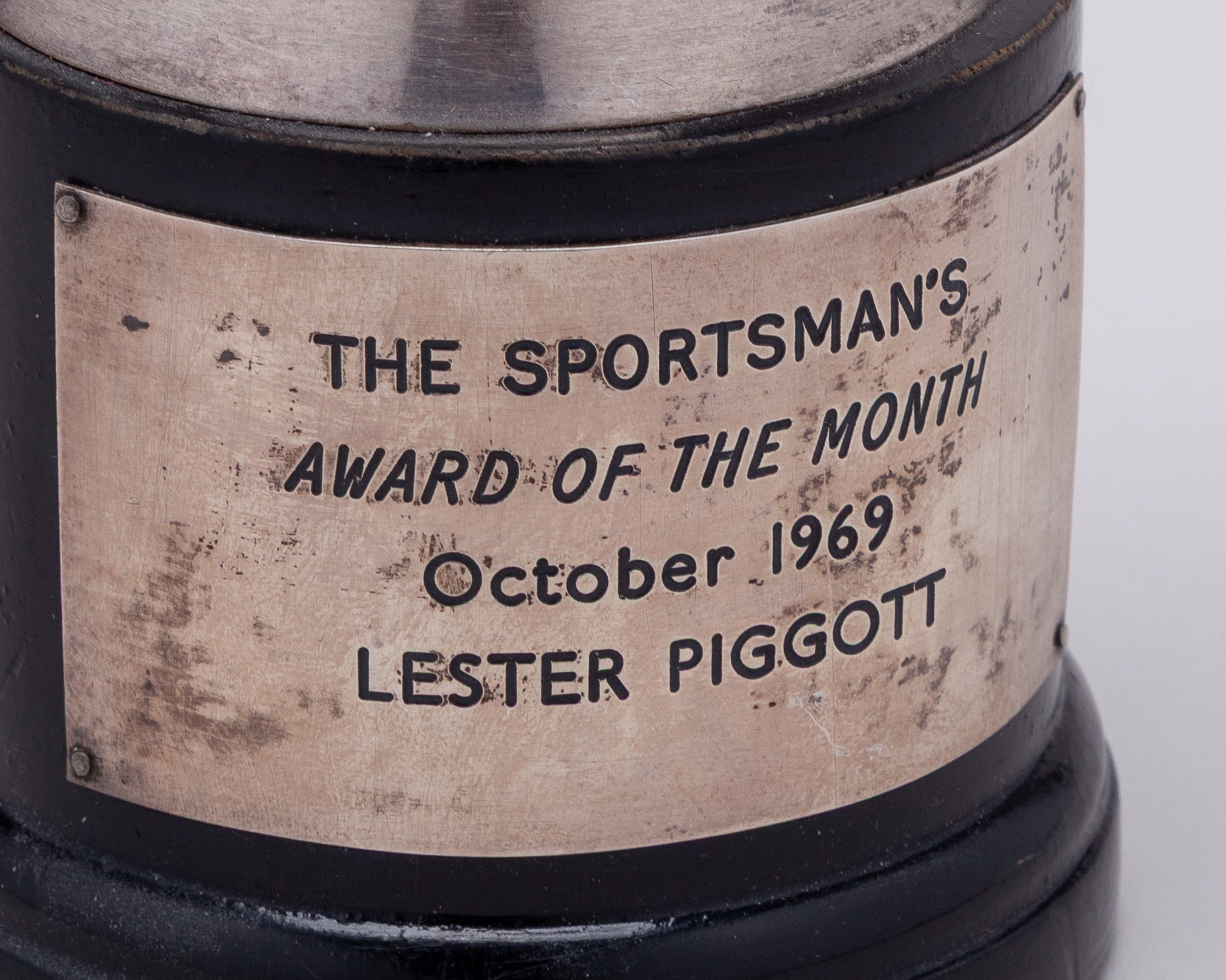 the trophy set on an ebonised base with plaque inscribed THE SPORTSMAN'S AWARD OF THE MONTH, OCTOBER 1969, LESTER PIGGOTT, height 25cm.