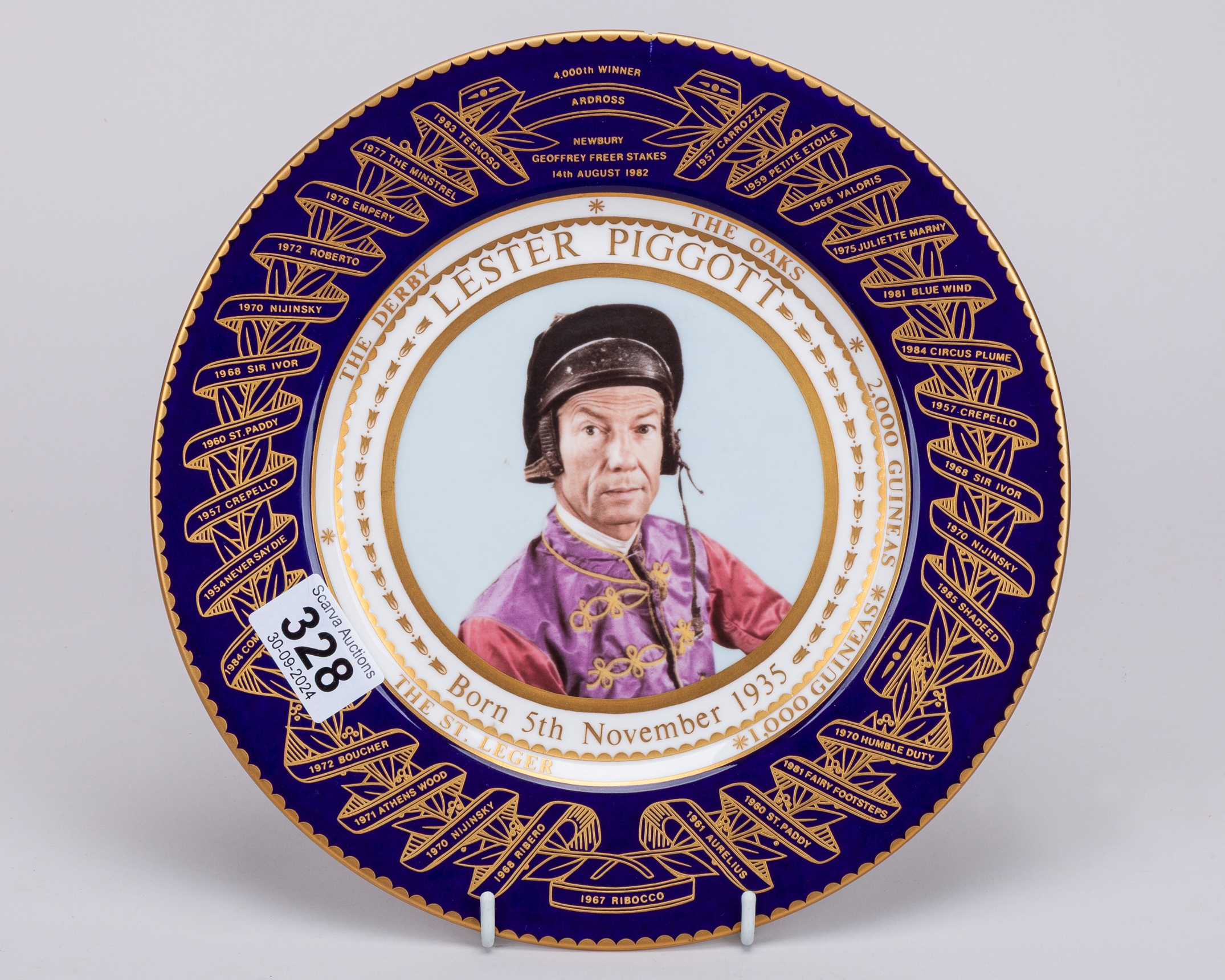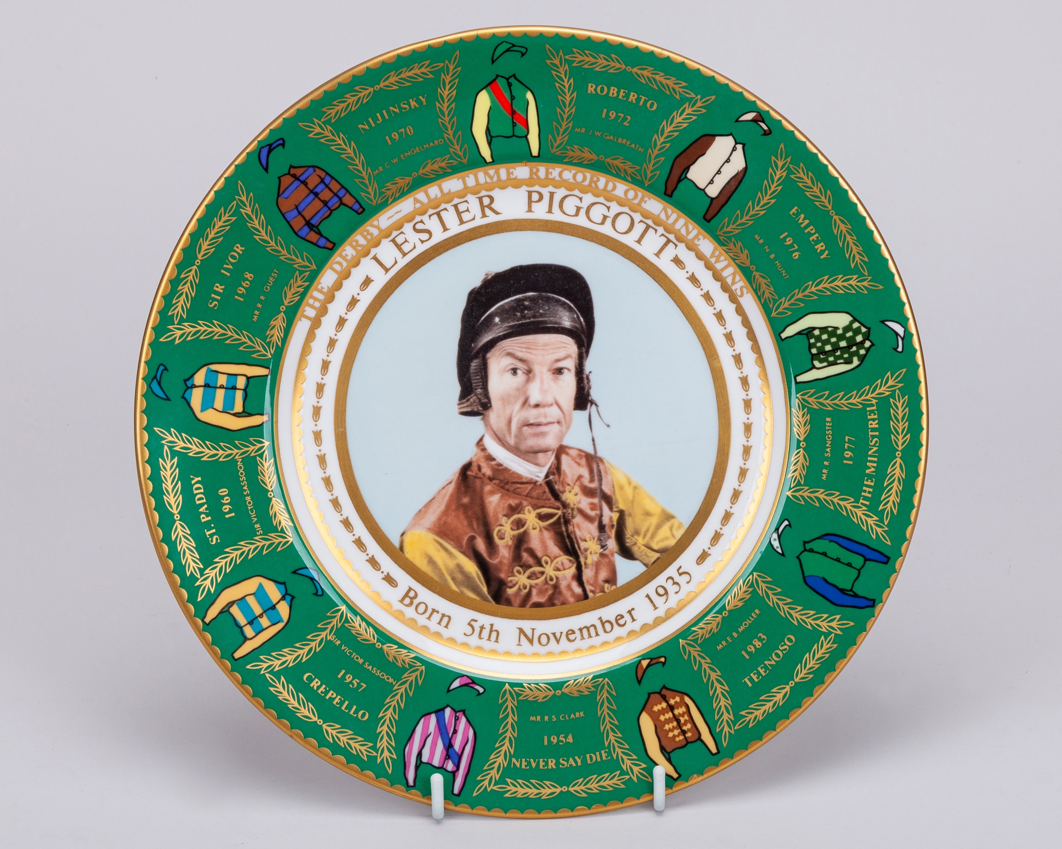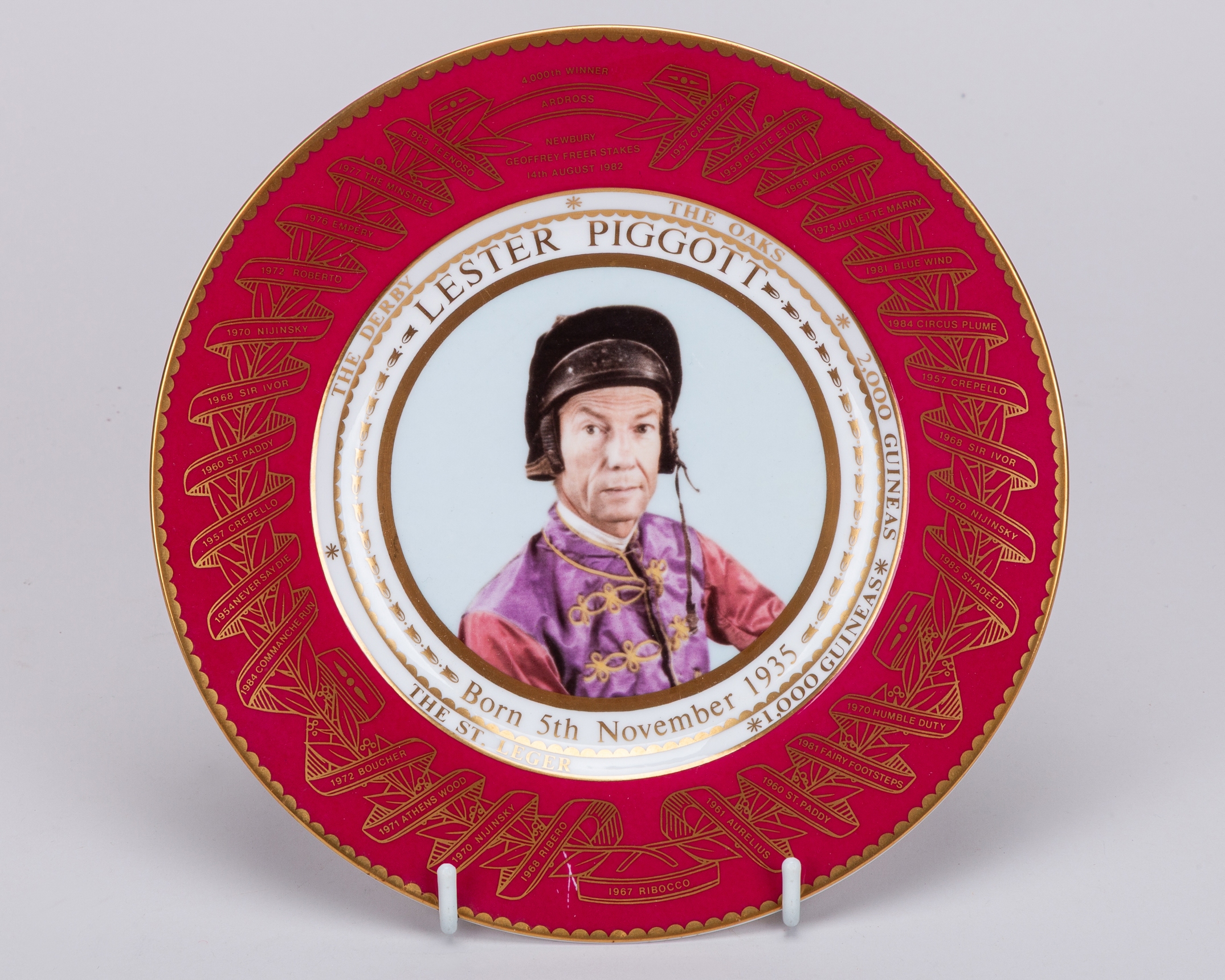 Collection of six china plates commemorating the jockey Lester Piggott,