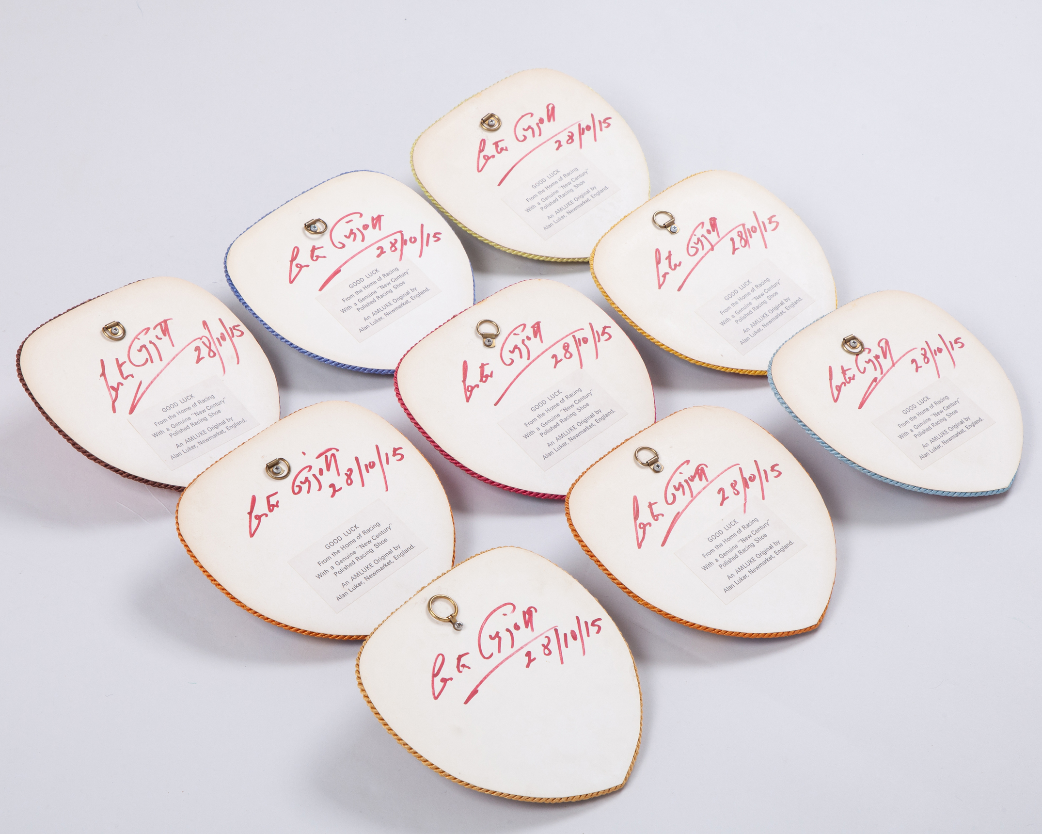by Amluke (Alan Luker) of Newmarket, each signed to the reverse in red marker and dated 28/10/15, ecah racing plate dressed in the colours of Lester's record nine Epsom Derby winners