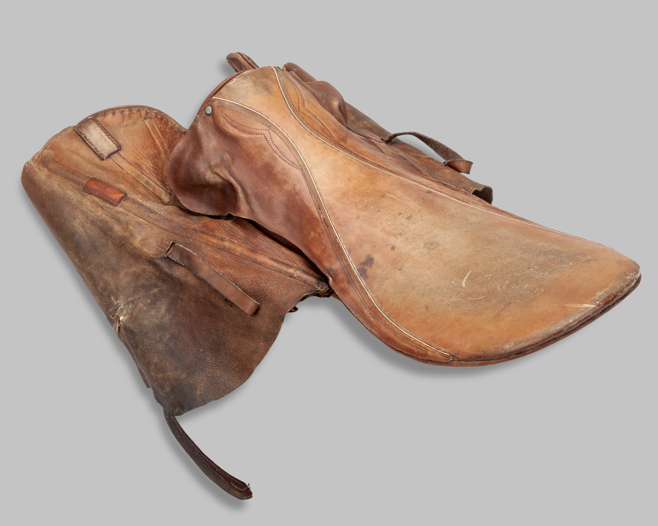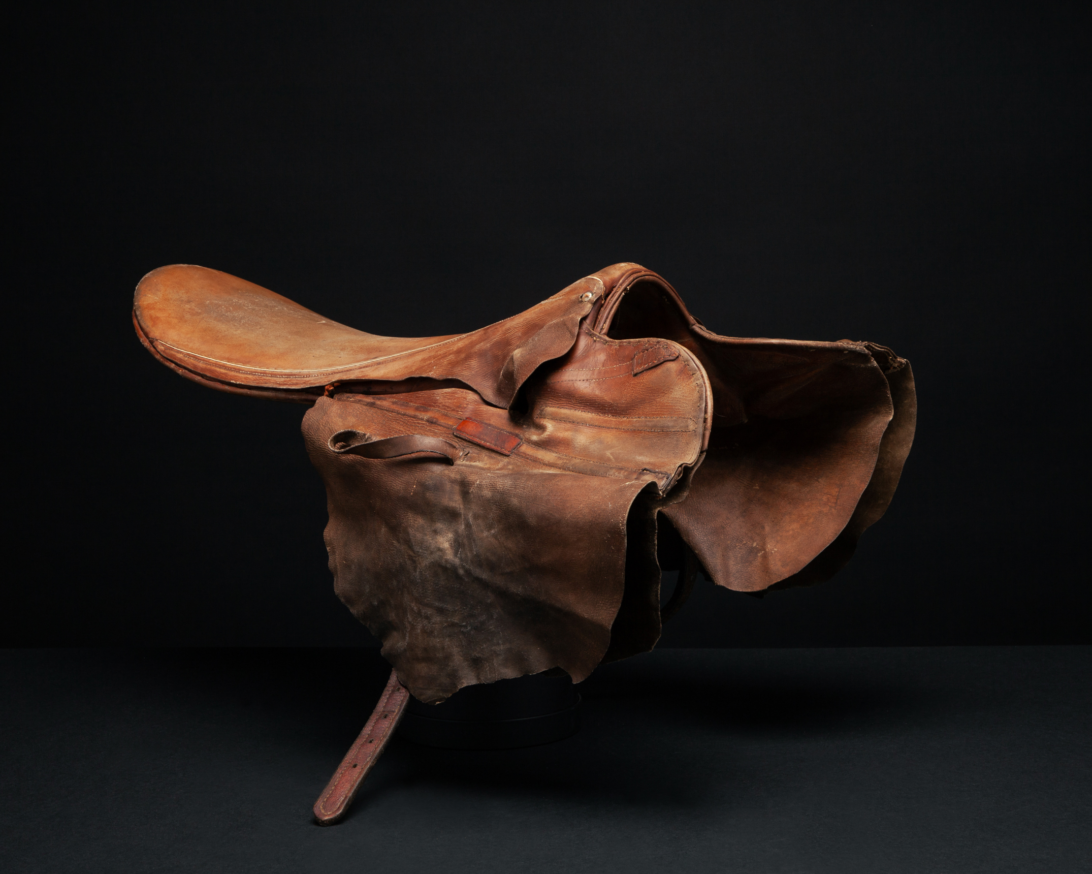 The saddle was donated by Lester Piggott as an auction prize at the Variety Club Charity Ball held at the home of Peter de Savary, Littlecote House, Wiltshire, England in 1986. The auctioneer at the charity event was the fanous English Actor Charles Dance. Lester had retired from race riding the year before.