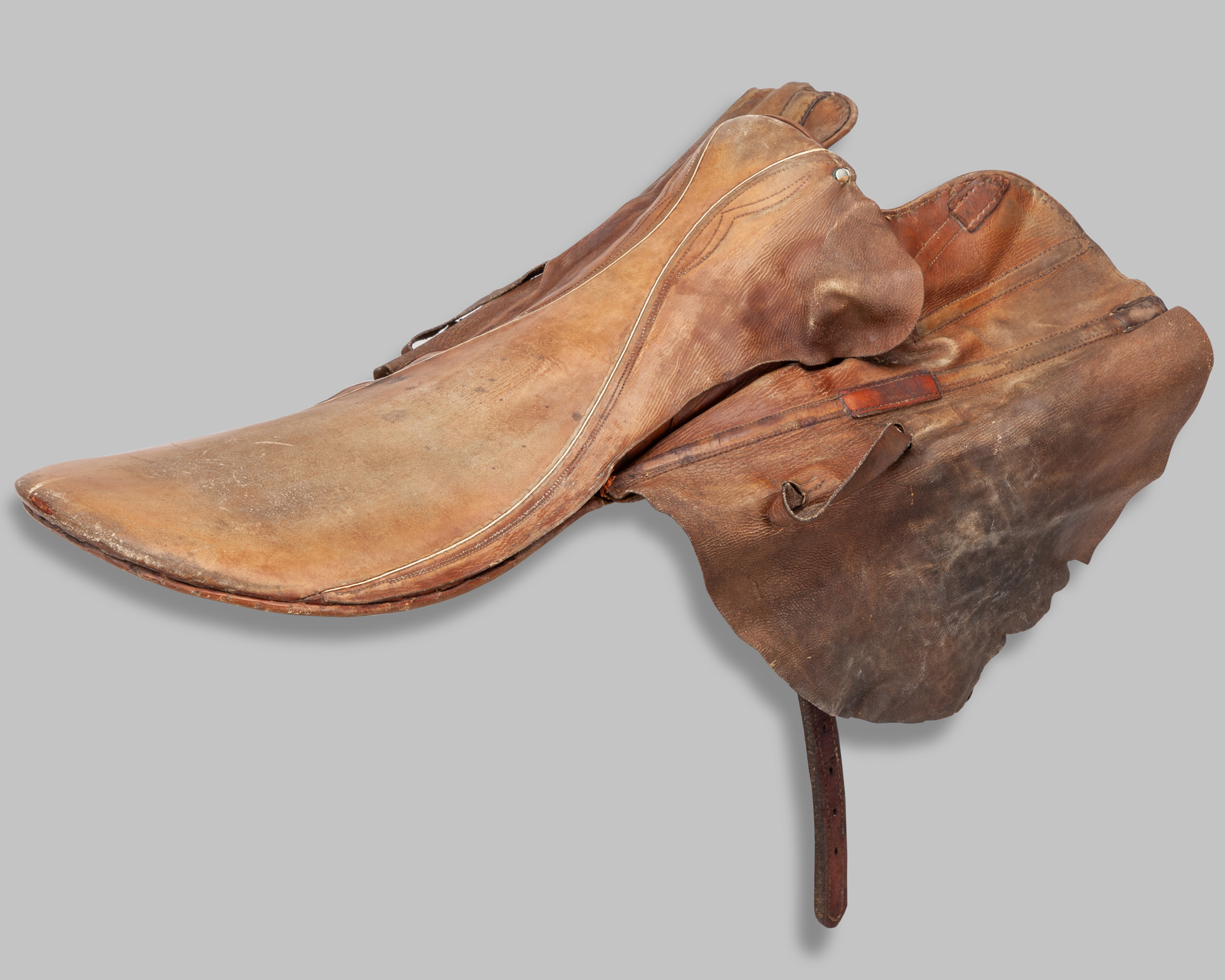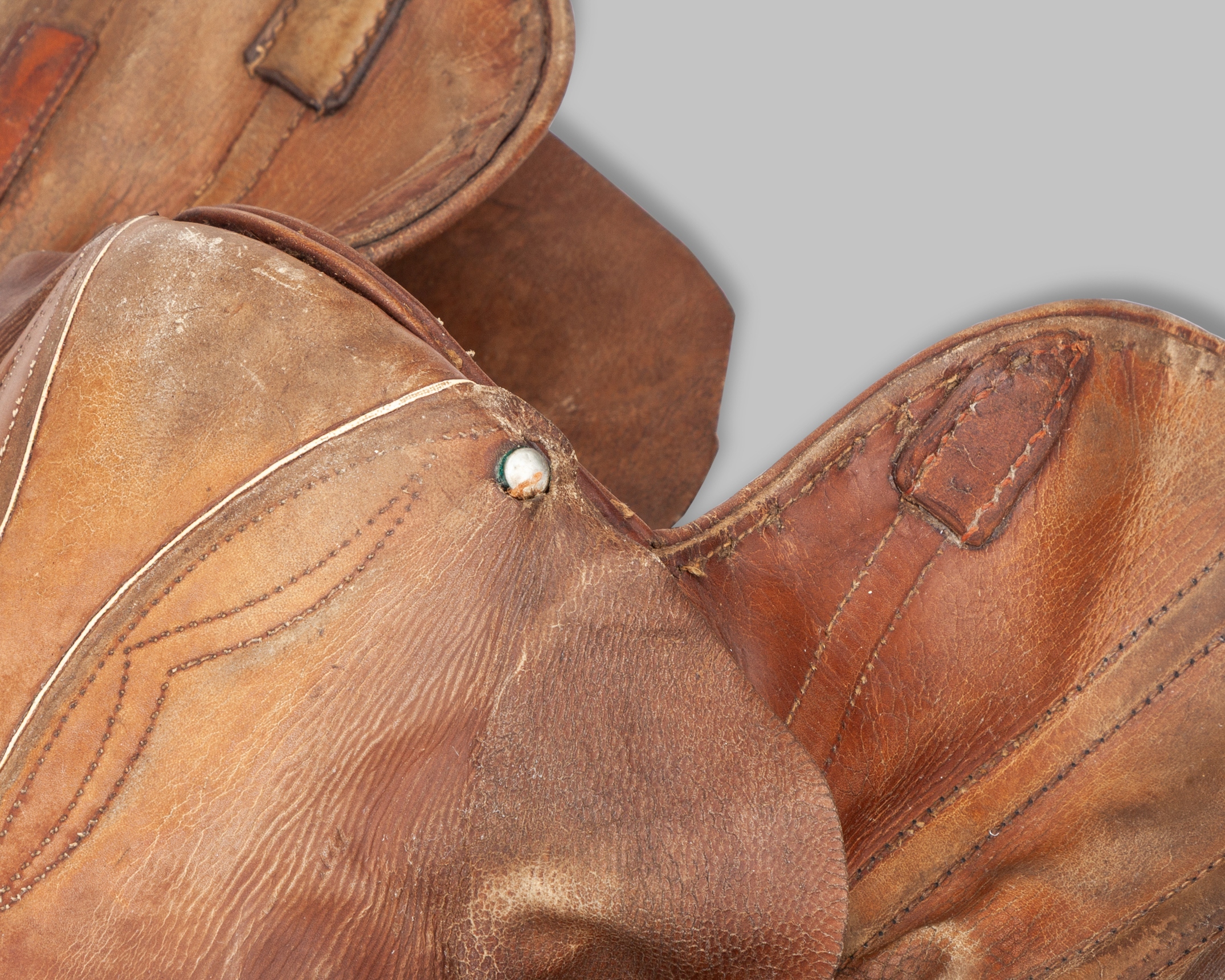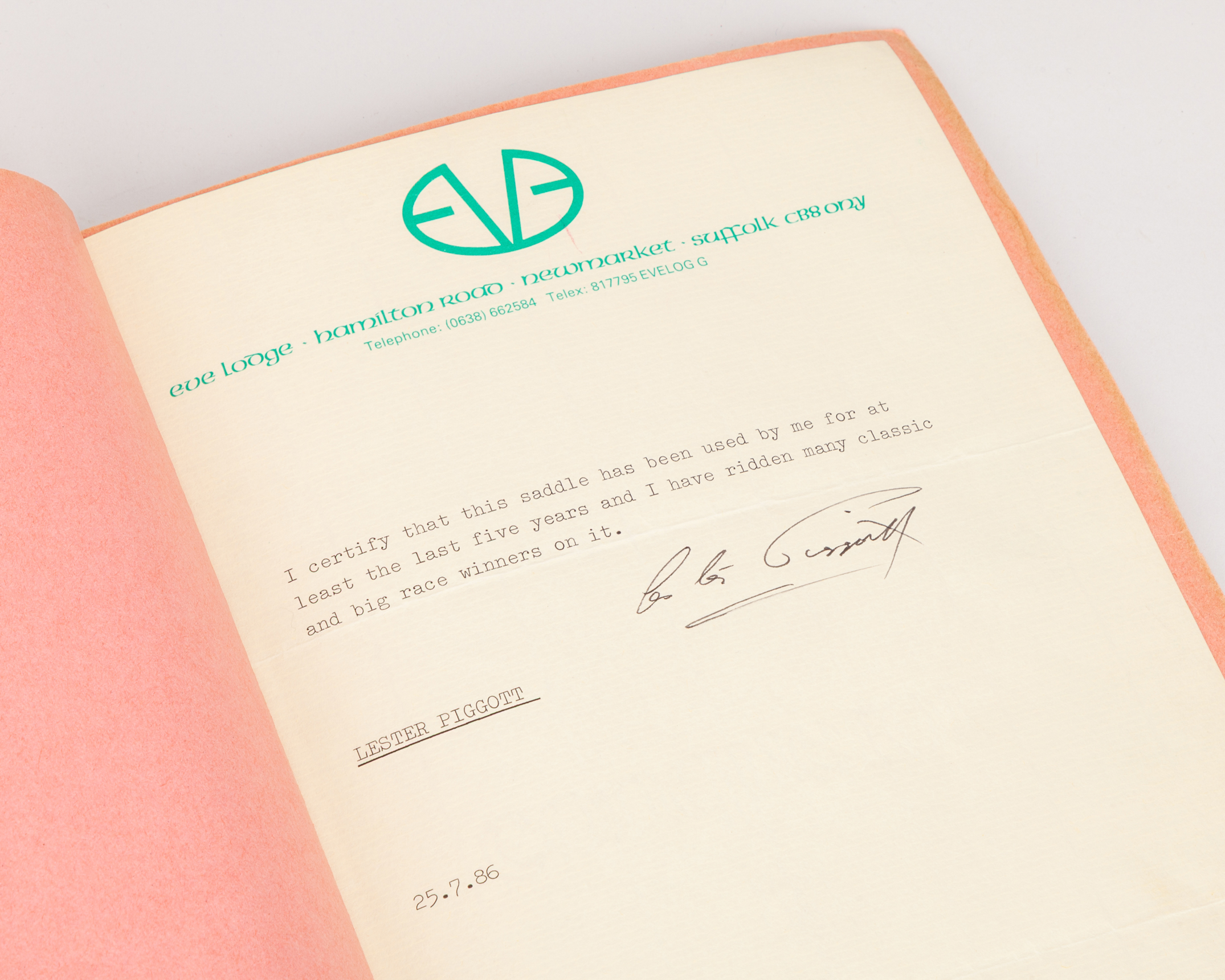 brown leather, weighing 1.1kg., the underside inititaled L.P., condition commensurate with use; sold with a signed letter of authenticity from Lester Piggott on Eve Lodge, Newmarket, headed paper and dated 25.7.86, reading “I certify that this saddle has been used by me for at least five years and I have ridden many classic and big race winners on it, Lester Piggott”