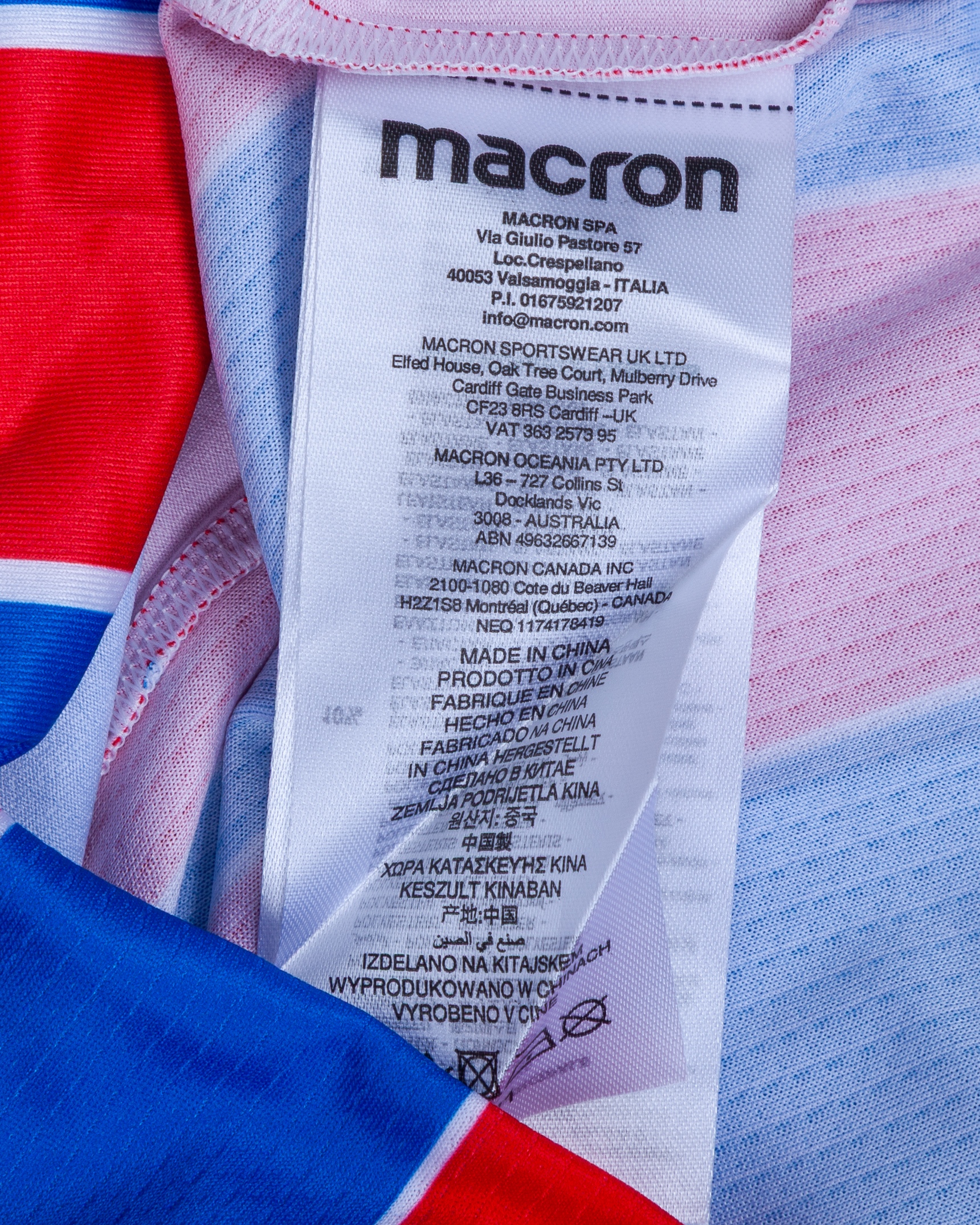 Justin Devenny red and blue No.55 Crystal Palace v. Liverpool Community Shield match issued short-sleeved shirt, played on 10th August 2025, Macron, with crew-neck collar and printed badge, with 2025 THE FA COMMUNITY SHIELD SUNDAY 10 AUGUST decal, the reverse lettered DEVENNY, the number autographed, the right sleeve with The FA Community Shield flash.