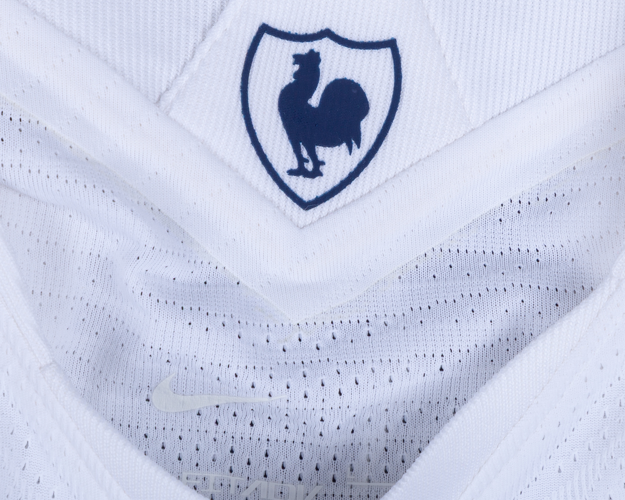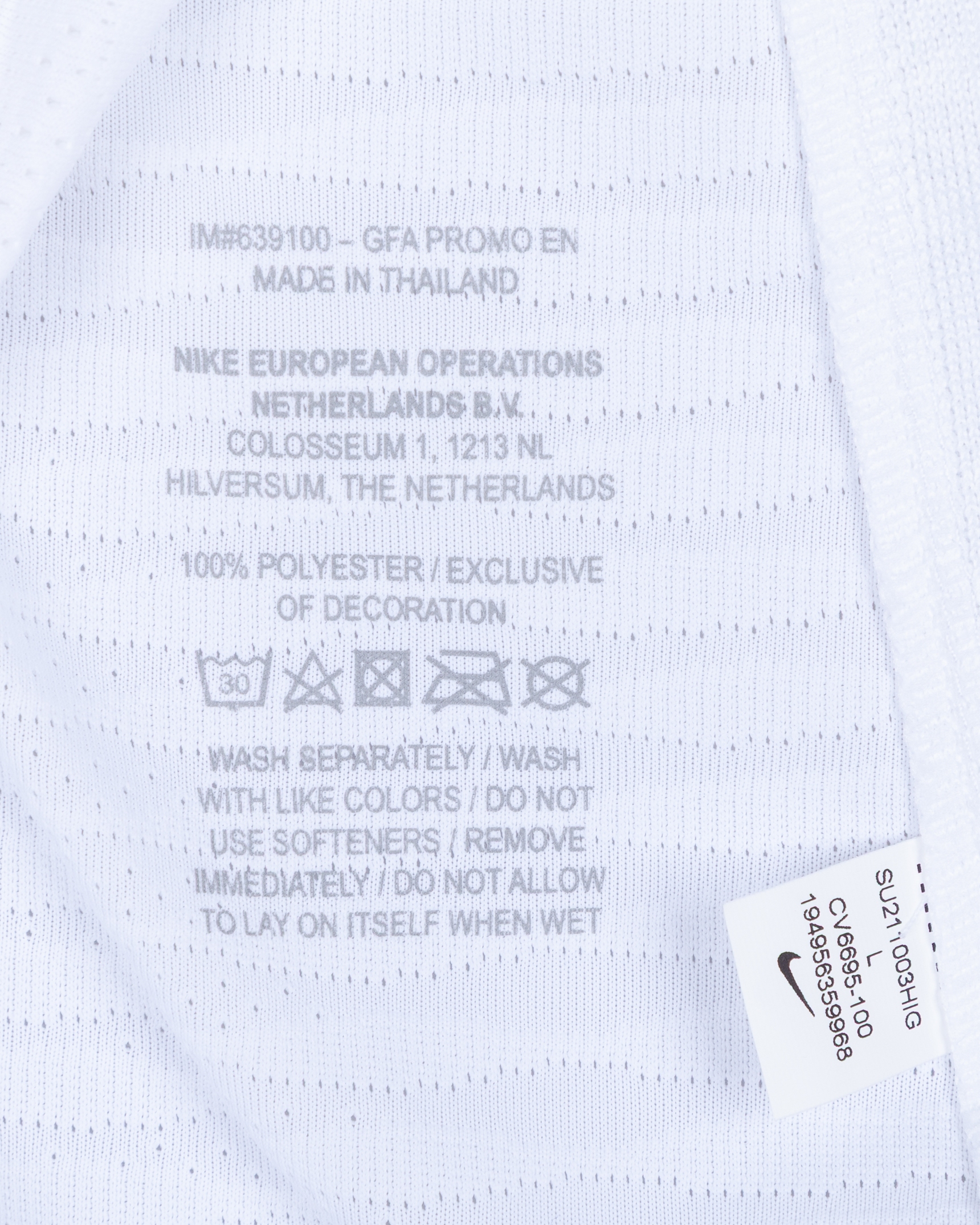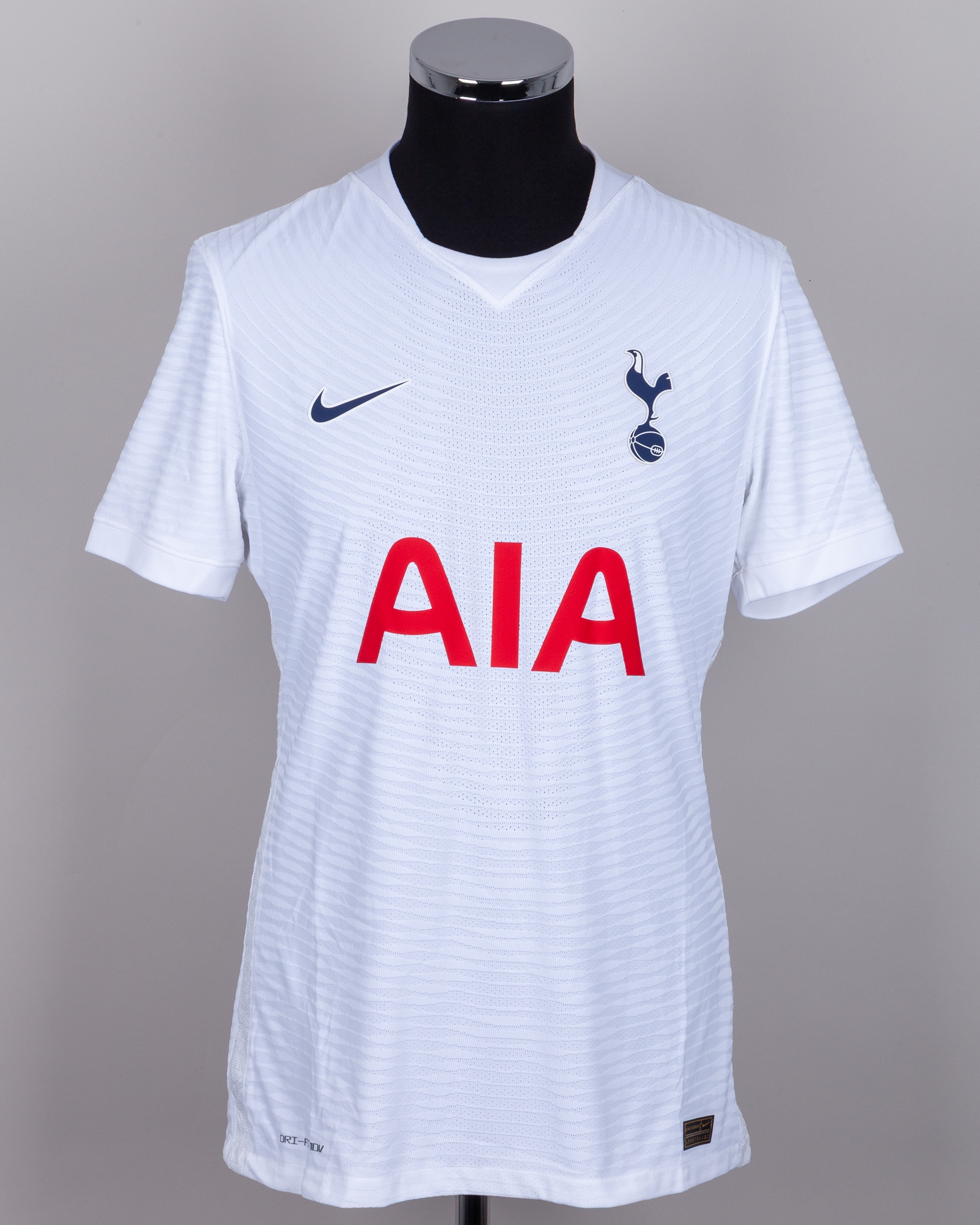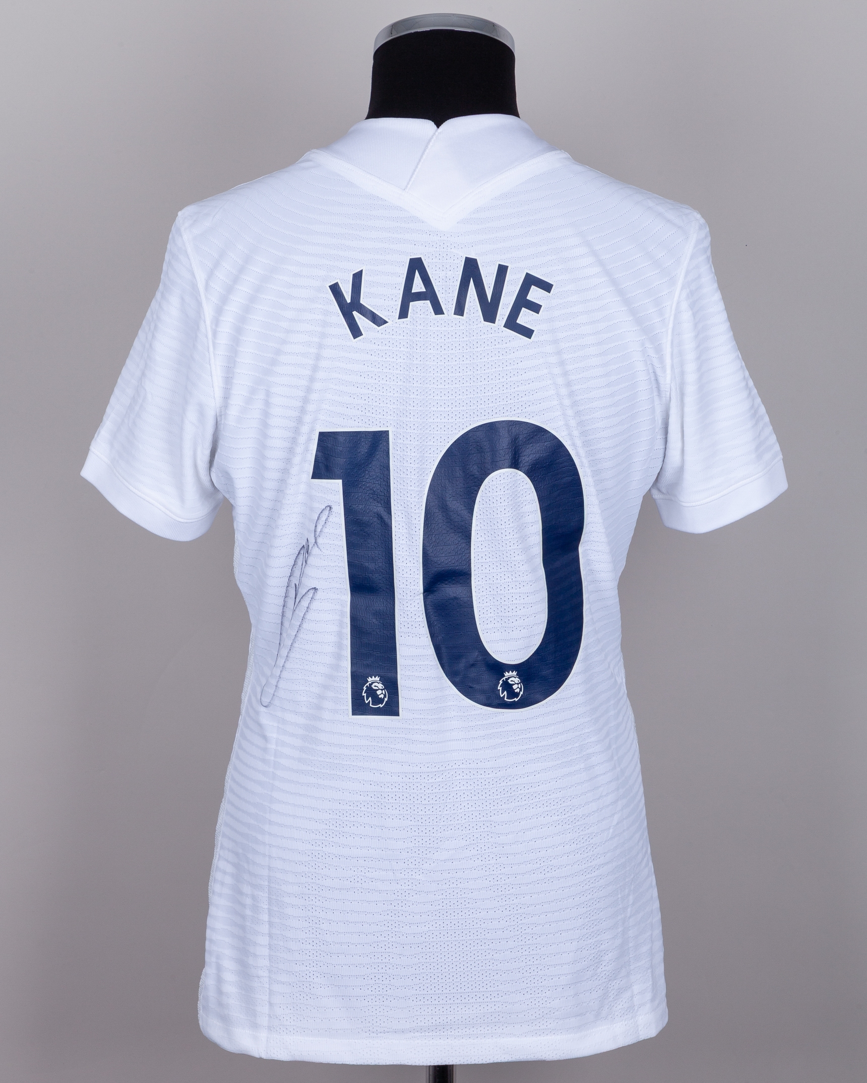 Harry Kane white and blue No.10 Tottenham Hotspur autographed short-sleeved shirt, 2021-22, Nike, L, with v-neck collar and printed badge, the reverse lettered KANE, the back of the shirt autographed