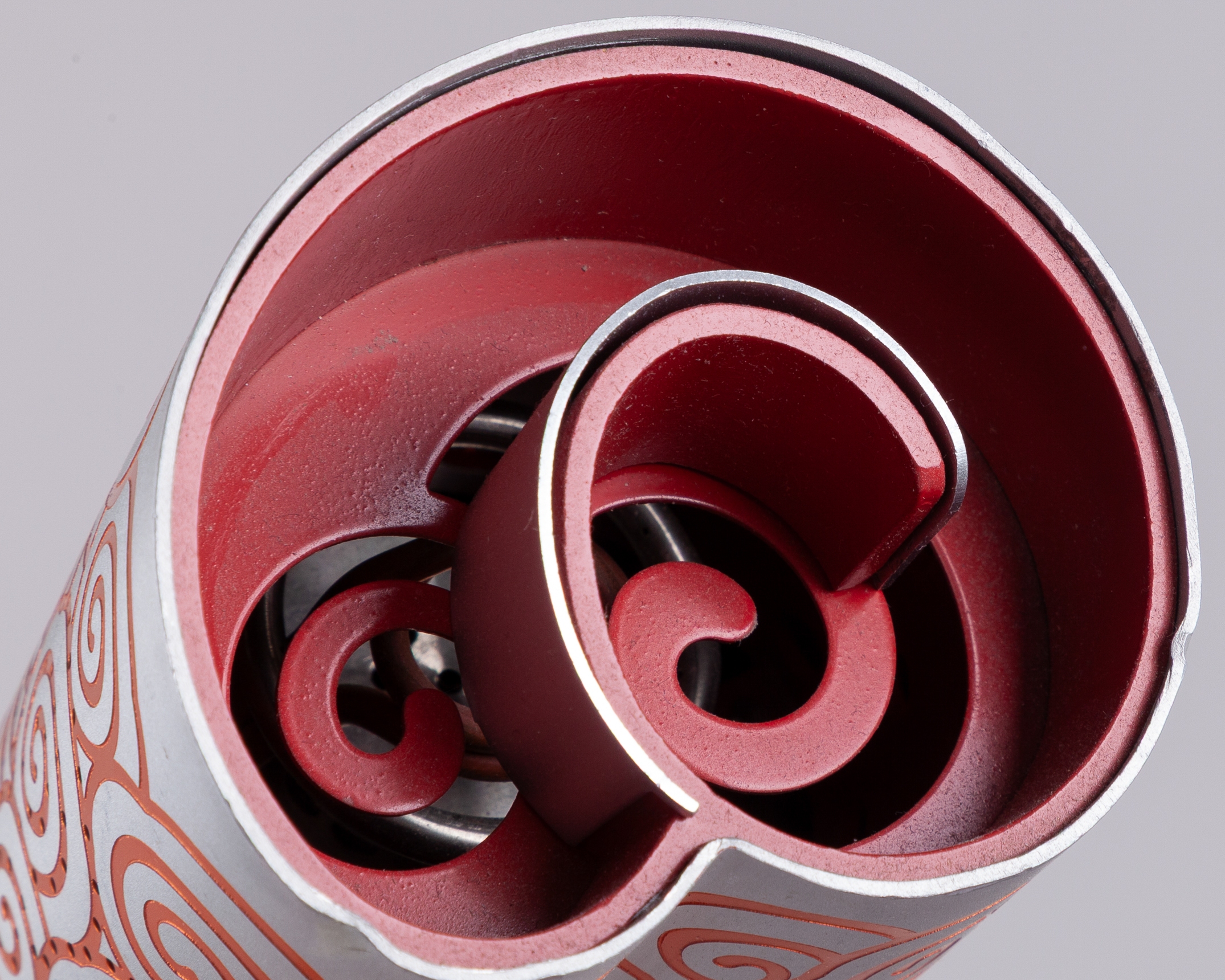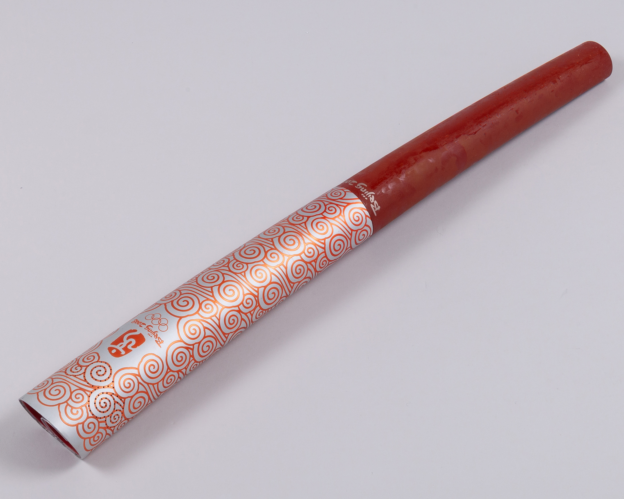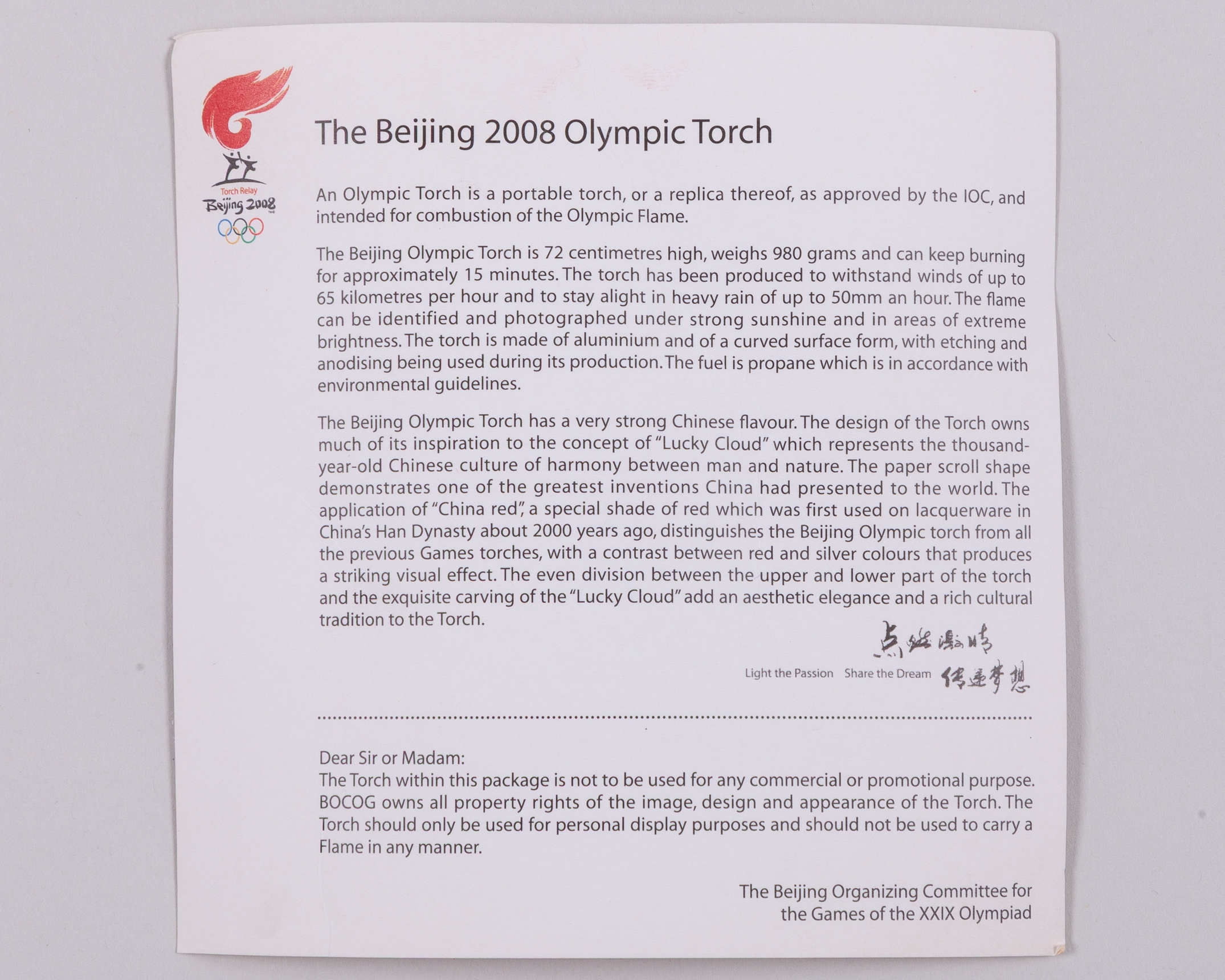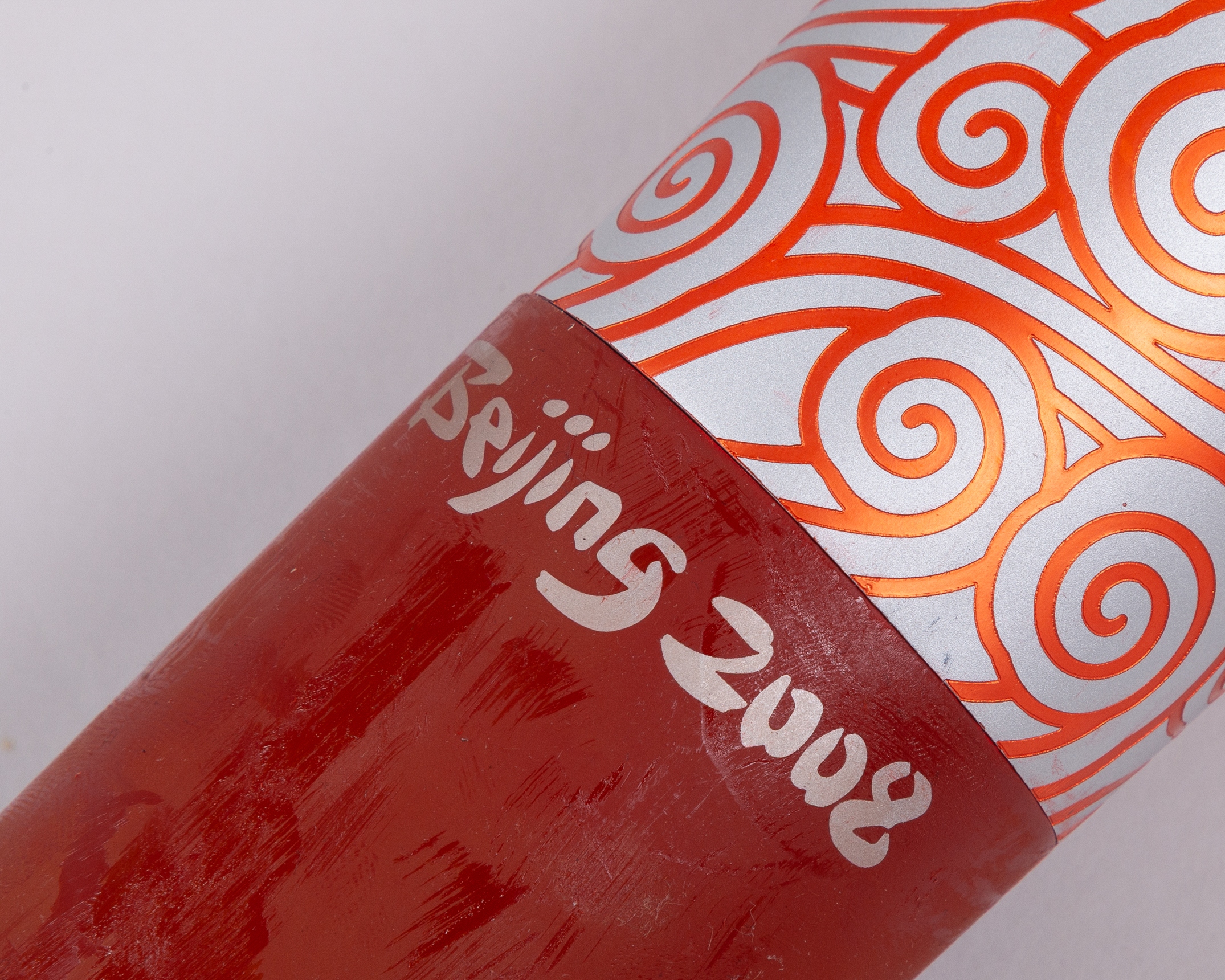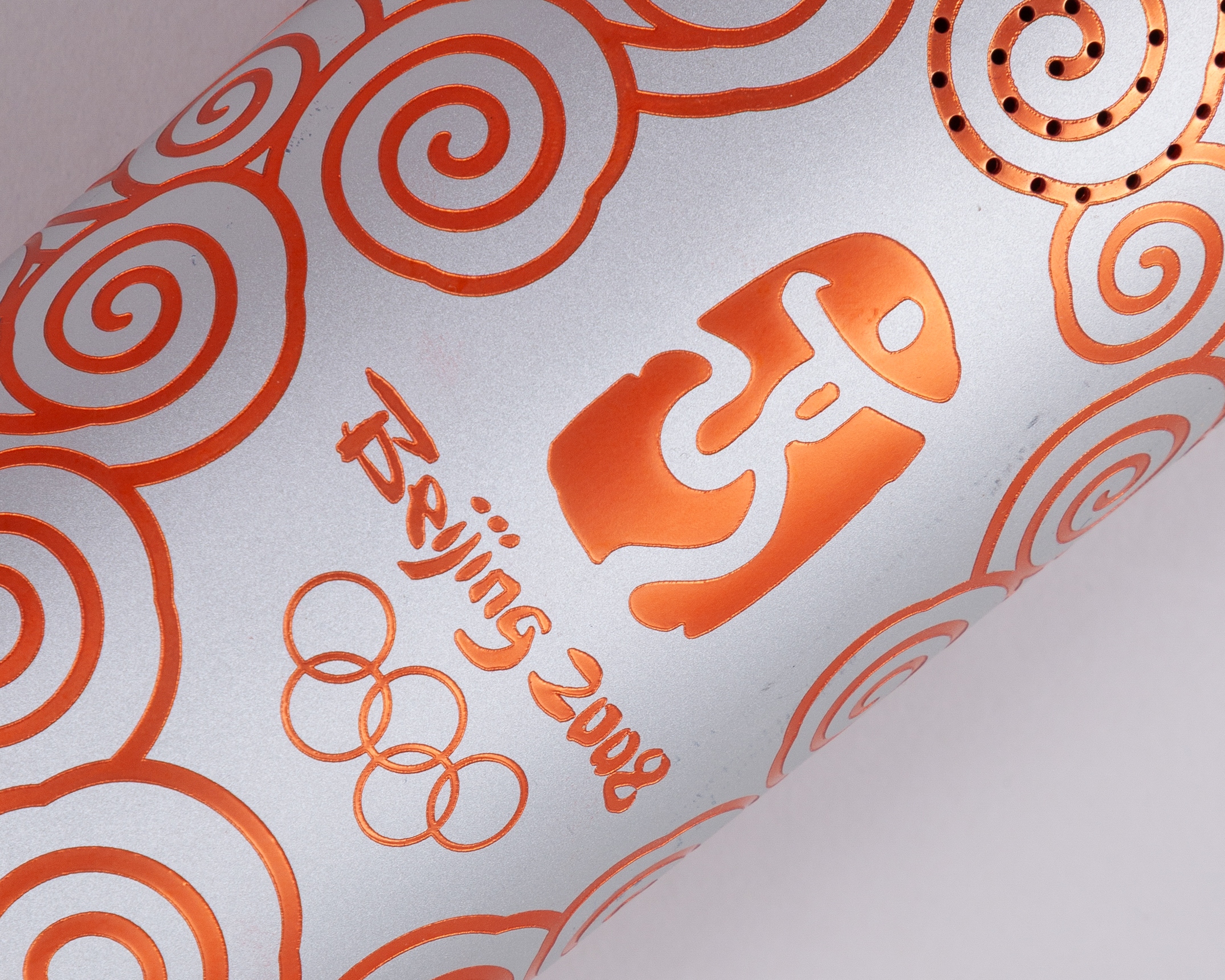 Beijing 2008 Olympic Games bearer's torch, designed by the Lenevo Group, Beijing, aluminium, the curved form with red etched and anodized 'lucky cloud' decoration, the rubberised handle design representing a paper scroll, with residue adhesive on handle , length 72cm., in original cardboard box