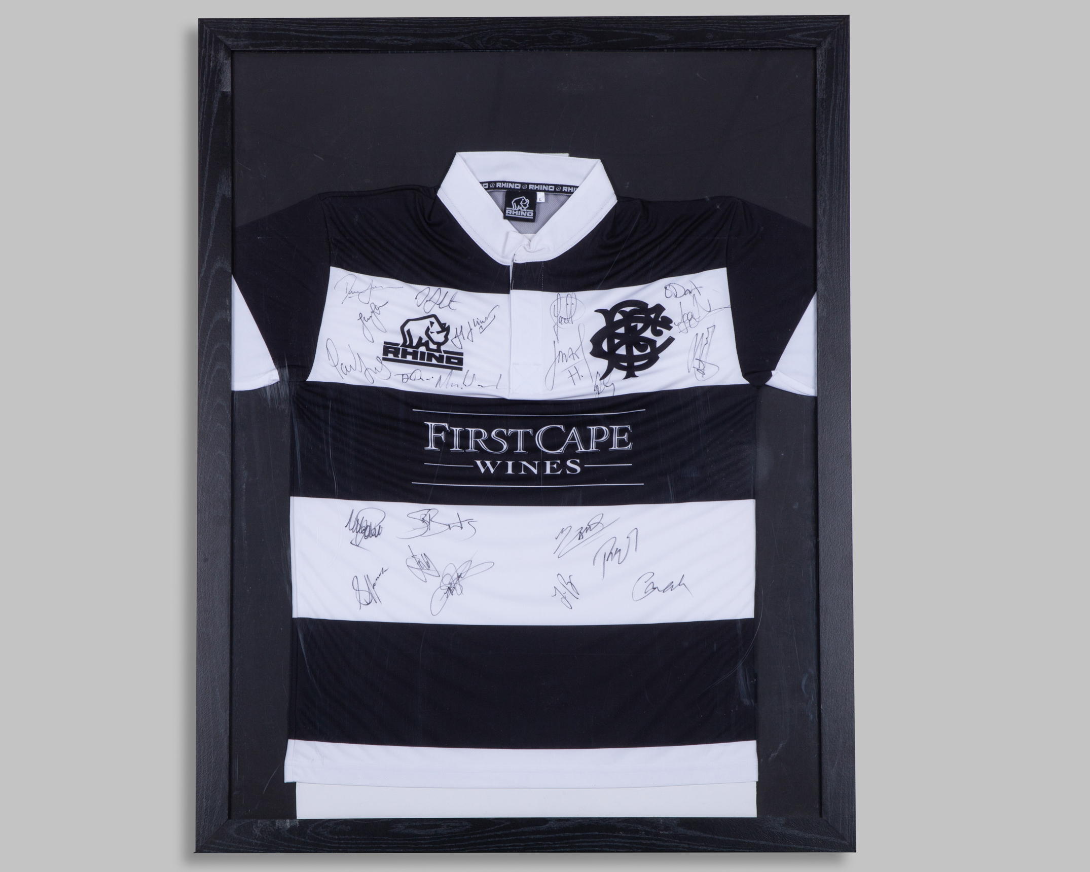 An autographed Barbarian replica shirt, the front bearing twenty-two autographs, 98 x 75cm, framed and glazed