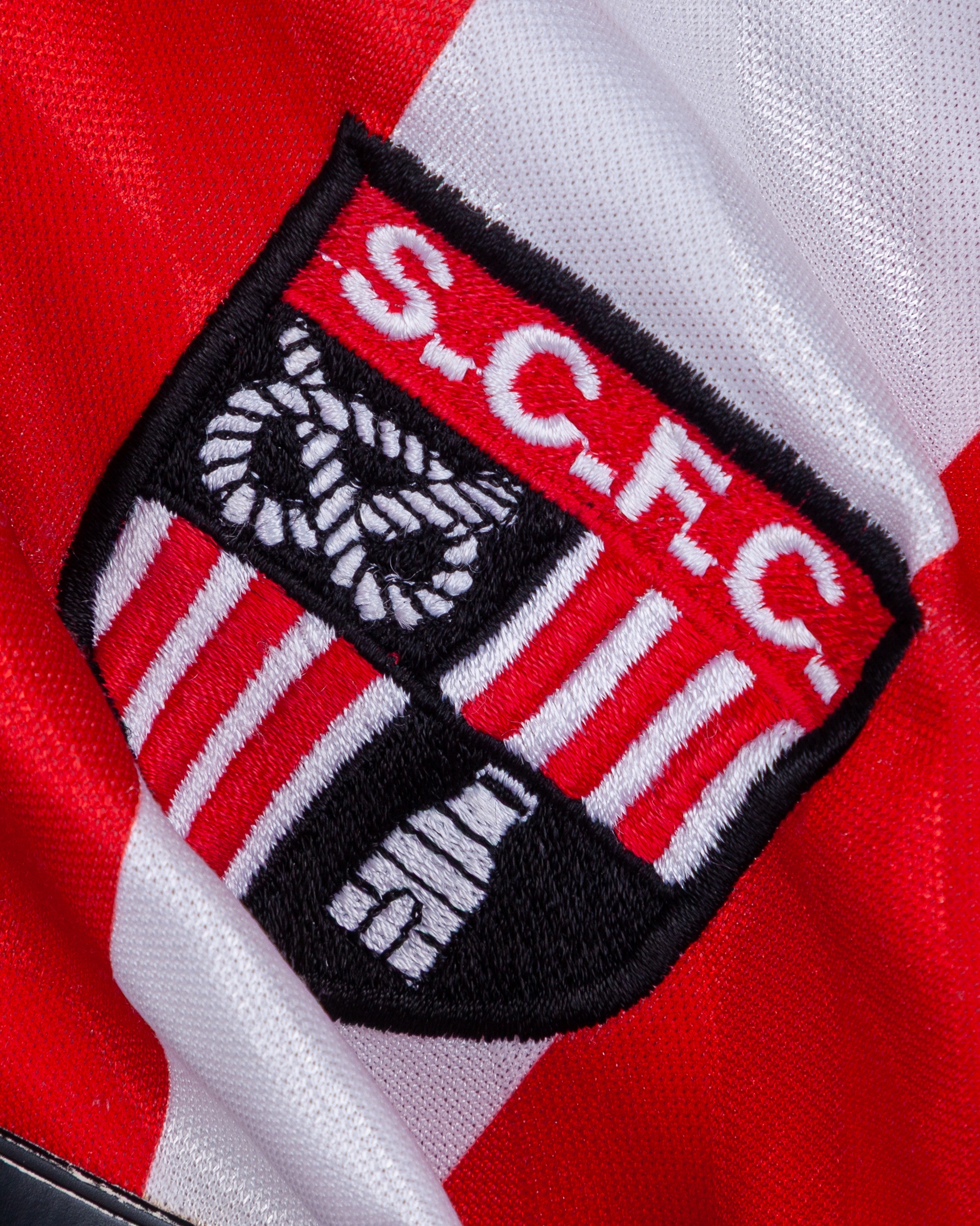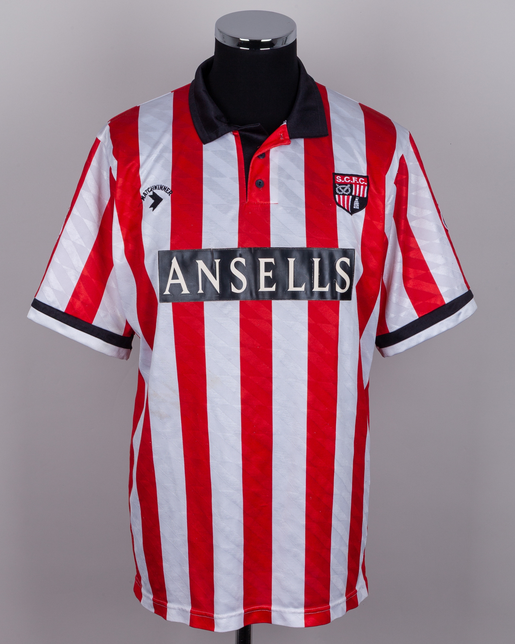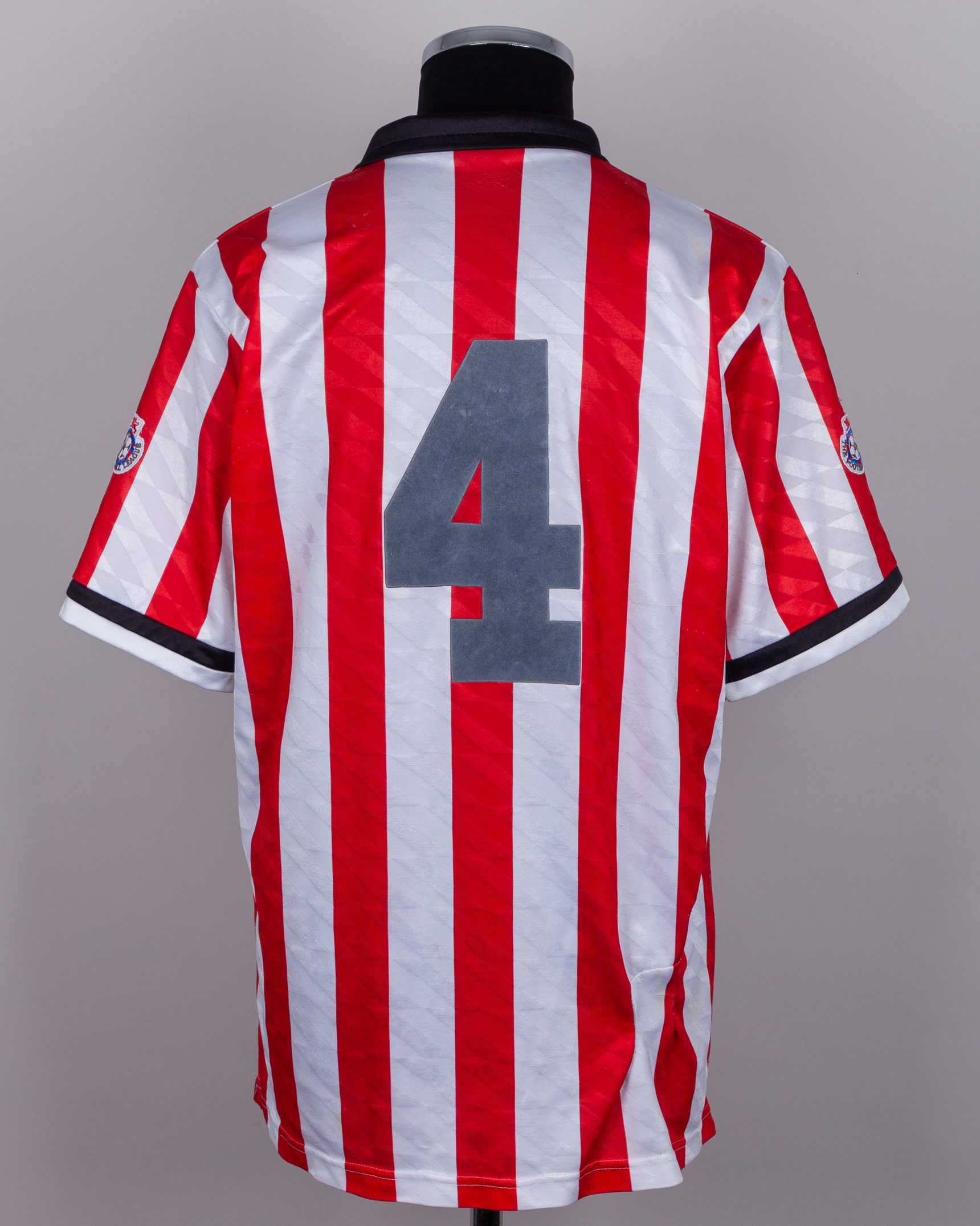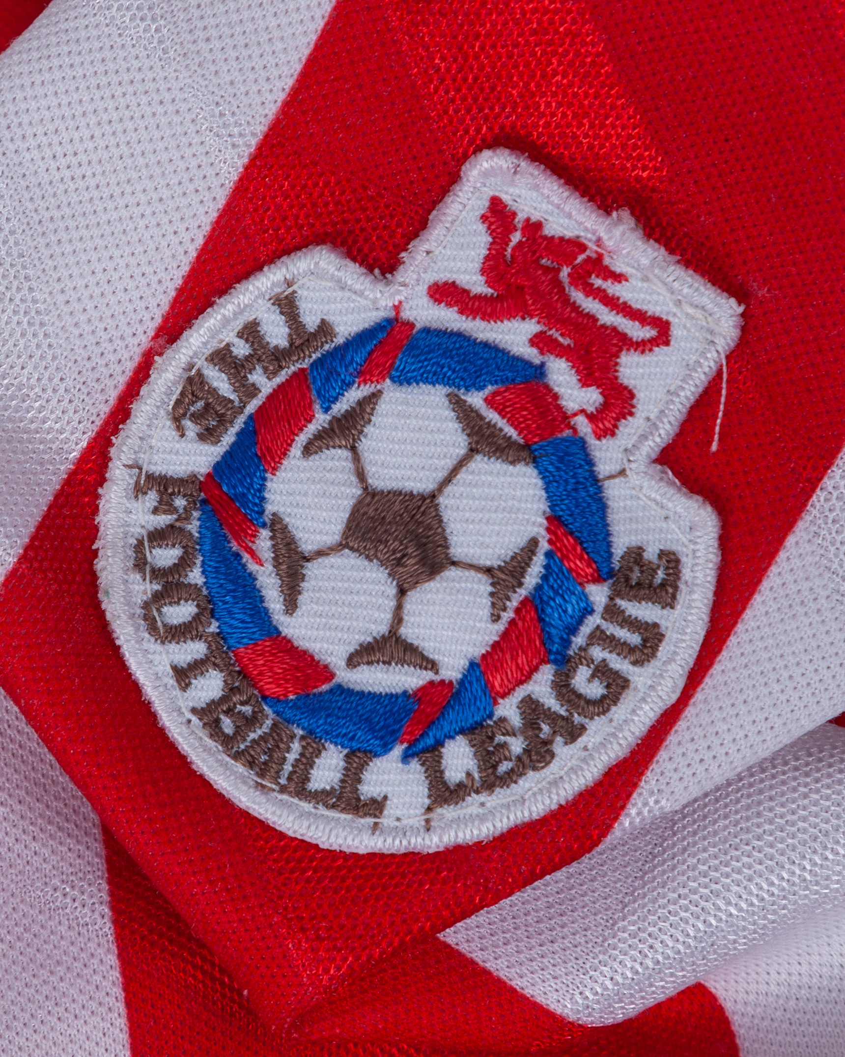 Red and white No.4 Stoke City short-sleeved shirt, 1991-92, Matchwinner, 42/44, with button-up collar and embroidered badge inscribed S.C.F.C., the sleeves with The Football League flashes, with discolouration, pulls, top button absent and a stitch repair on the back