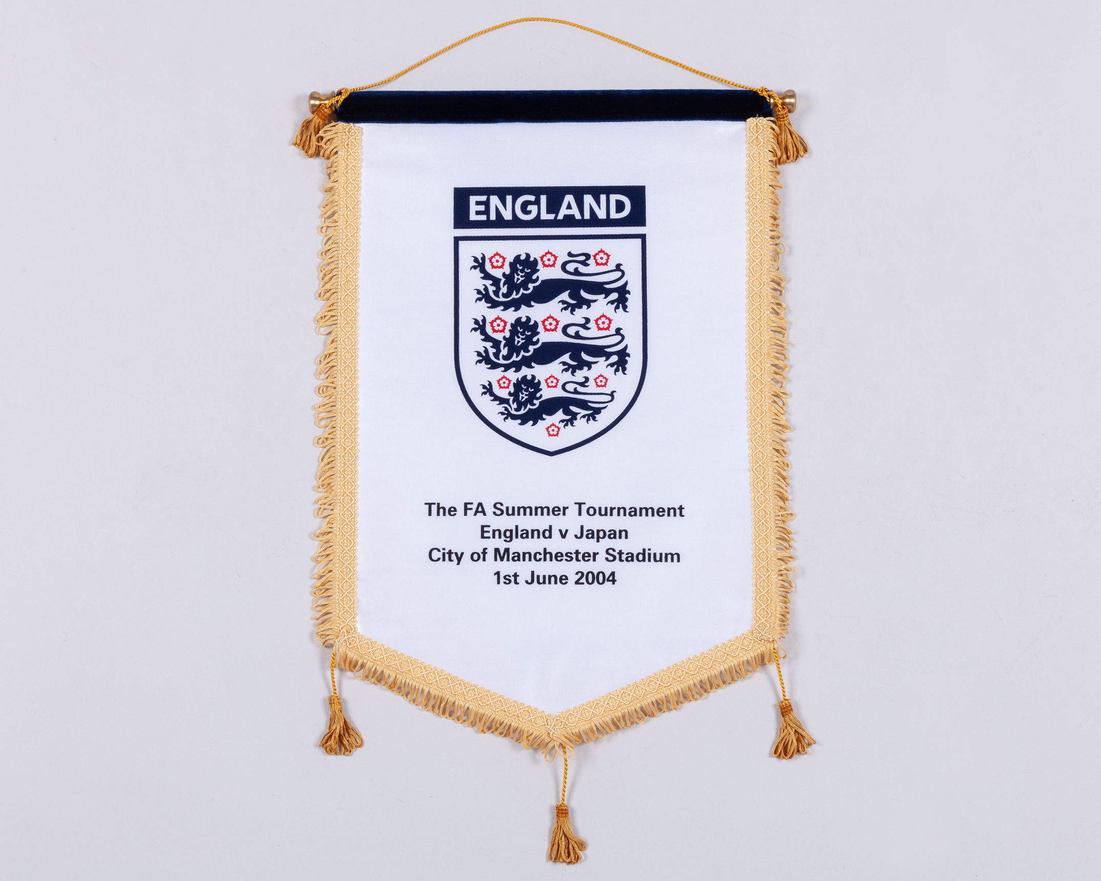 An England v. Japan pennant, 1st June 2004, match played at City of Manchester Stadium, 42 x 30cm