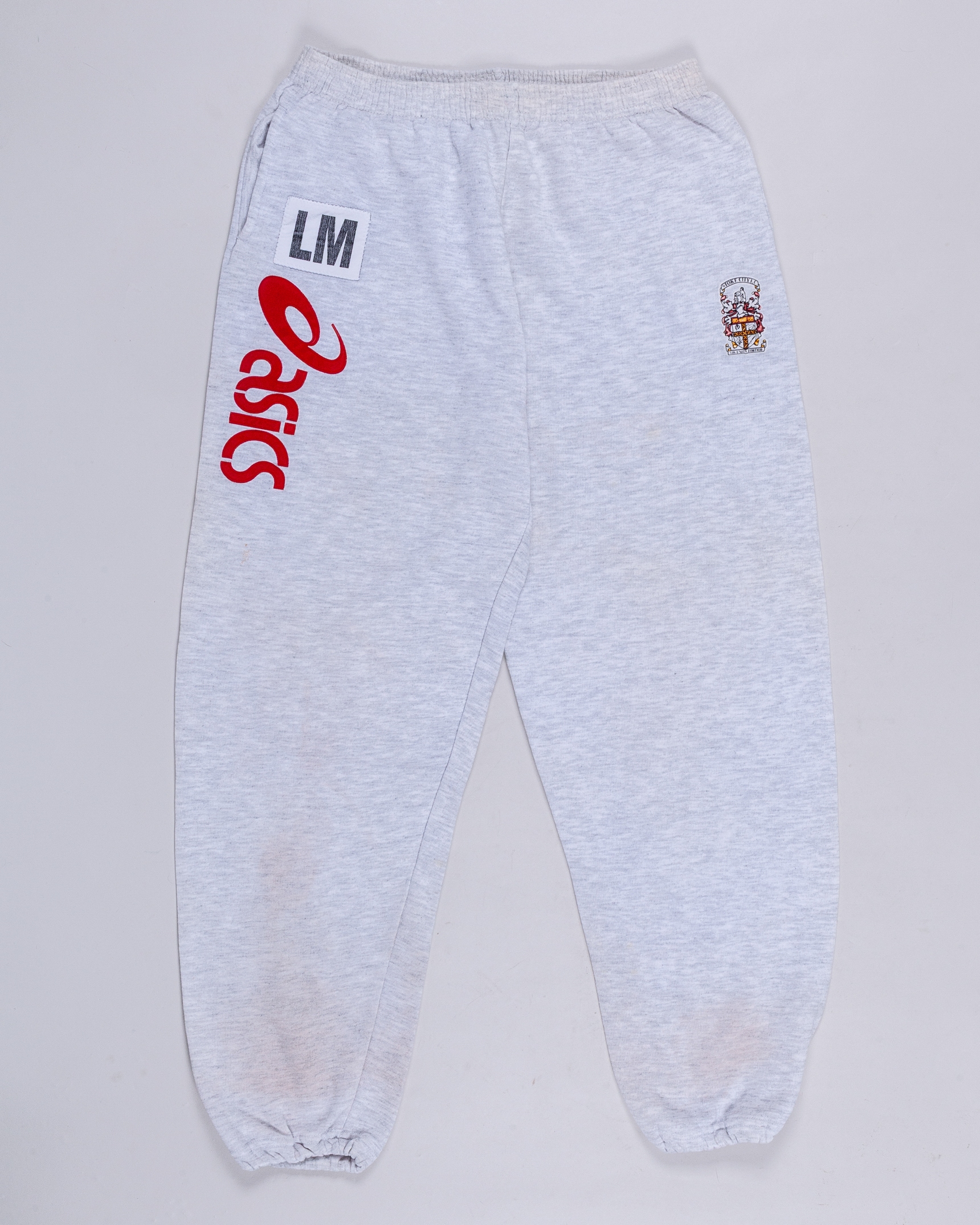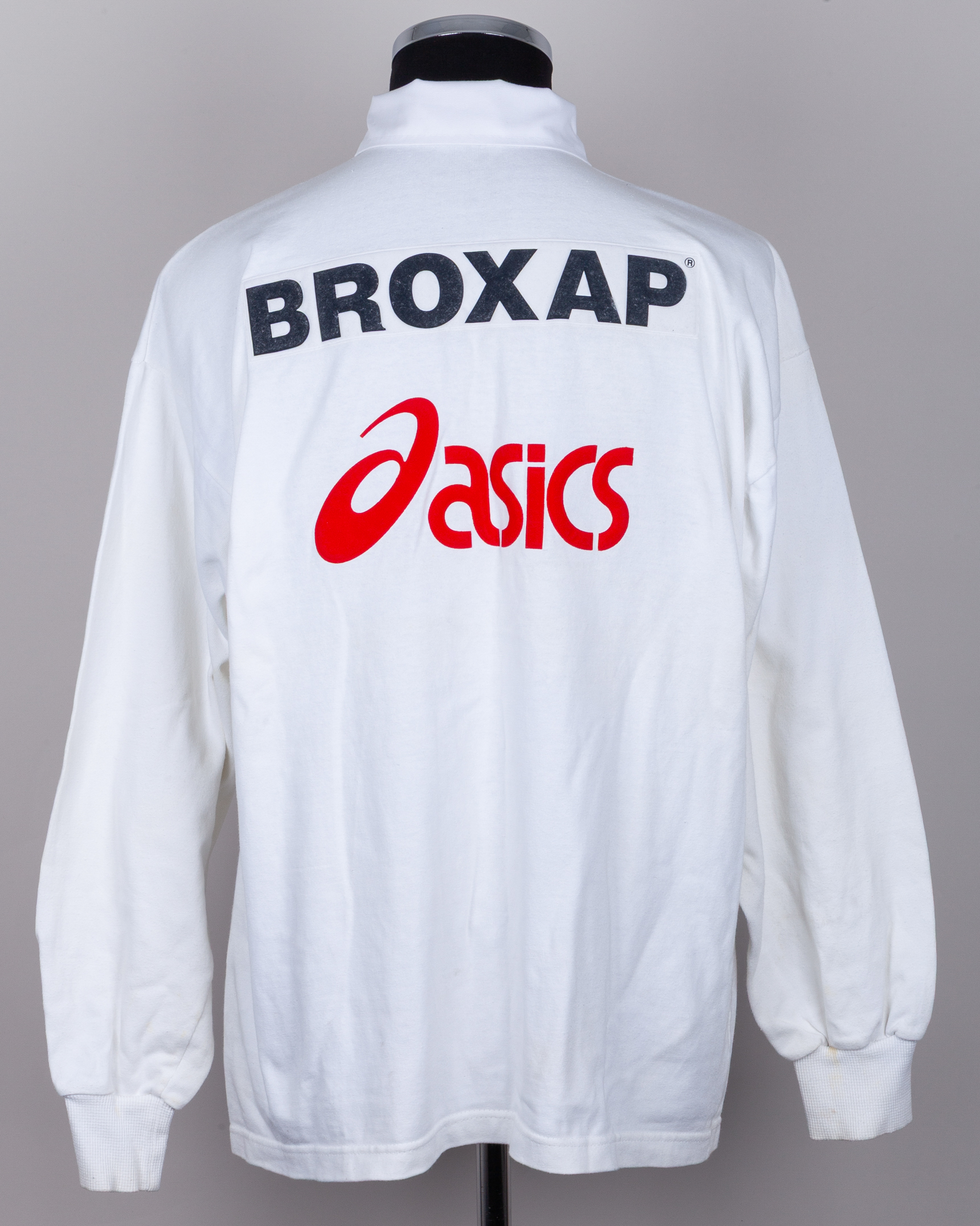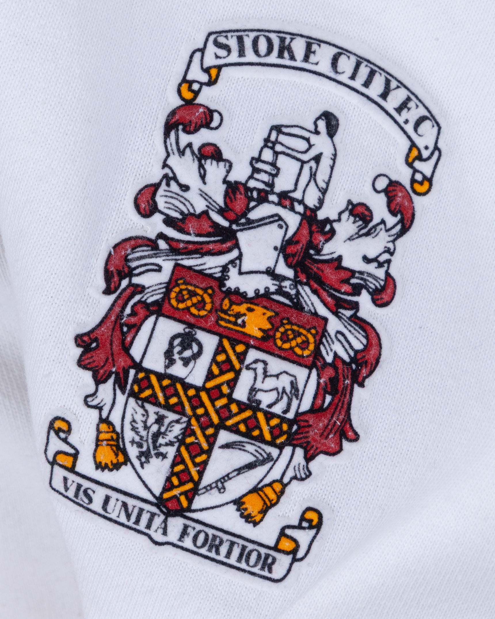 Lou Macari white Stoke City autographed long-sleeved training top, Asics, XL, with button-up collar and printed badge, with LM initialed embroidered cloth badge, autographed on the front by the Stoke City manager, with matching grey jogging bottoms, with some staining (2)