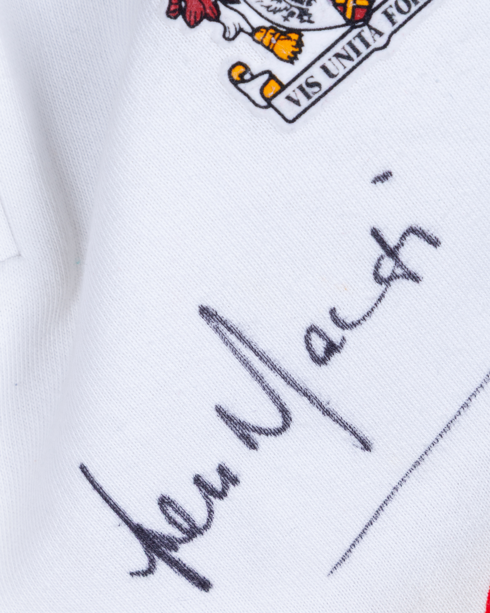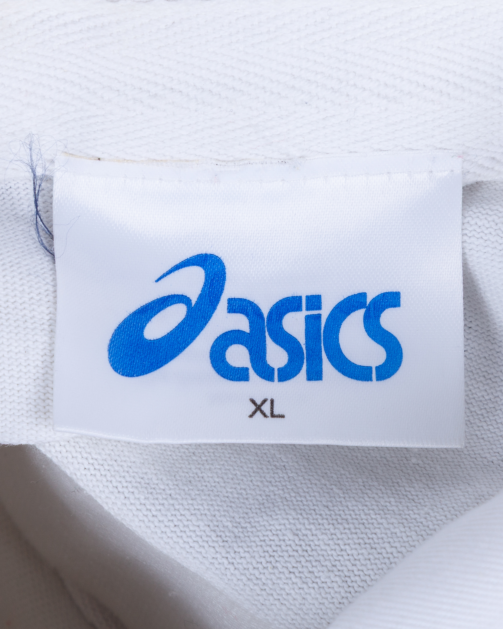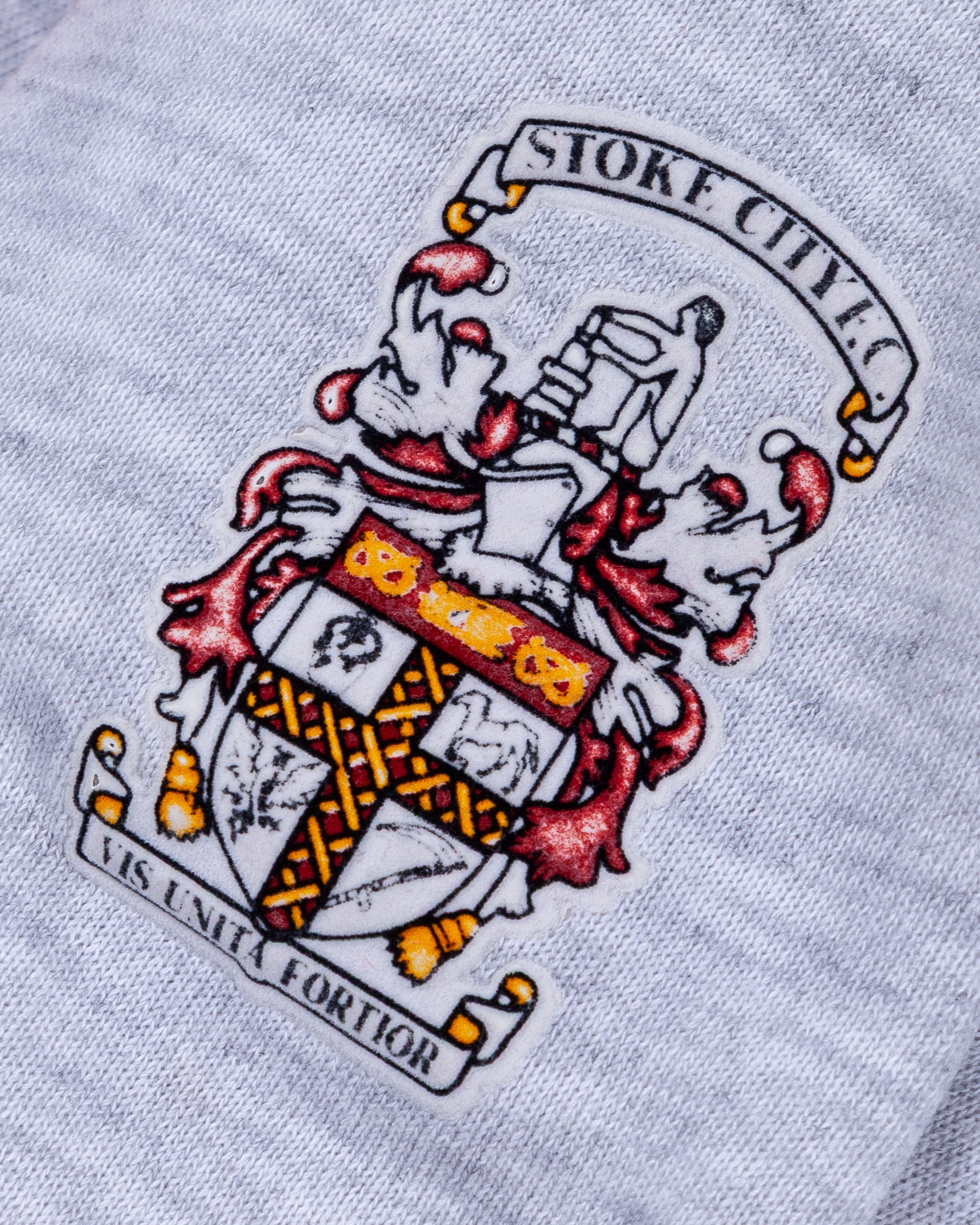 Lou Macari white Stoke City autographed long-sleeved training top, Asics, XL, with button-up collar and printed badge, with LM initialed embroidered cloth badge, autographed on the front by the Stoke City manager, with matching grey jogging bottoms, with some staining (2)