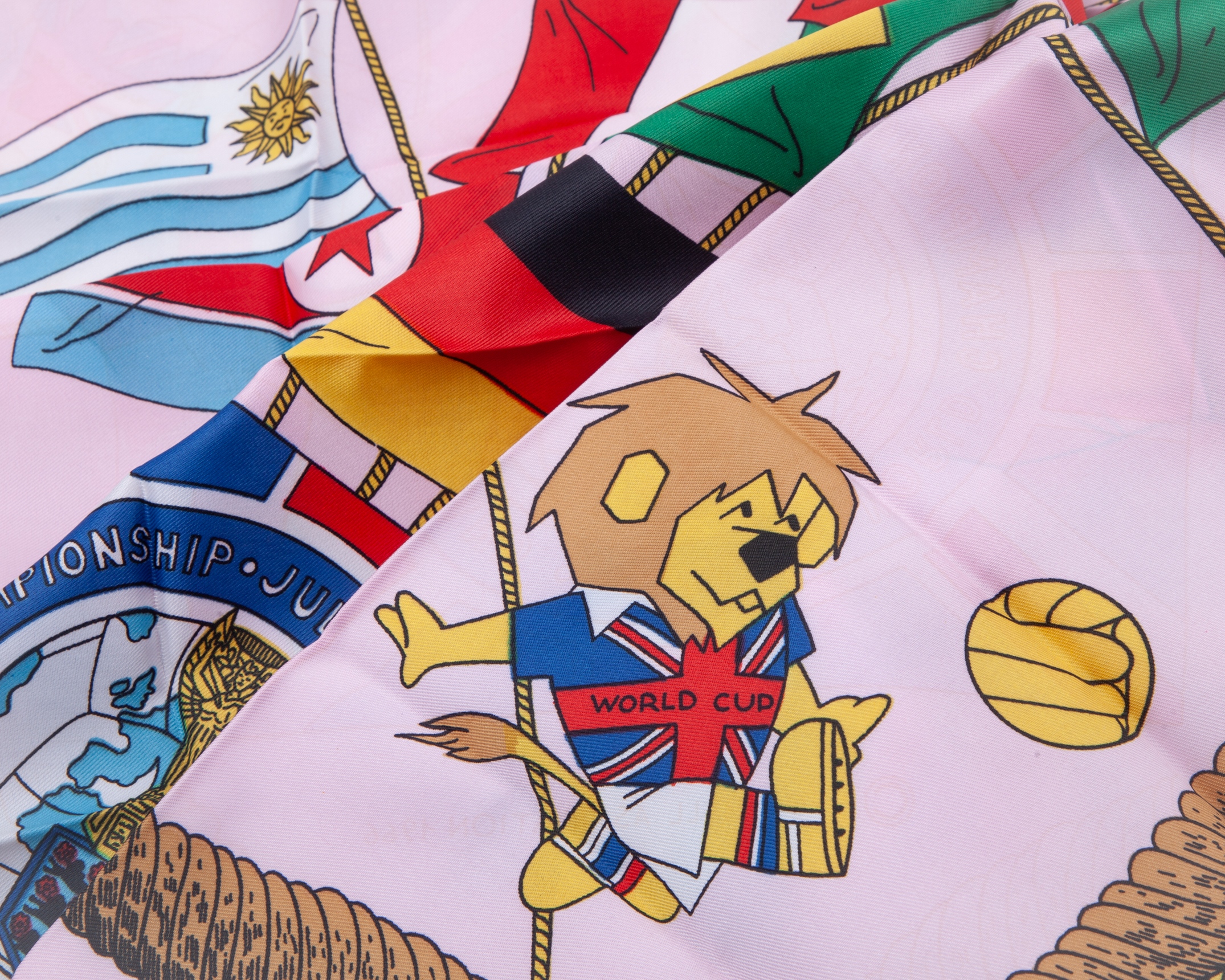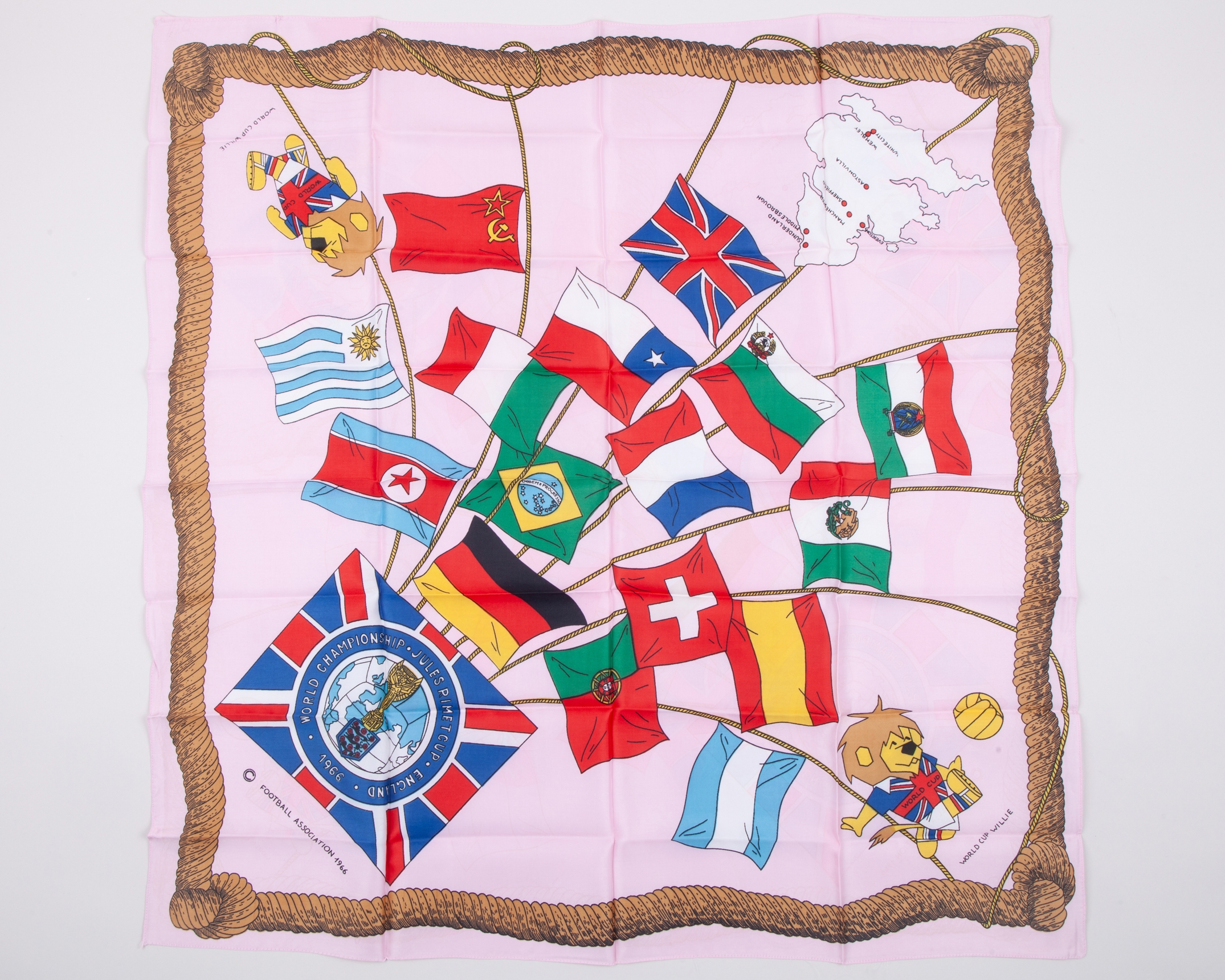 Football Association 1996 pink World Cup scarf, featuring the competing nations flags, World Cup Willie, map of host cities and the 1966 World Cup logo, approximately 68cm square