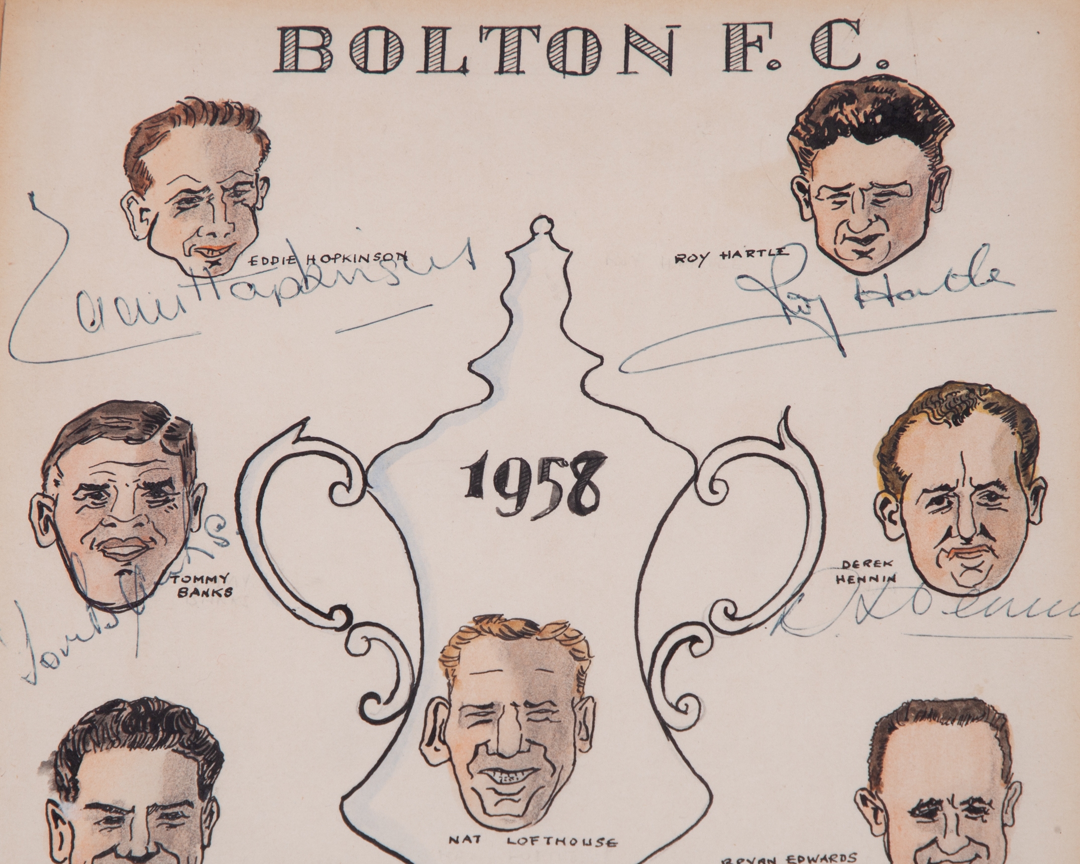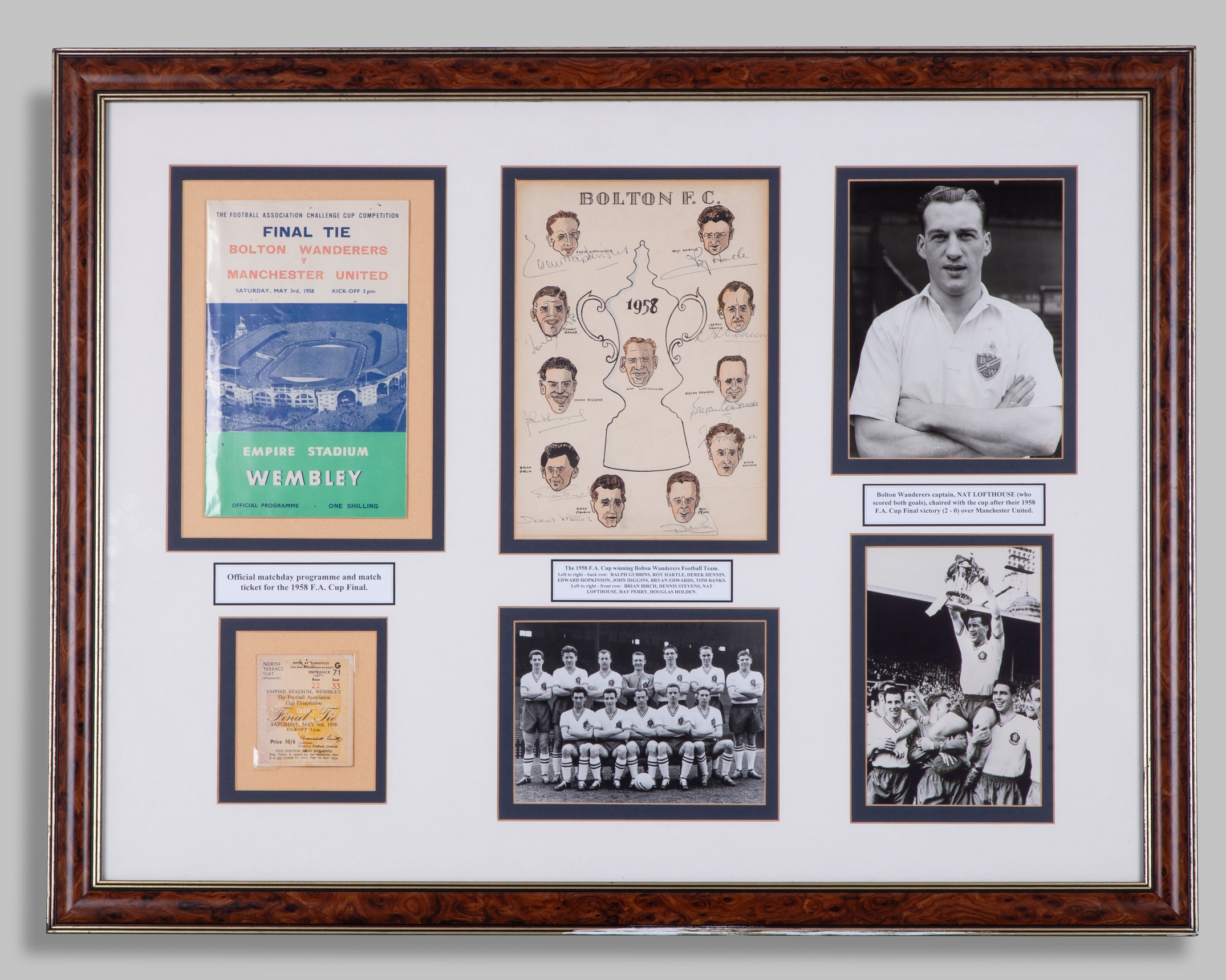 Bolton Wanderers F.C. 1958 F.A.Cup-winners: a display comprising: a sheet of cream paper bearing colour caricature portrait busts and autographs of the eleven Bolton Wanderers players; a match programme and ticket stub; and three black and white press photographs, in common mount, 65 x 84cm, framed and glazed