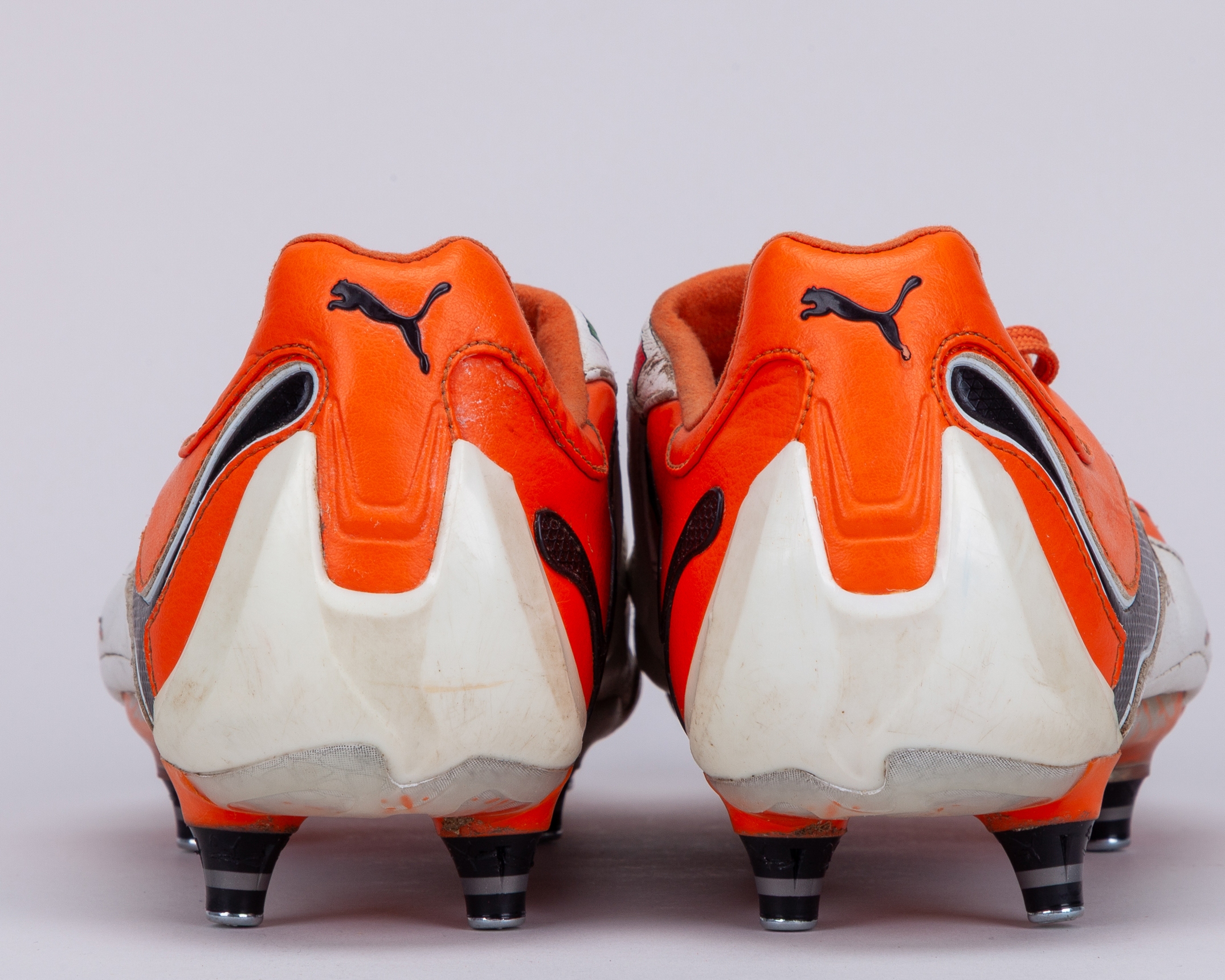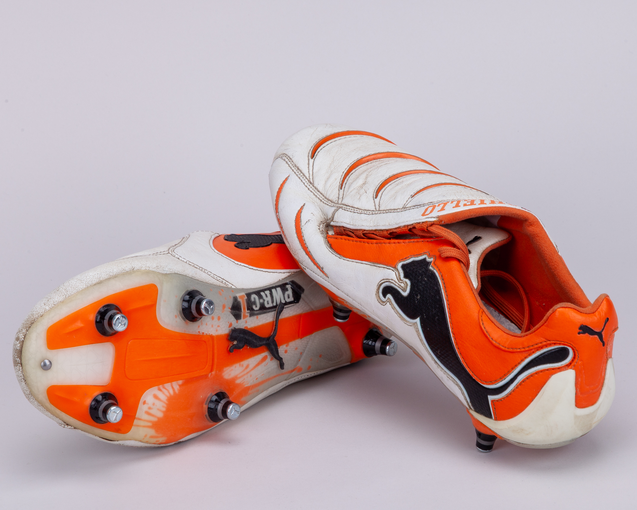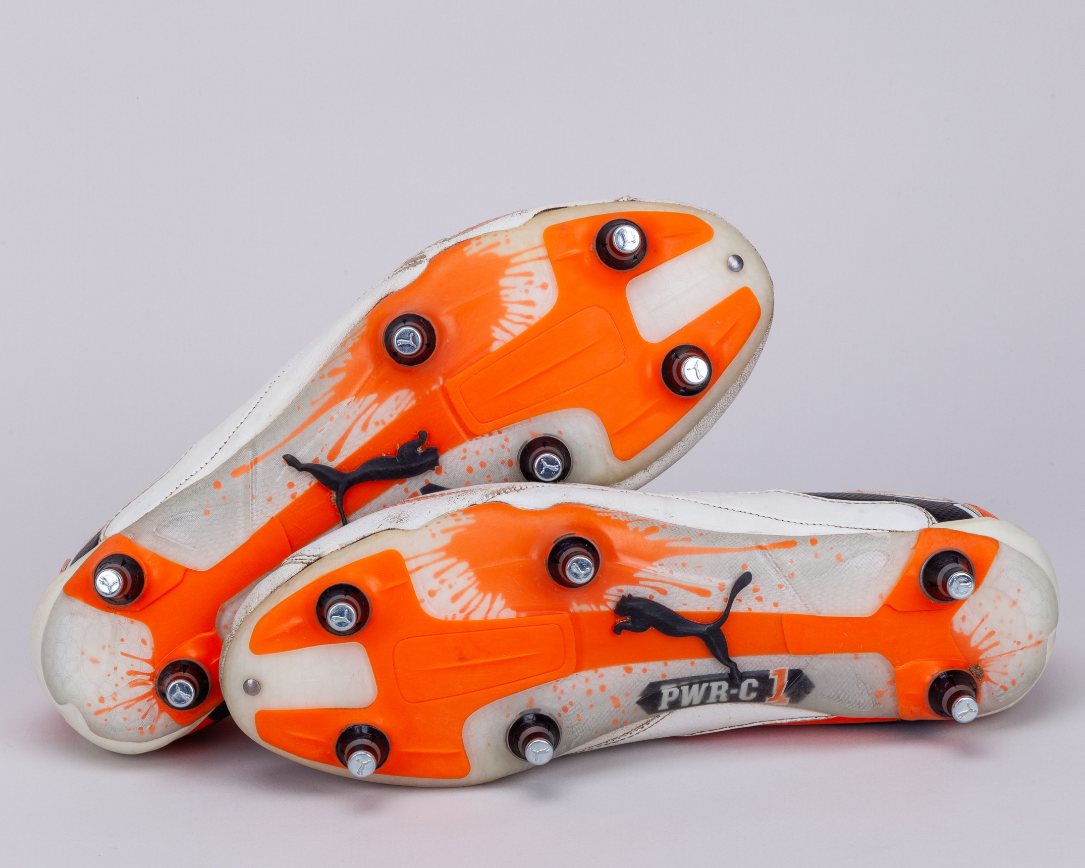 Pair of white and orange PWR-C1 football boots, Puma, size 9.5, with CHIELLO decal, in used condition