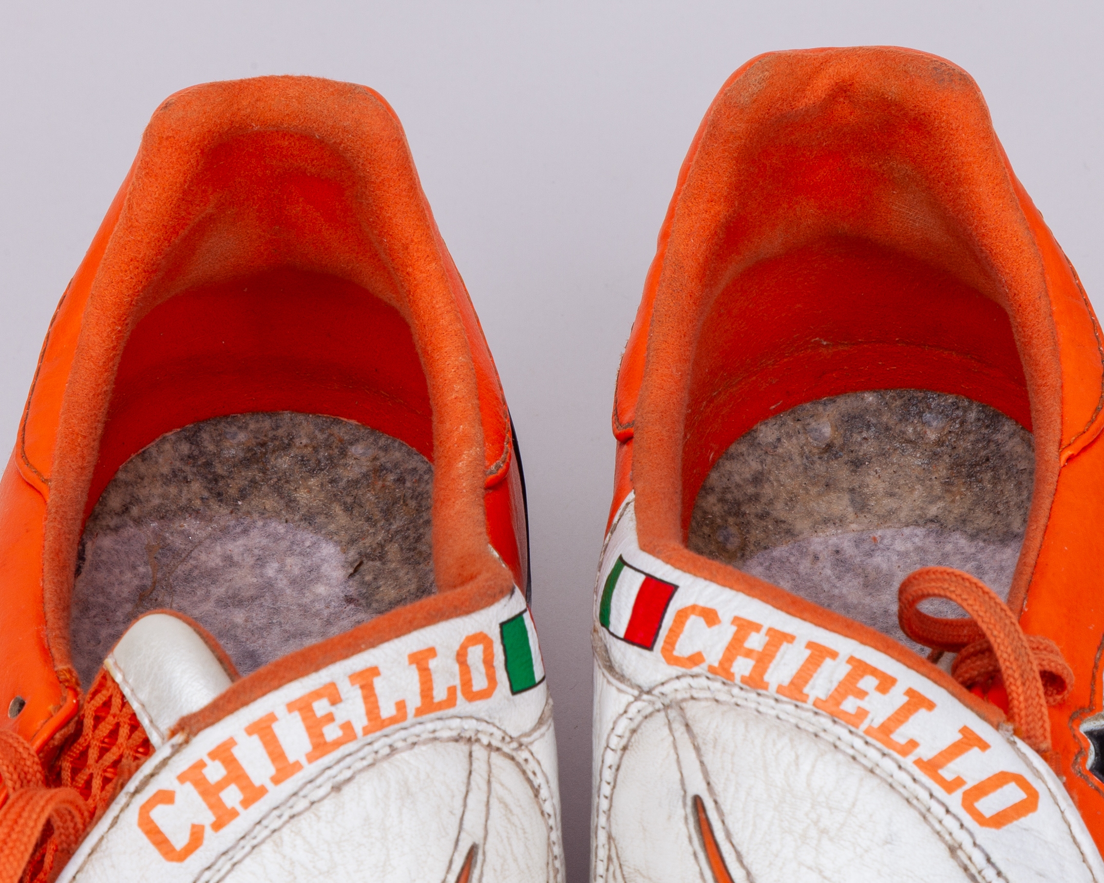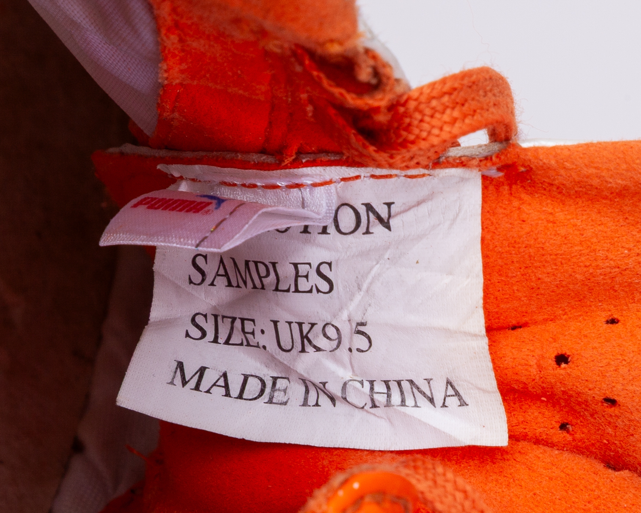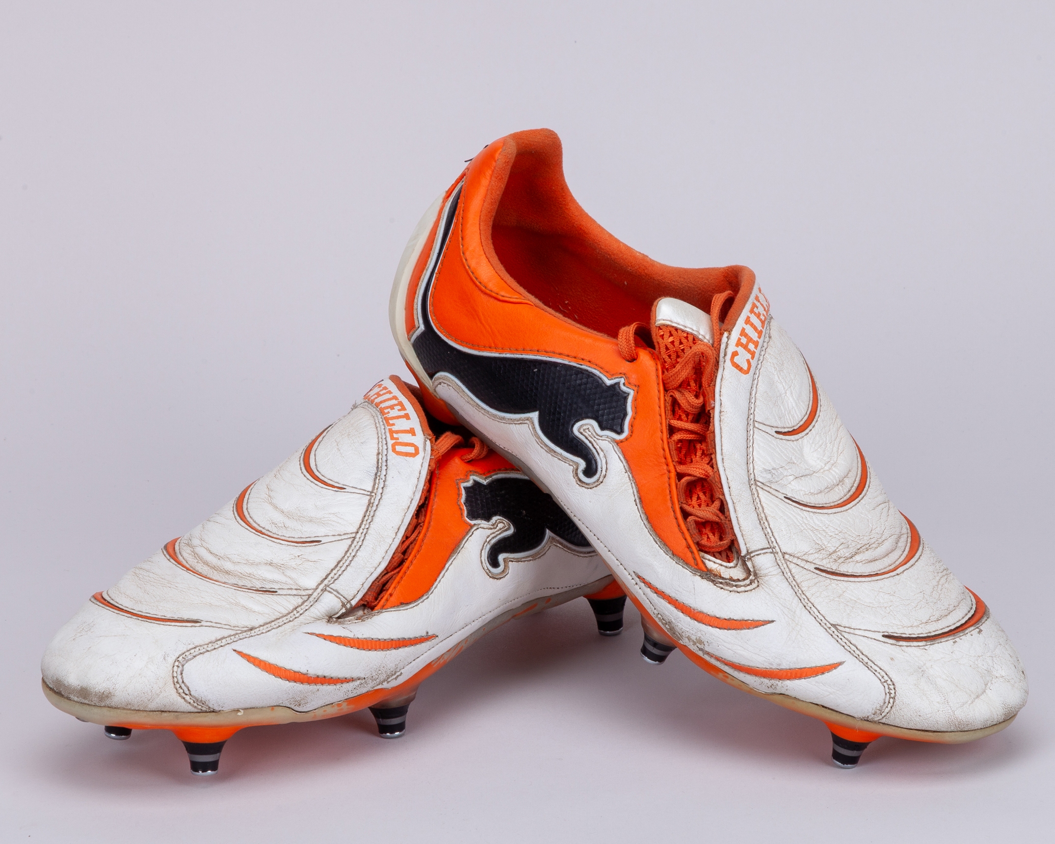 Pair of white and orange PWR-C1 football boots, Puma, size 9.5, with CHIELLO decal, in used condition