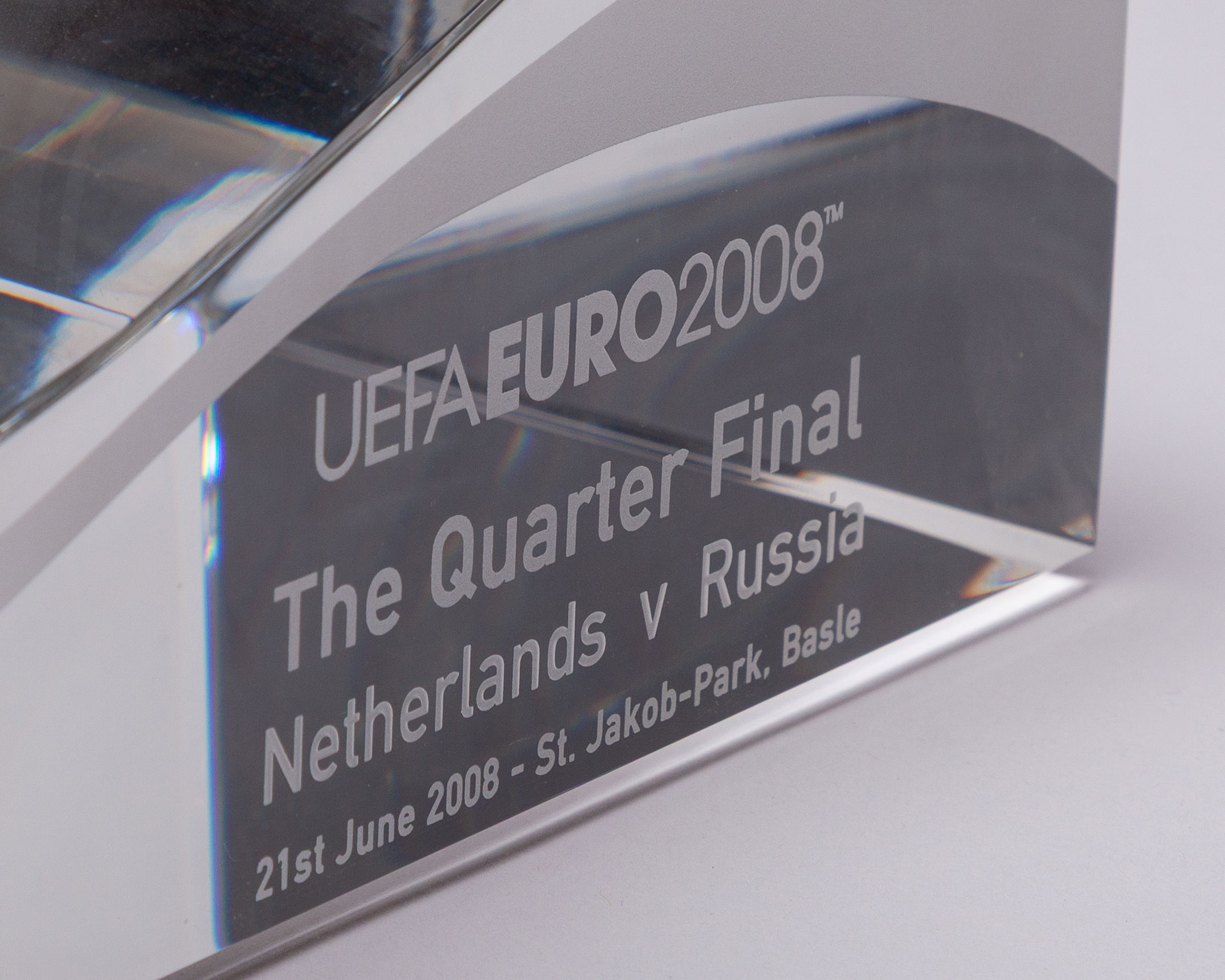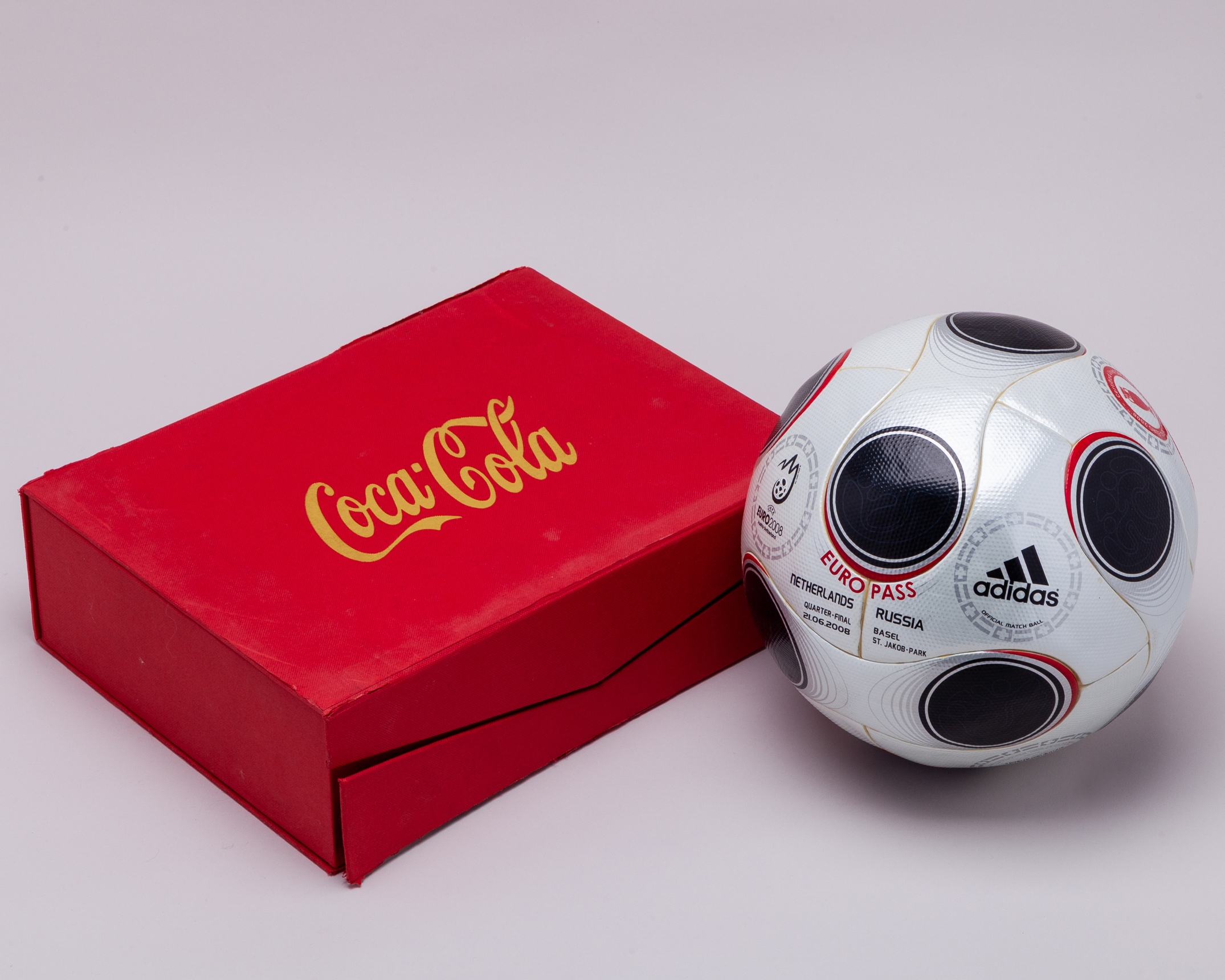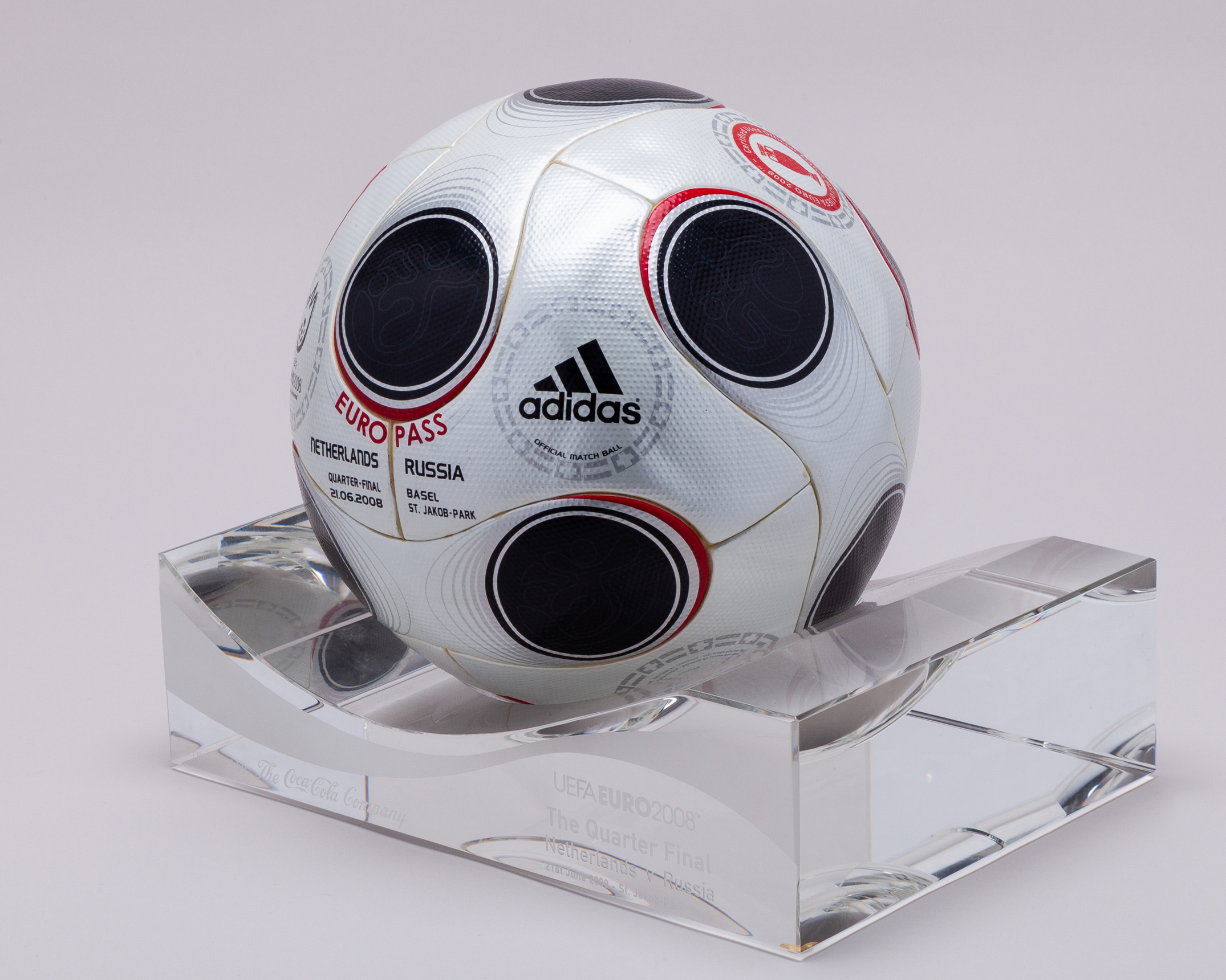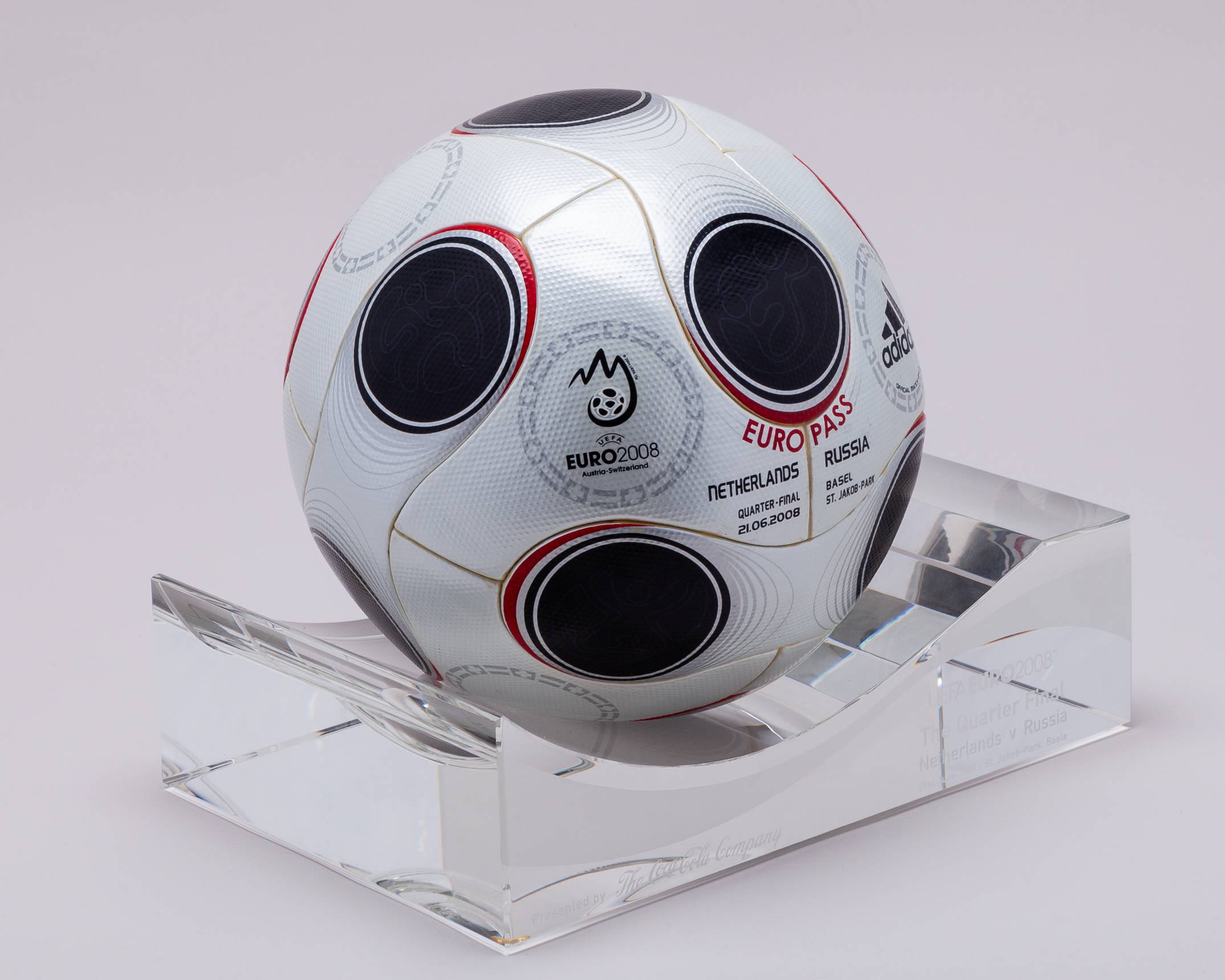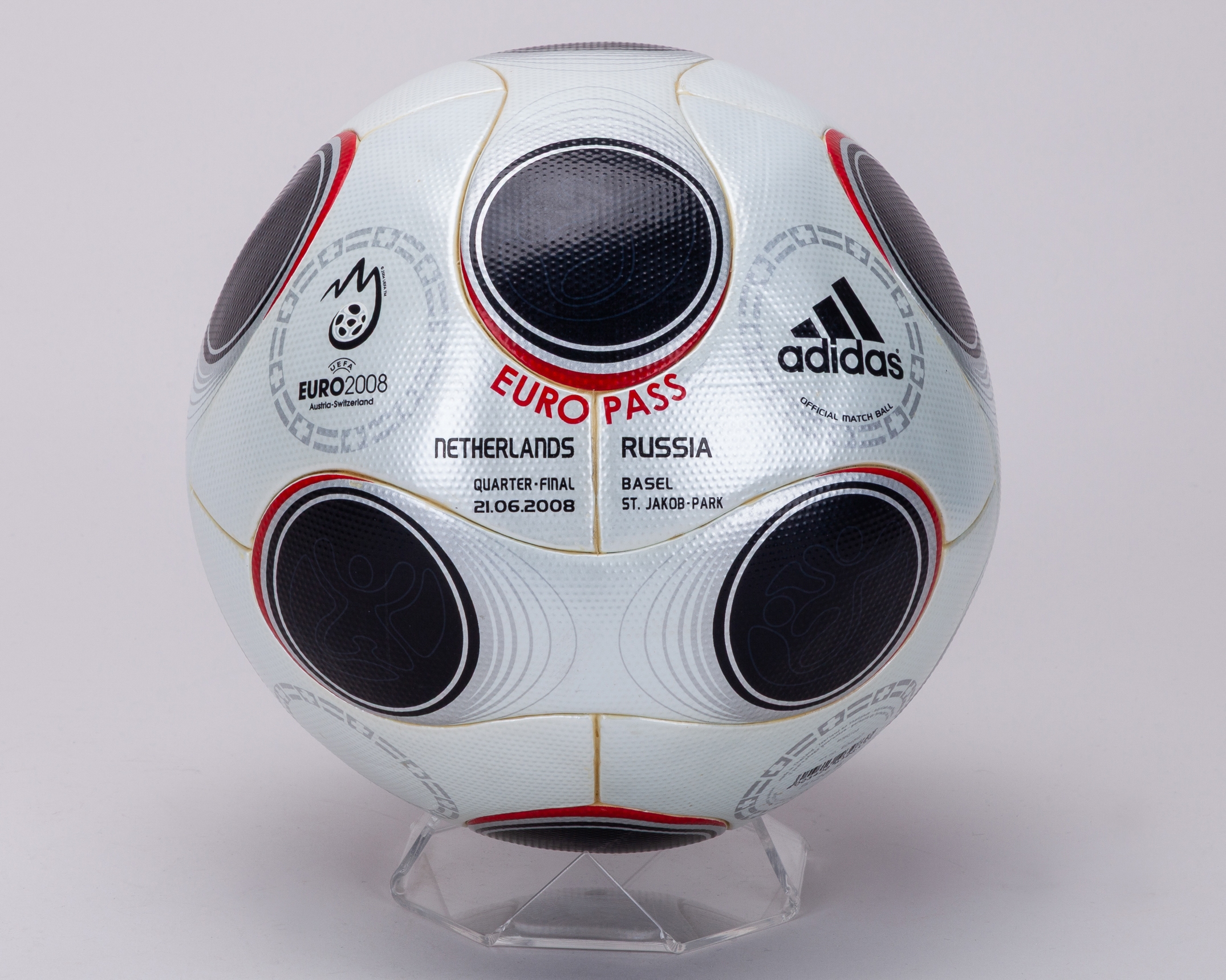 Netherlands v. Russia UEFA European Championship match used Adidas Europass football, 2008, with NETHERLANDS RUSSIA QUARTER-FINAL 21.06.2008 BASEL ST. JAKOB-PARK decal, with certified used official match ball label, with heavy glass custom stand and box