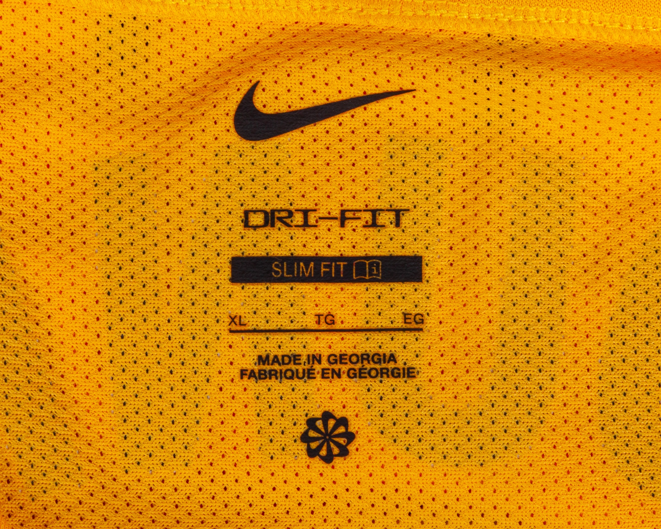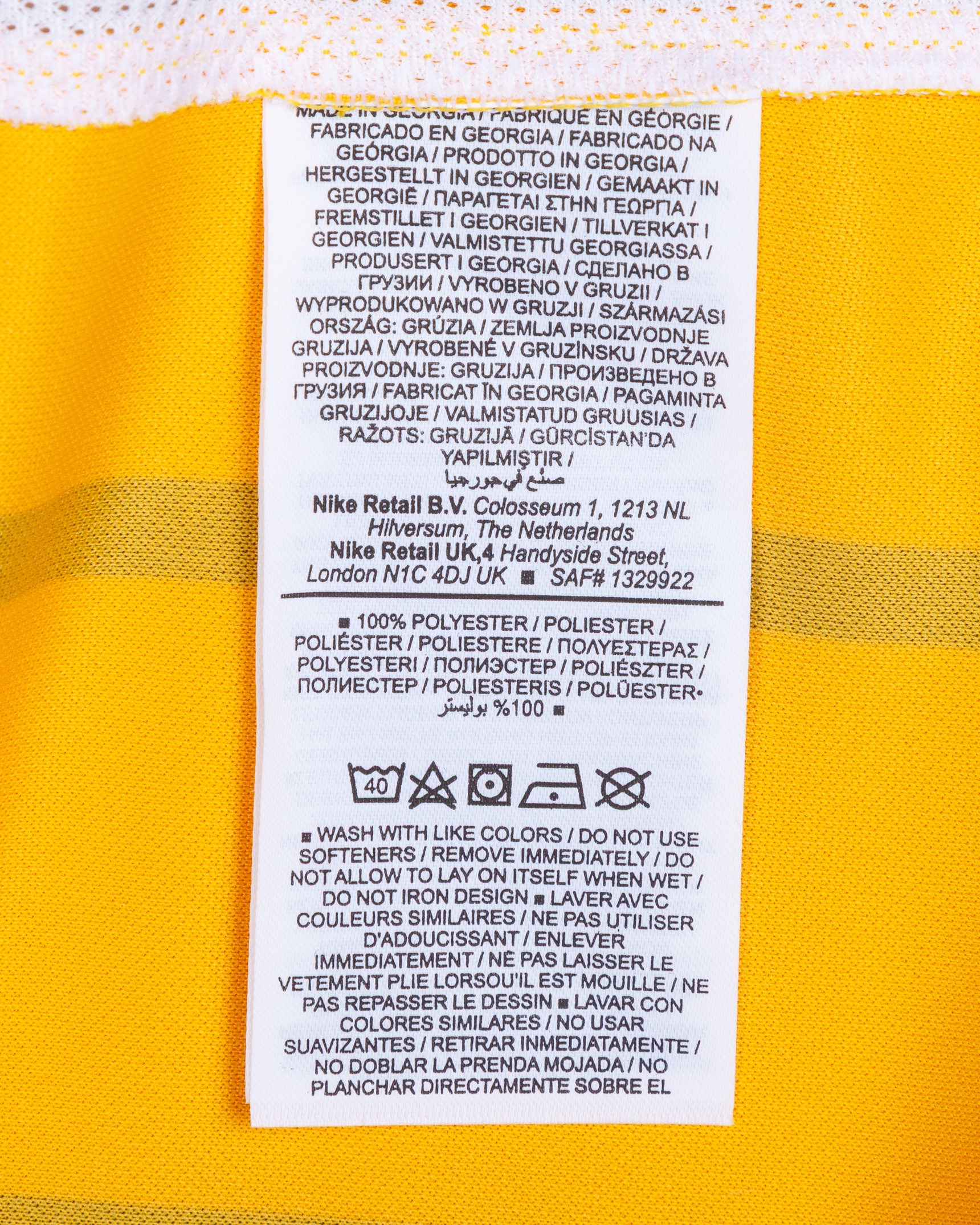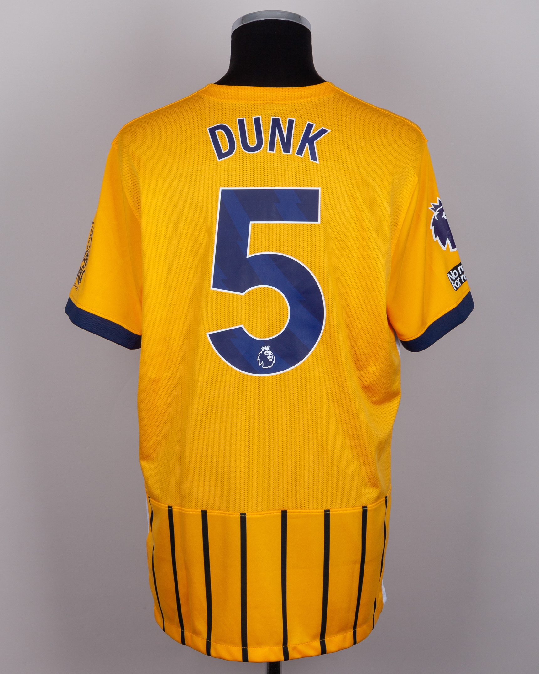 Lewis Dunk yellow No.5 Brighton & Hove v. Tottenham Hotspur match issued short-sleeved shirt, 2025, Nike, XL, with crew-neck collar and embroidered cloth badge inscribed BRIGHTON & HOVE ALBION, the reverse lettered DUNK, the right sleeve with Premier League flash