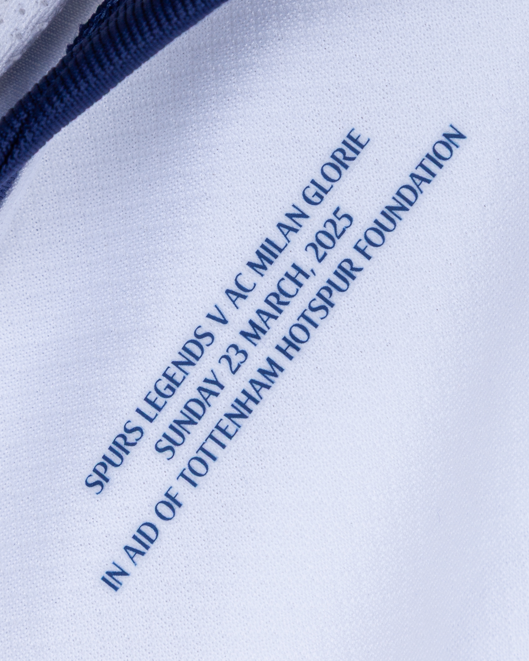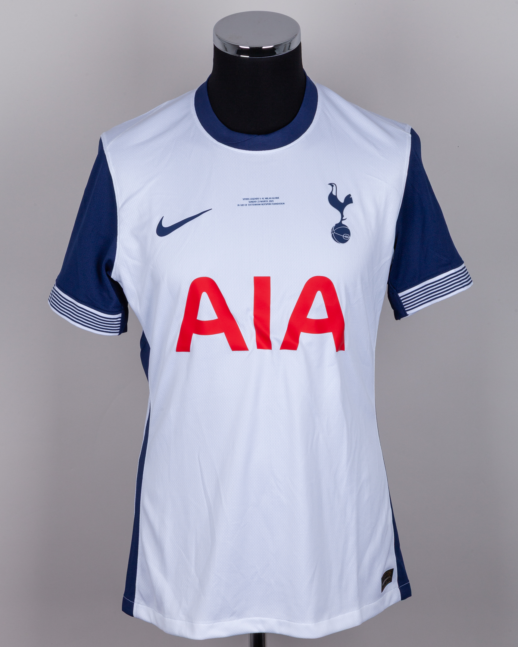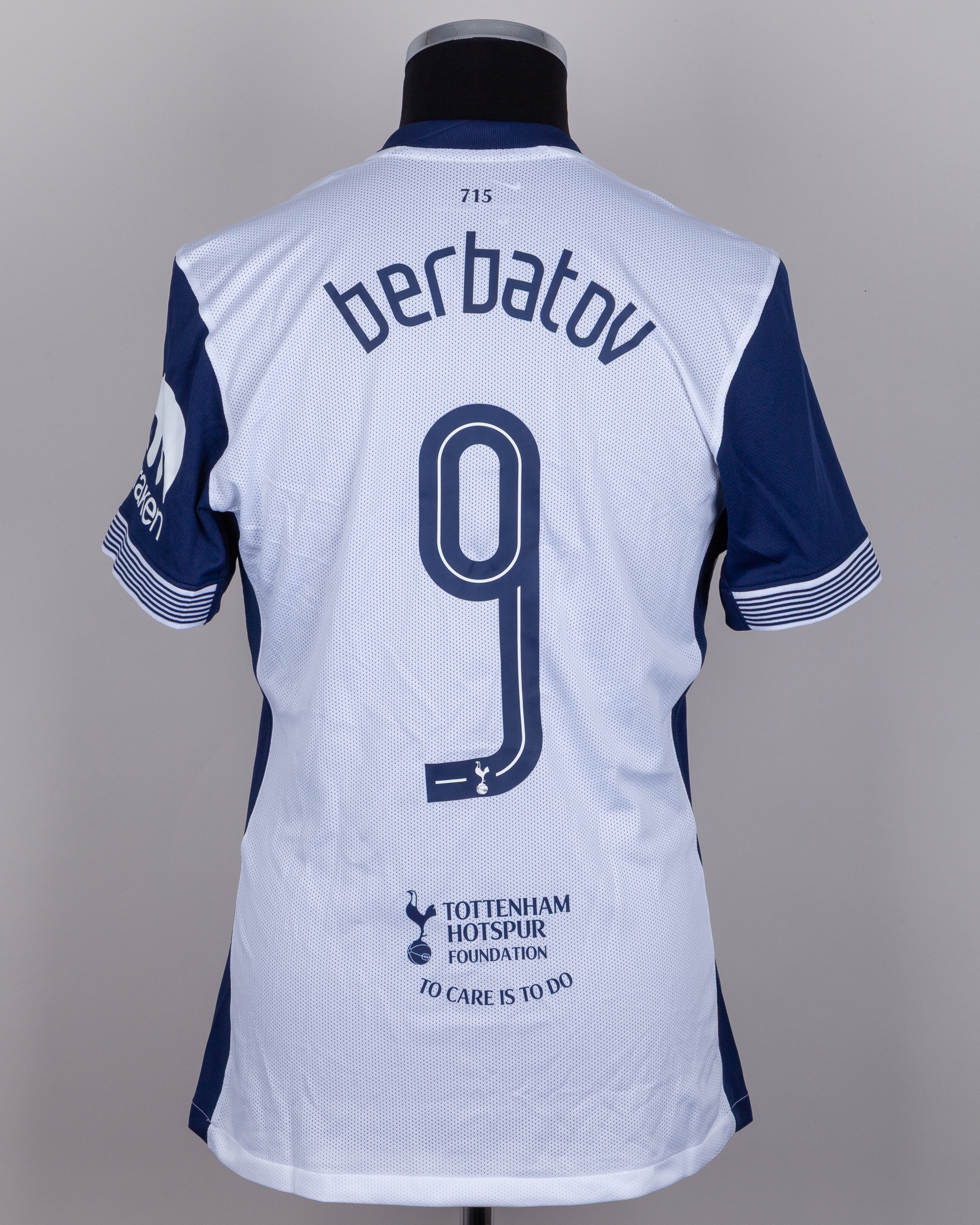 Dimitar Berbatov white and blue No.9 Tottenham Hotspur Legends v. AC Milan short-sleeved shirt, 2025, Nike, L, with crew-neck collar and printed badge, with SPURS LEGENDS V AC MILAN GLORIE SUNDAY 23 MARCH 2025 IN AID OF TOTTENHAM HOTSPUR FOUNDATION decal, the reverse lettered berbatov