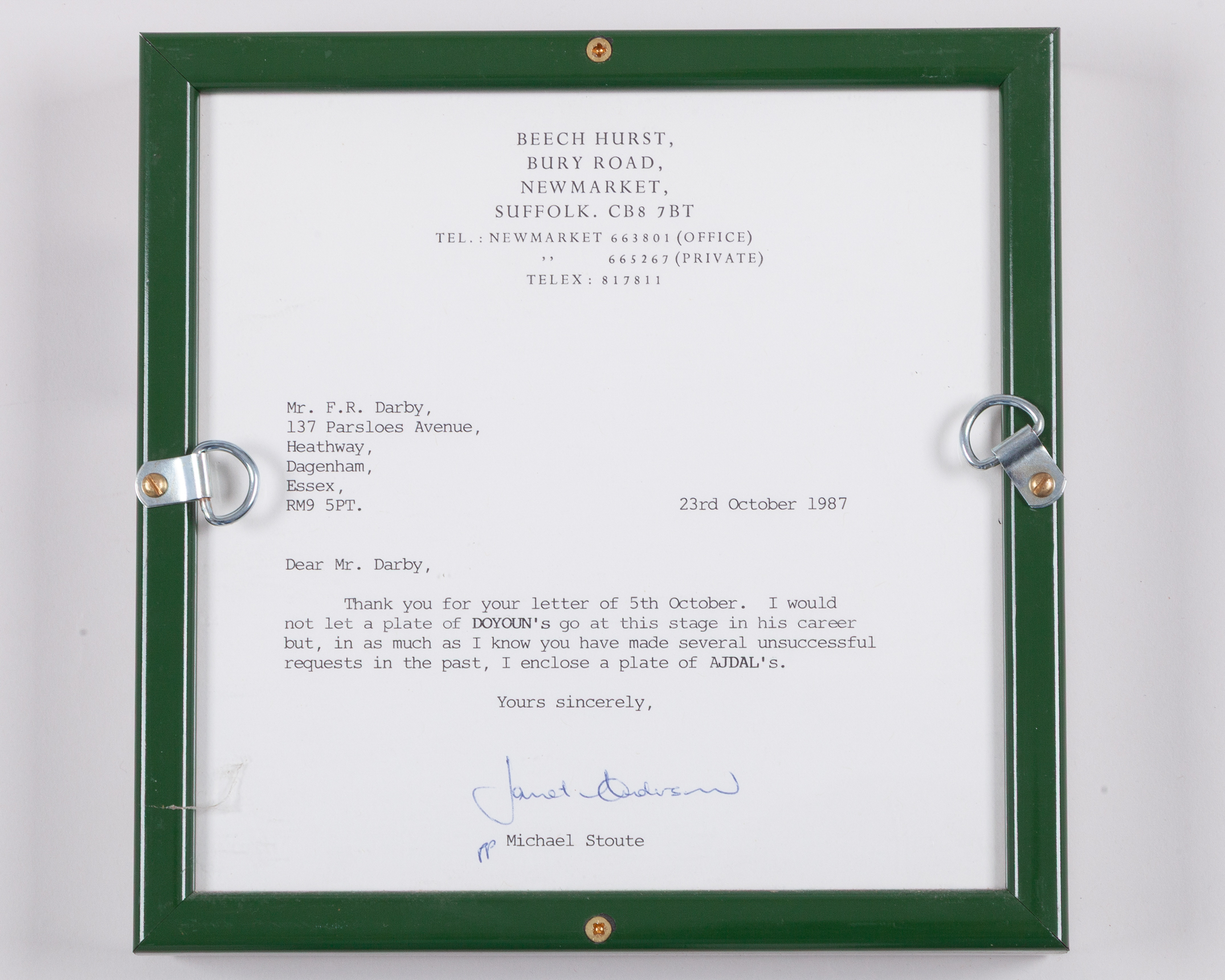 Racing plate worn by Ajdal, the 1987 Champions Sprinter, containing a picture of Ajdal, the reverse of the frame containing a letter of provenance from Michael Stoute's Beachhurst Stables in Newmarket, framed 24cm. square