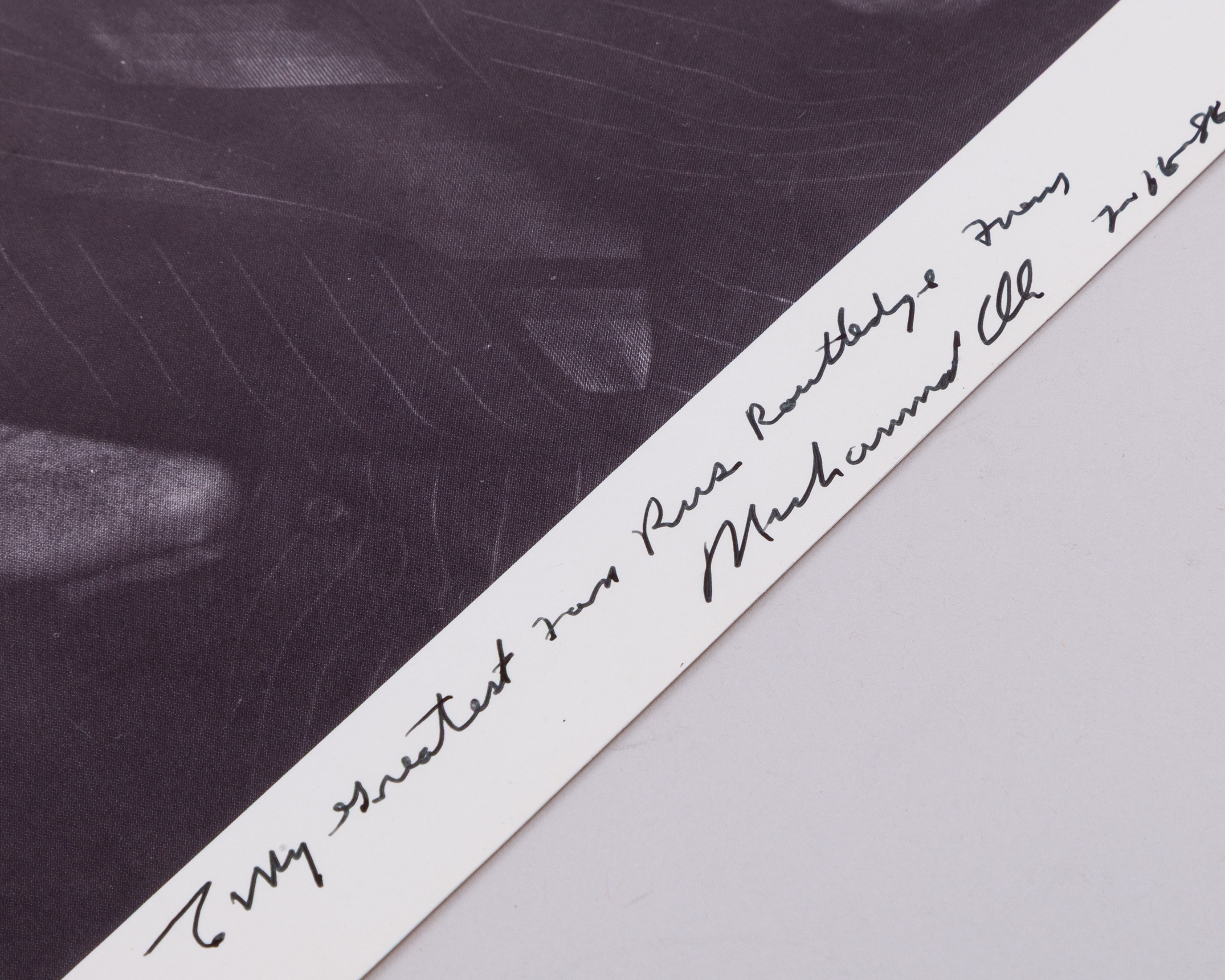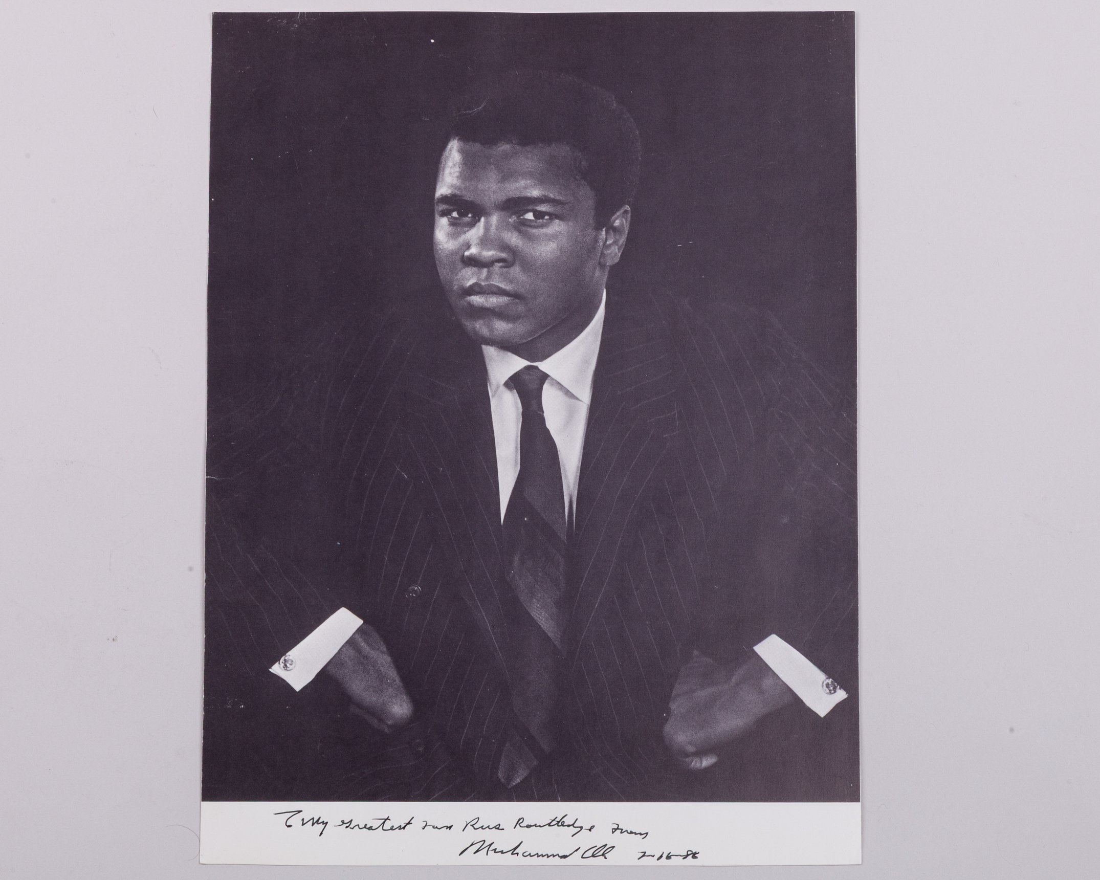 A black and white autographed and dedicated Muhammad Ali signed photograph, To My Greatest fan Russ Routledge, dated 1986, 30 x 22cm