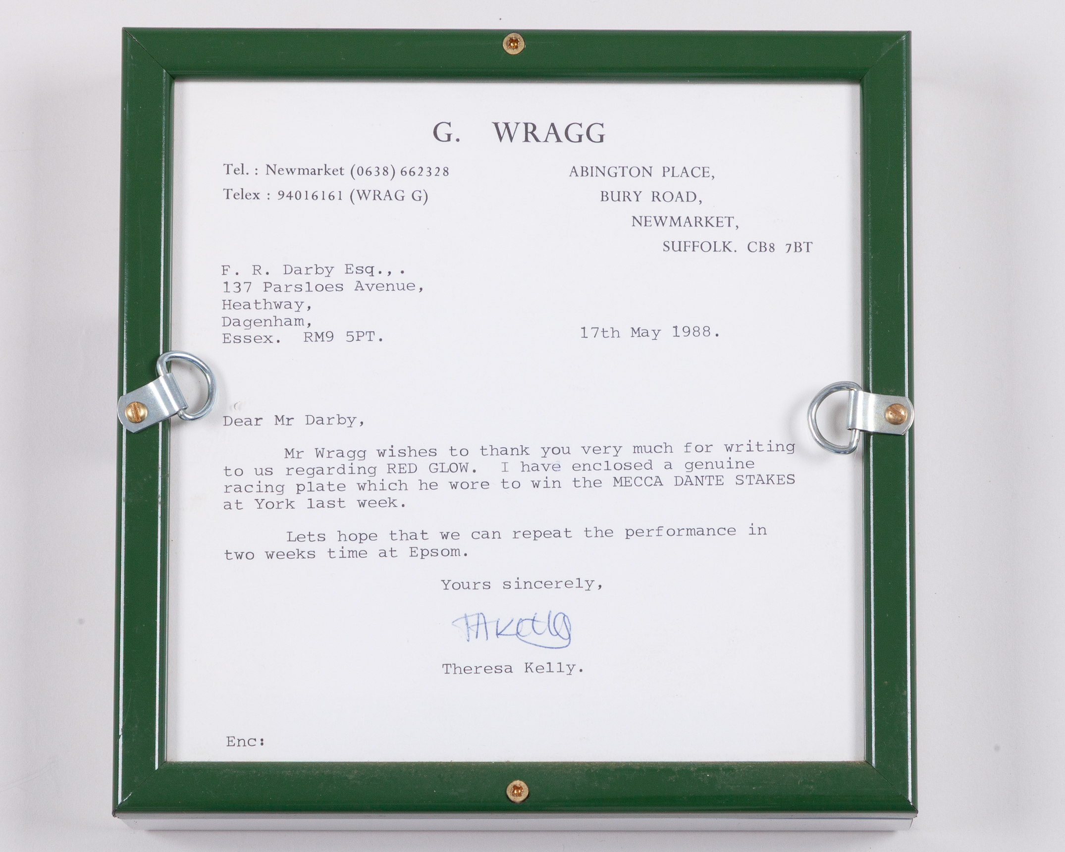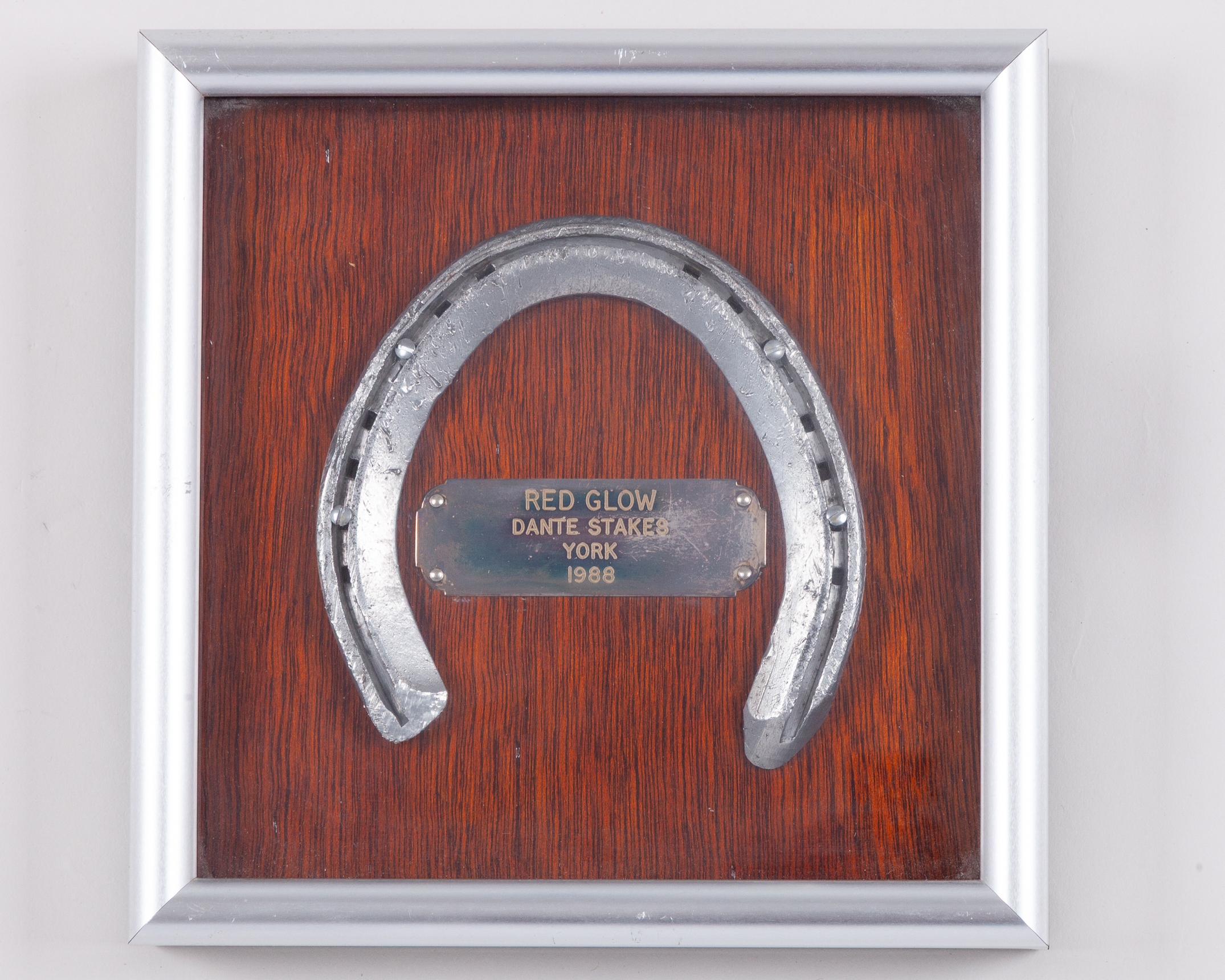 Racing plate worn Red Glow when winning the 1988 Dante Stakes, the reverse of the frame containing a letter of provenance from Geoff Wragg's Abington Place Stables, Newmarket, framed 20cm. square