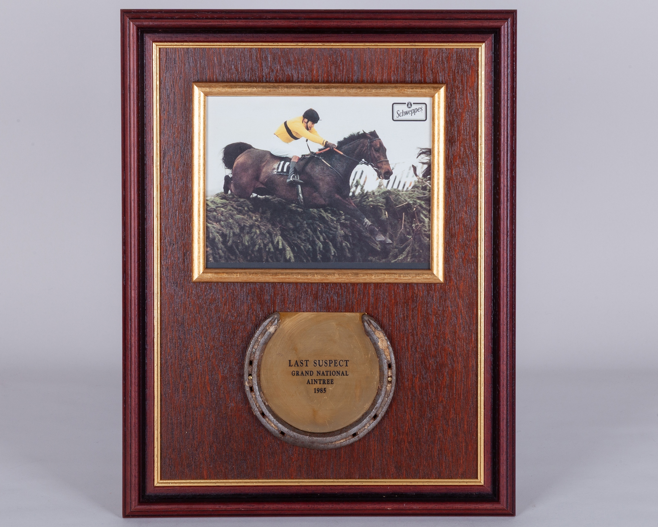 Racing plate worn by Last Suspect when winning the 1985 Grand National, mounted Schweppes calendar picture, framed, 48 by 36cm.