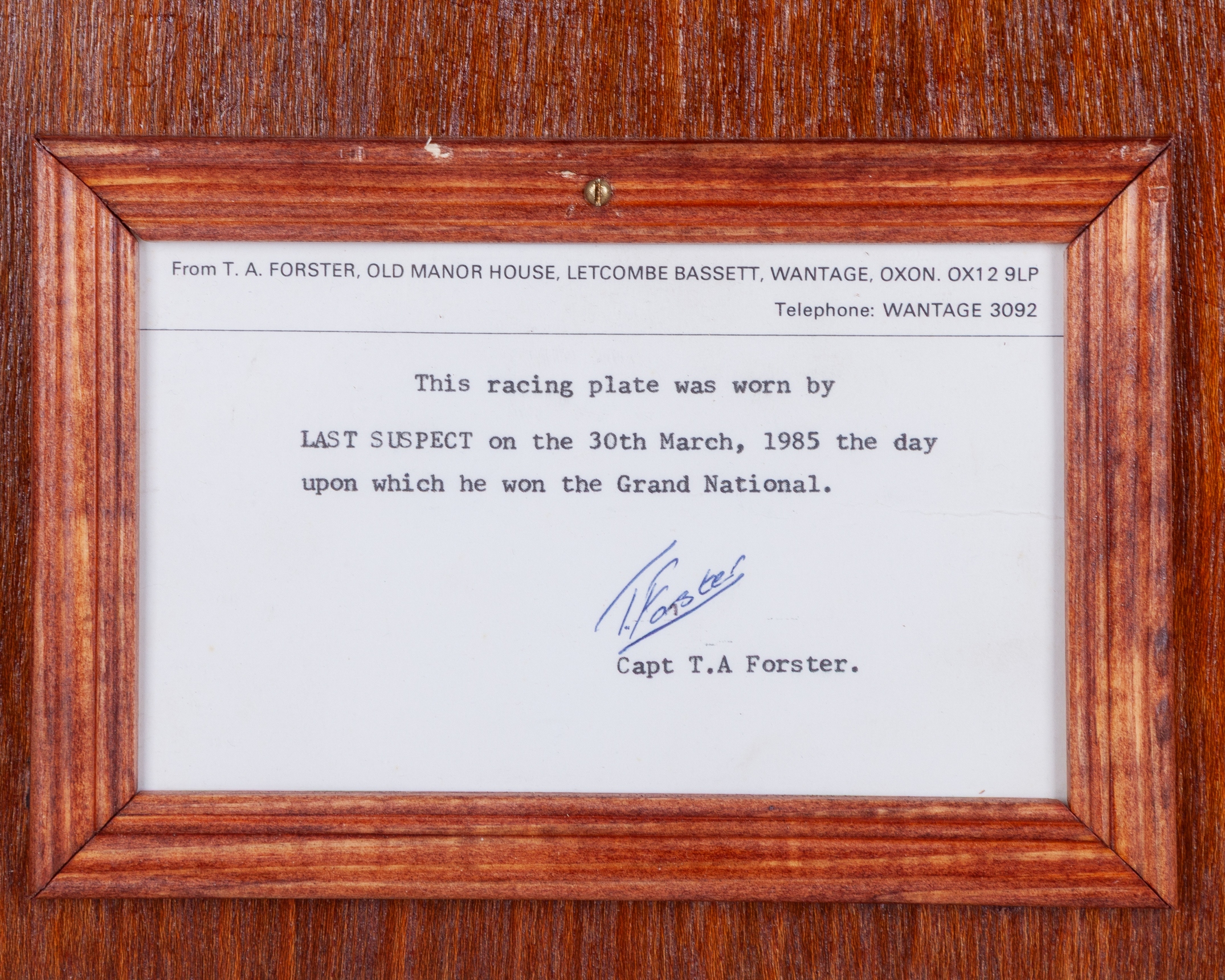 Racing plate worn by Last Suspect when winning the 1985 Grand National
