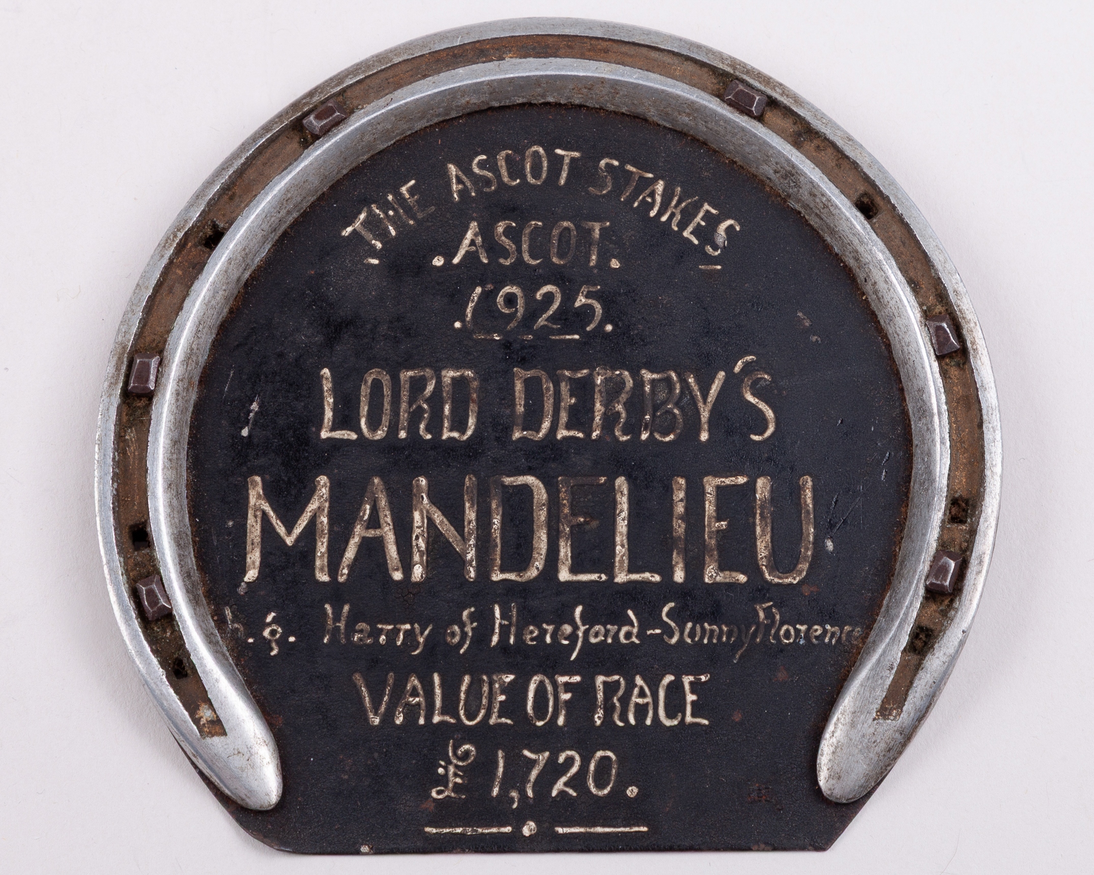 Racing plate worn by Lord Derby's Mandelieu when winning the 1925 Ascot Stakes