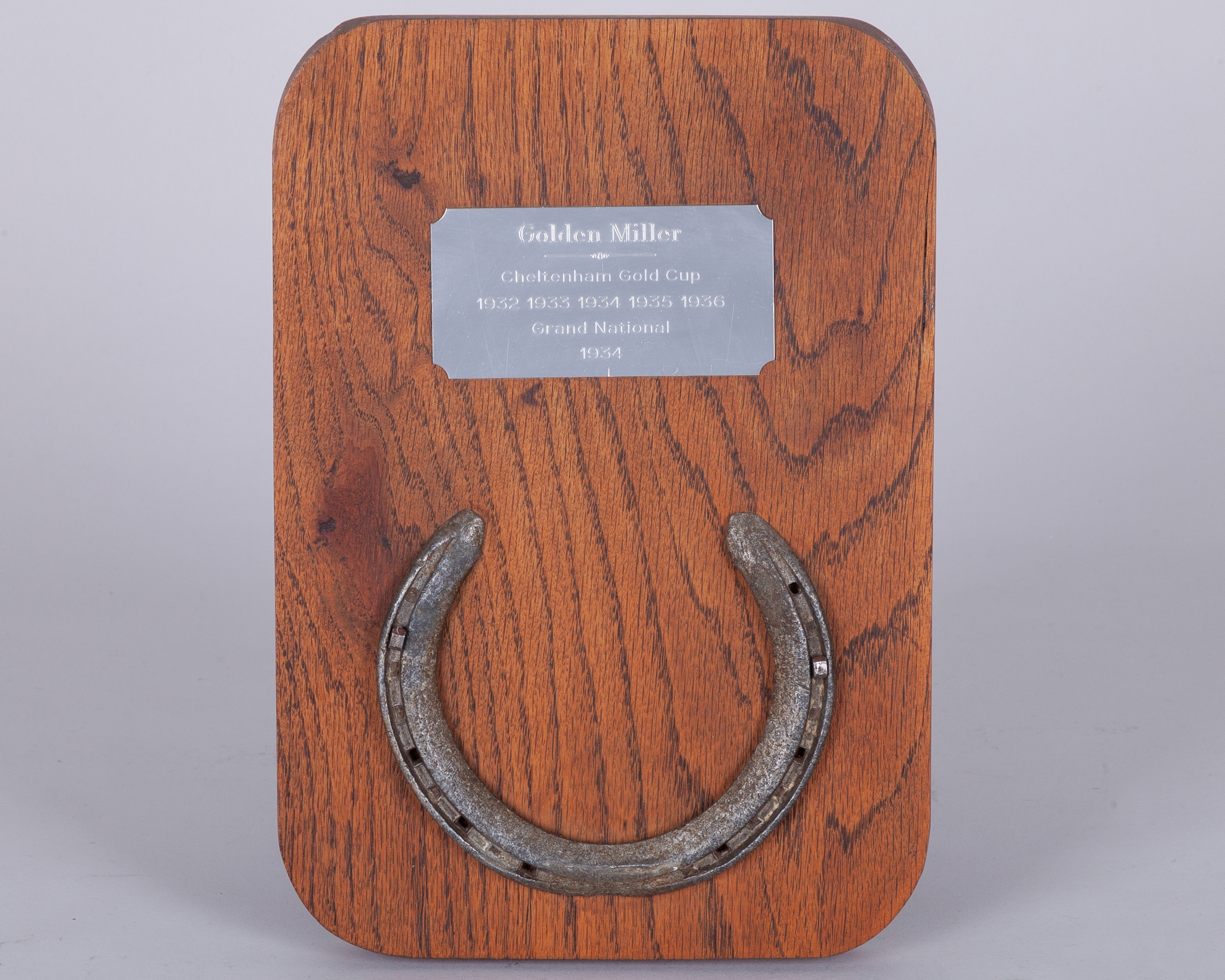 A Golden Miller racing plate, with modern plaque engraved with details of the horses wins in the Cheltenham Gold Cup and Grand National