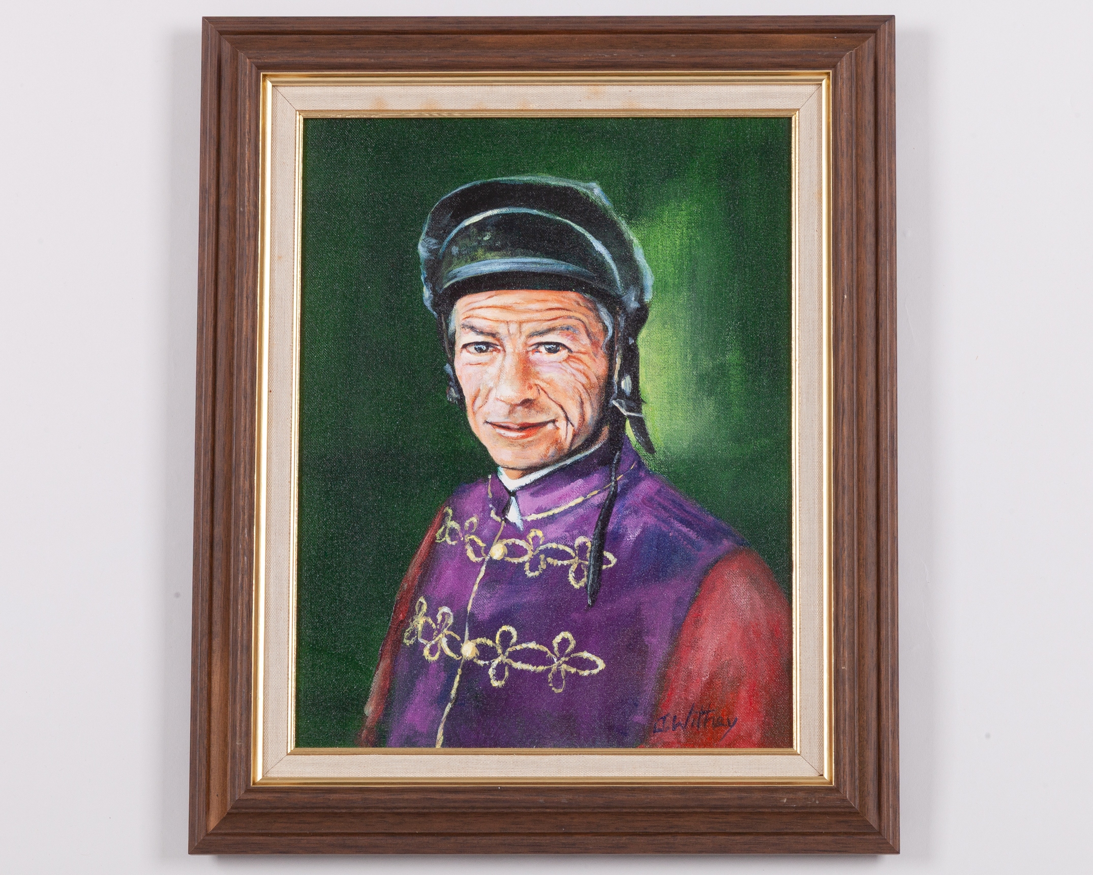 Portrait painting of the jockey Lester Piggott in the Royal Colours,