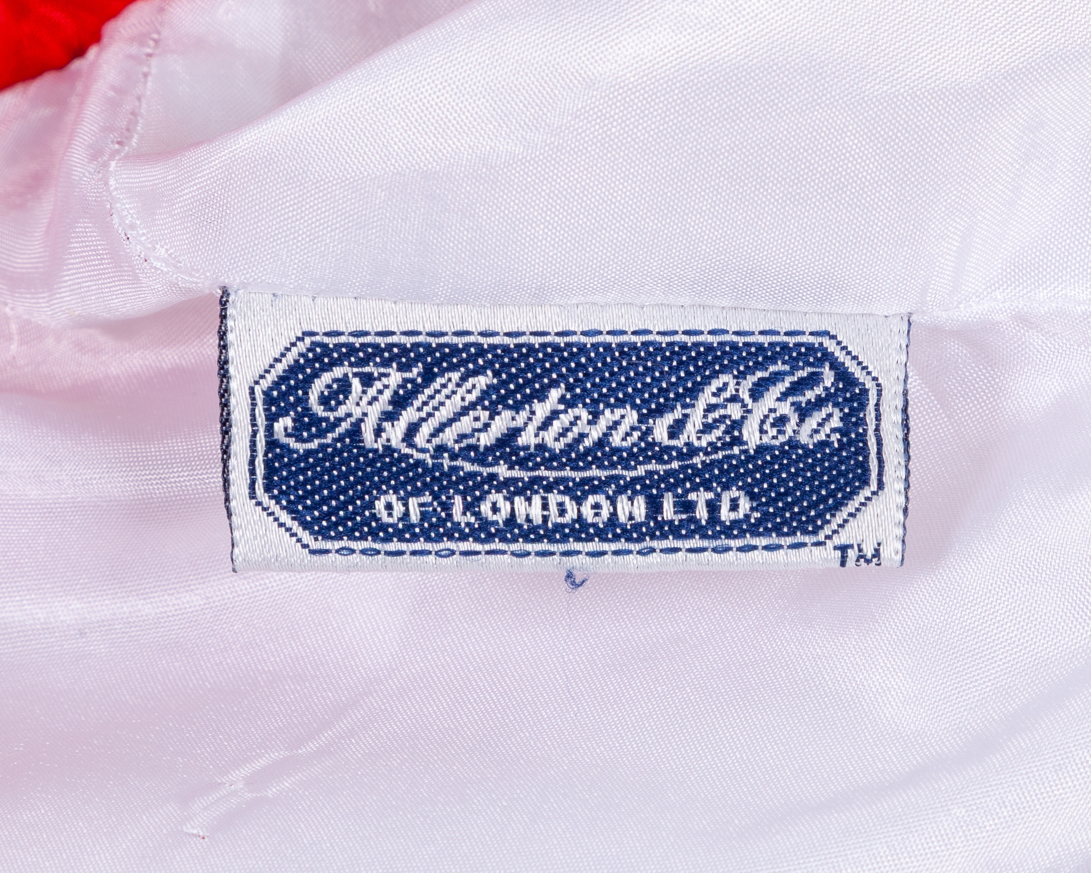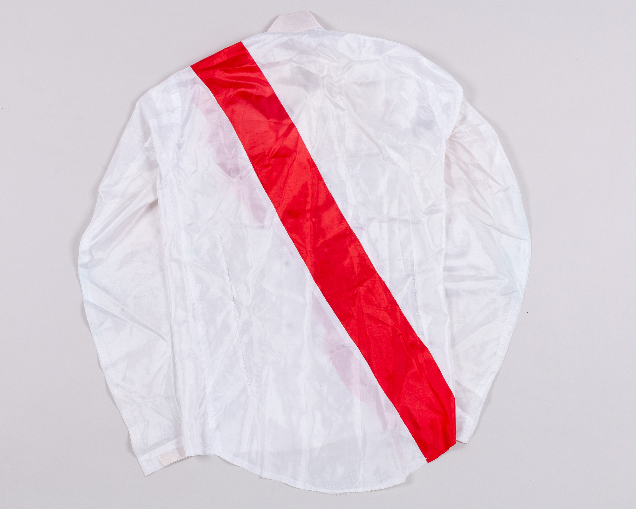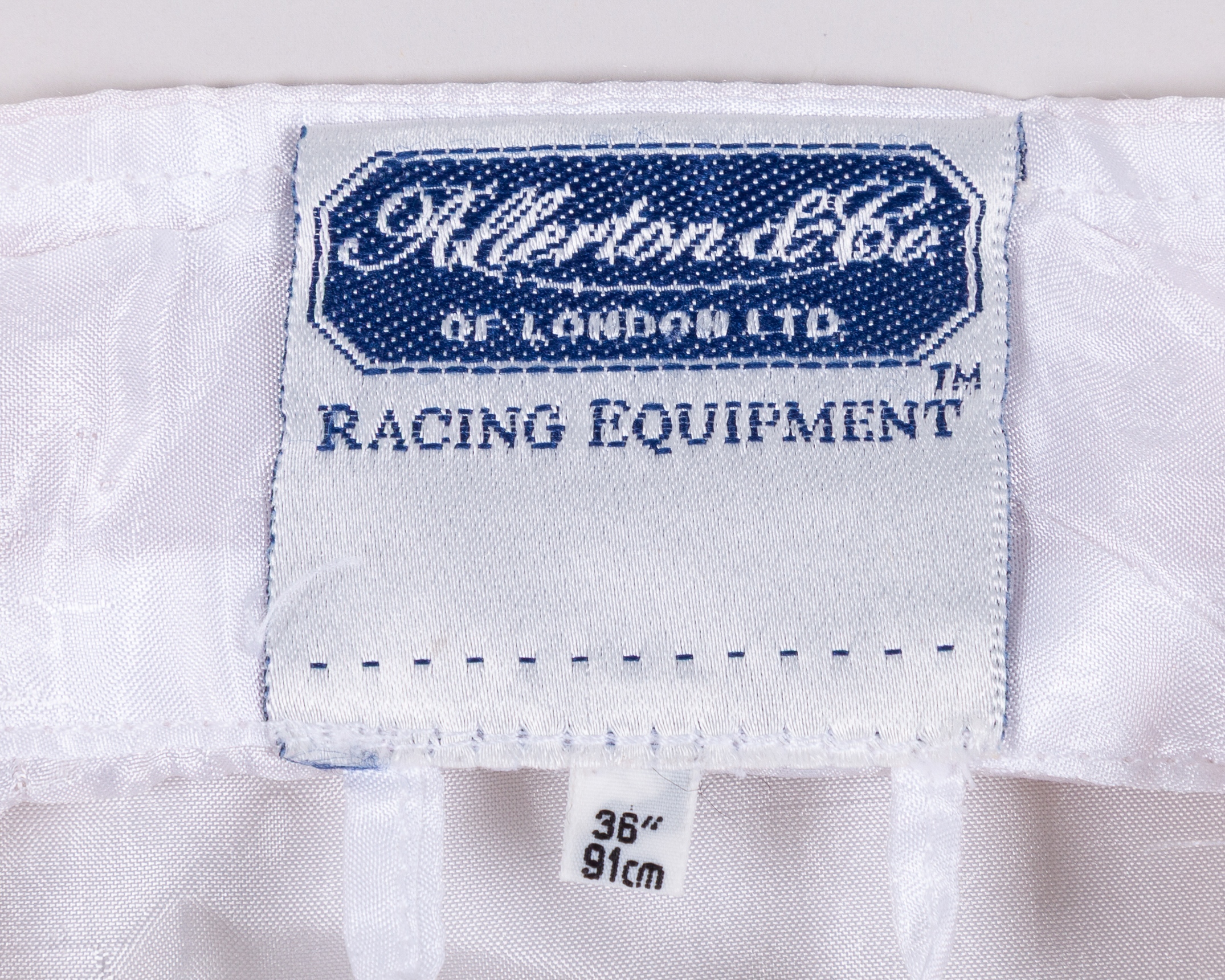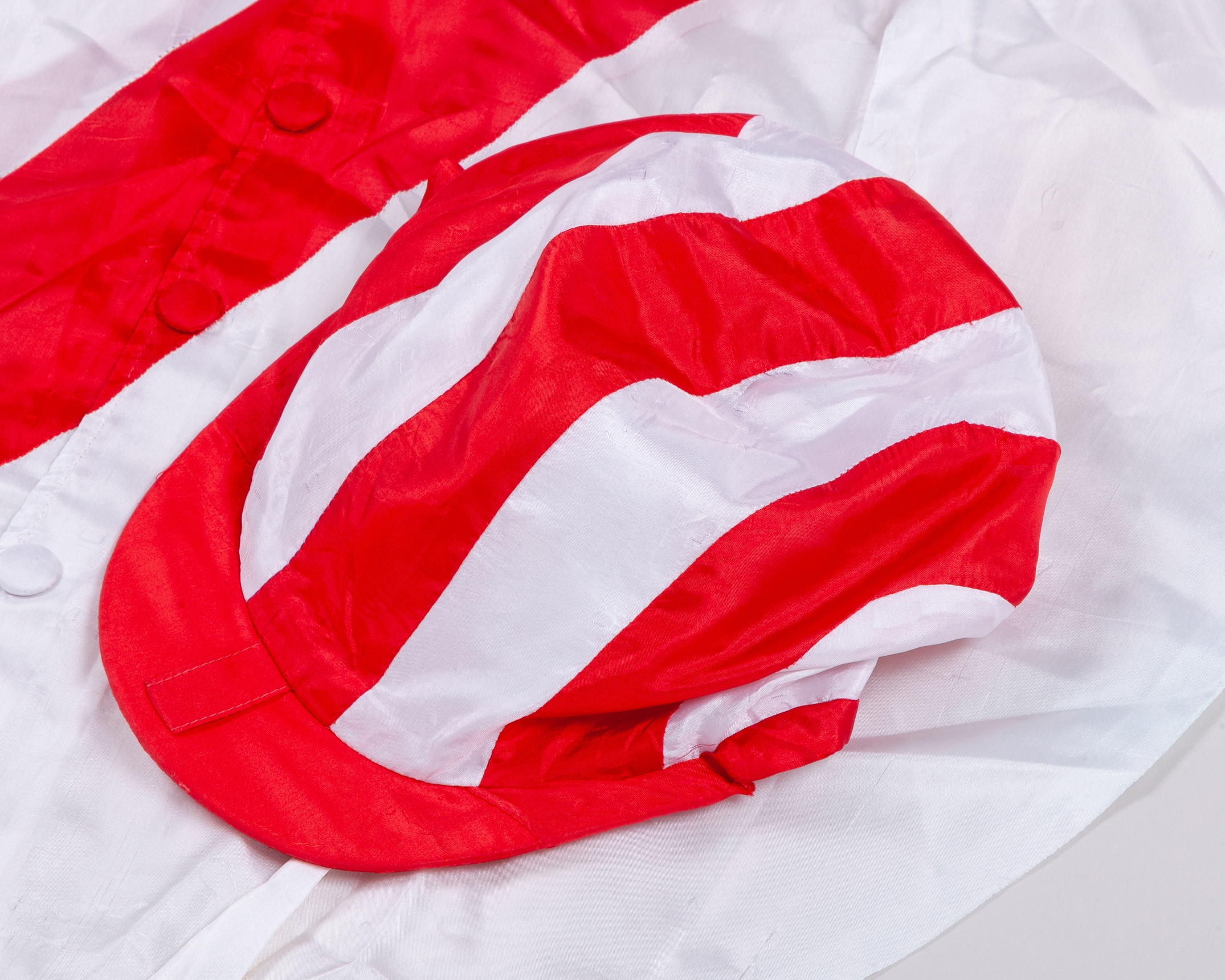 Racing colours of Saeed Manana, white with red sash and striped cap