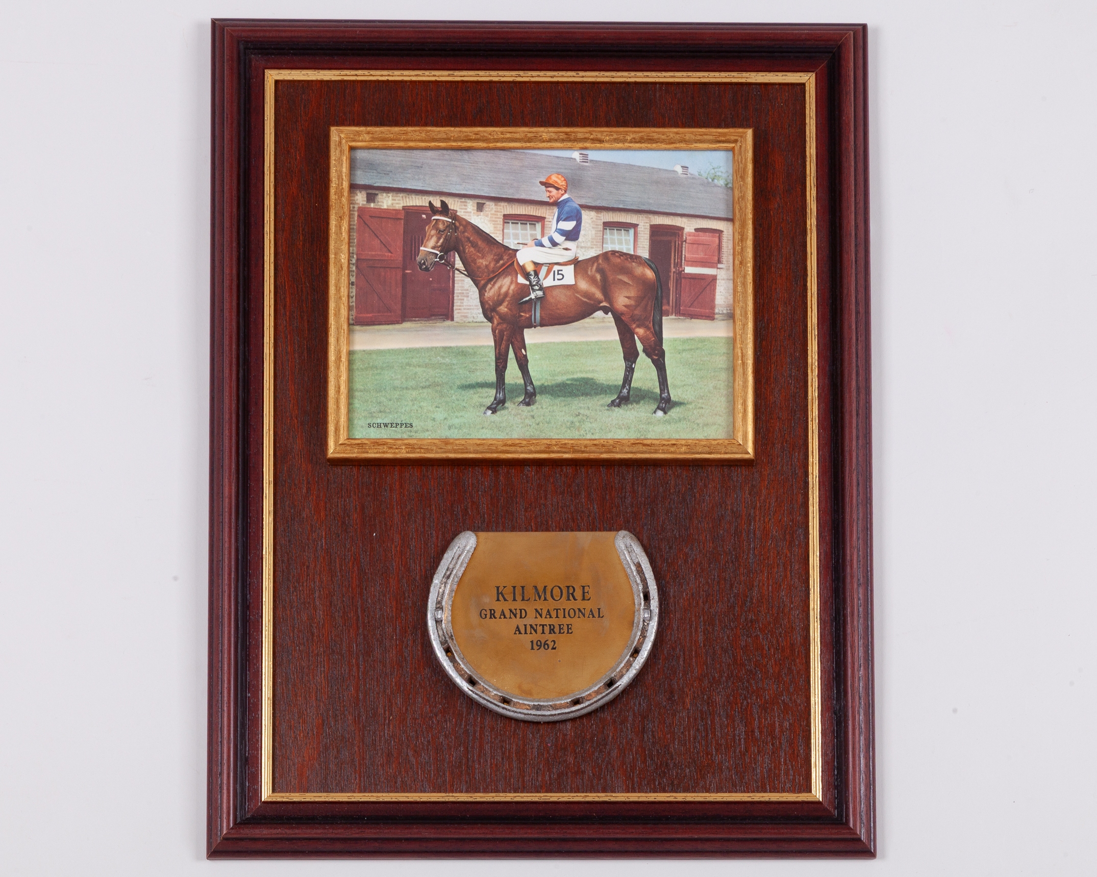 Racing plate worn by Kilmore when winning the 1962 Grand National, mounted with a Schweppes calendar picture, framed, 47 by 36cm.