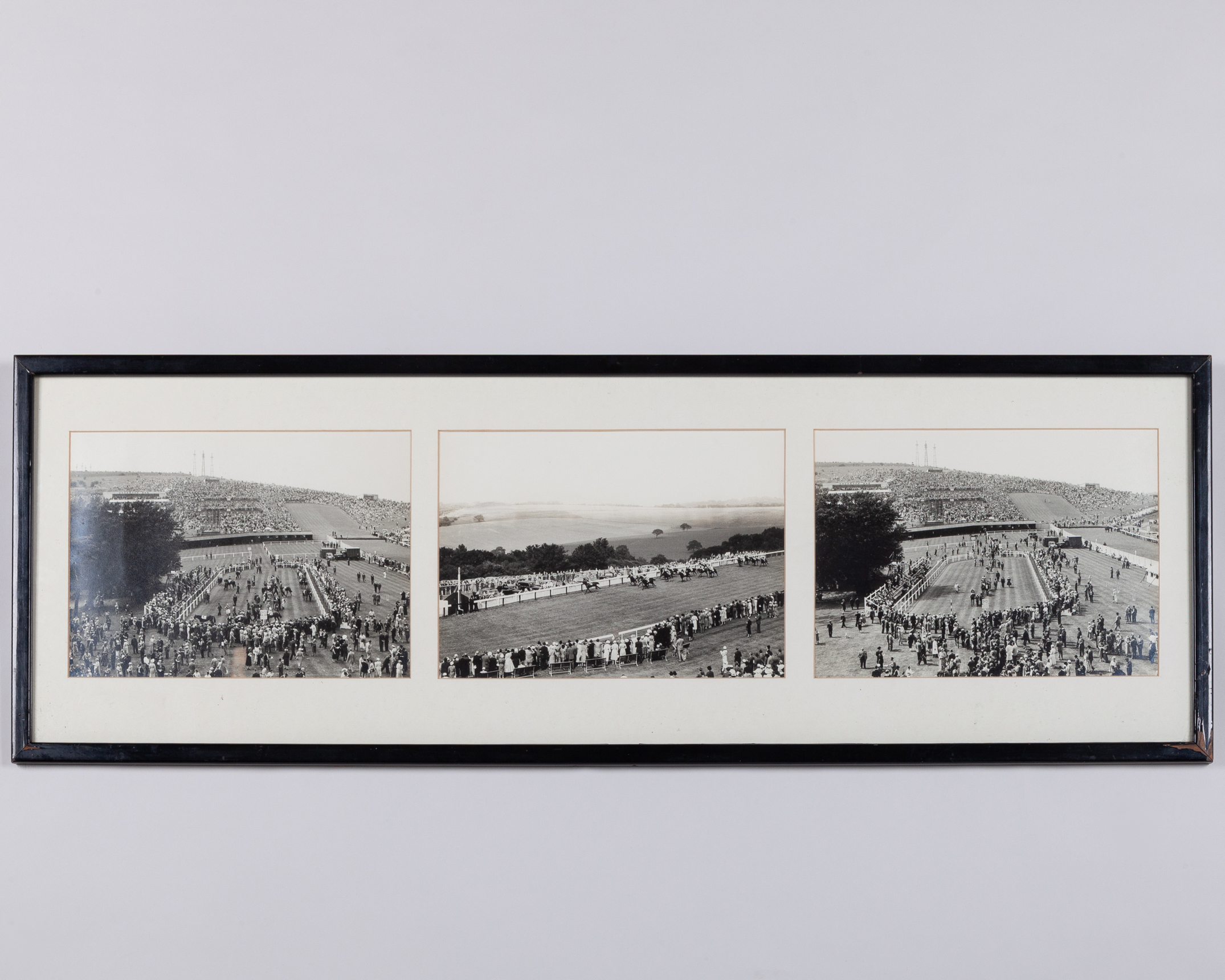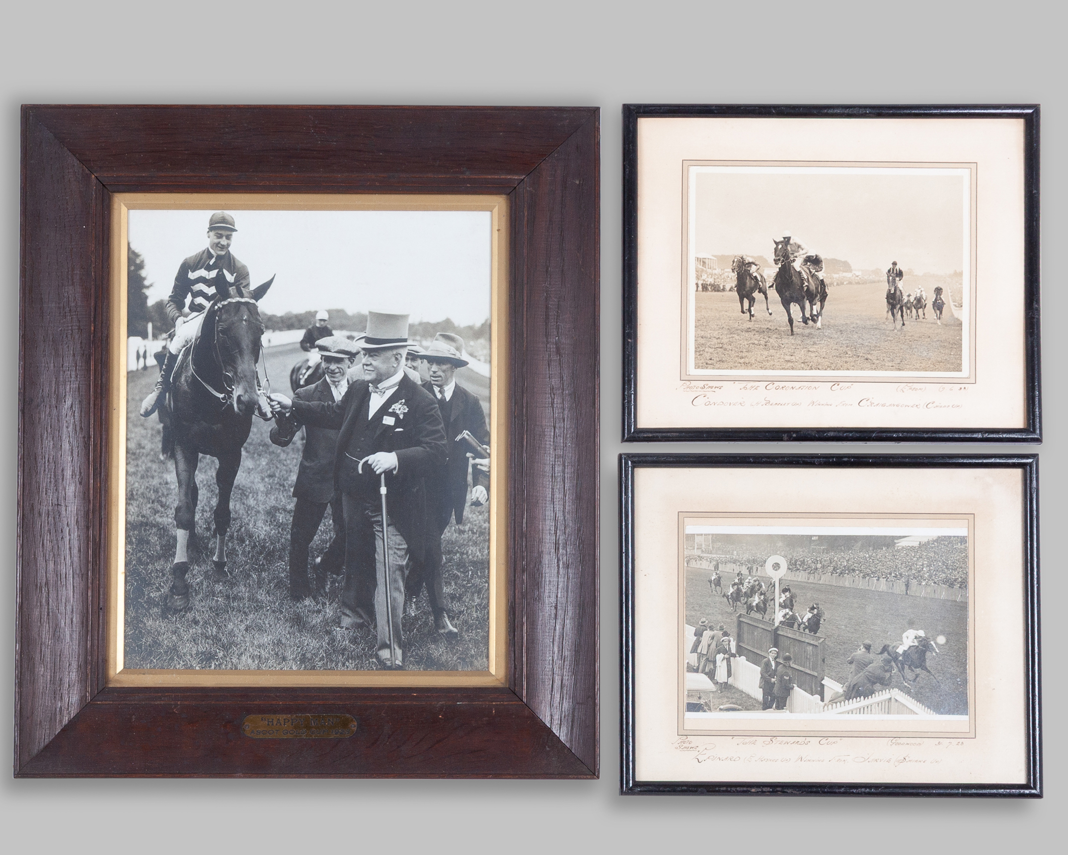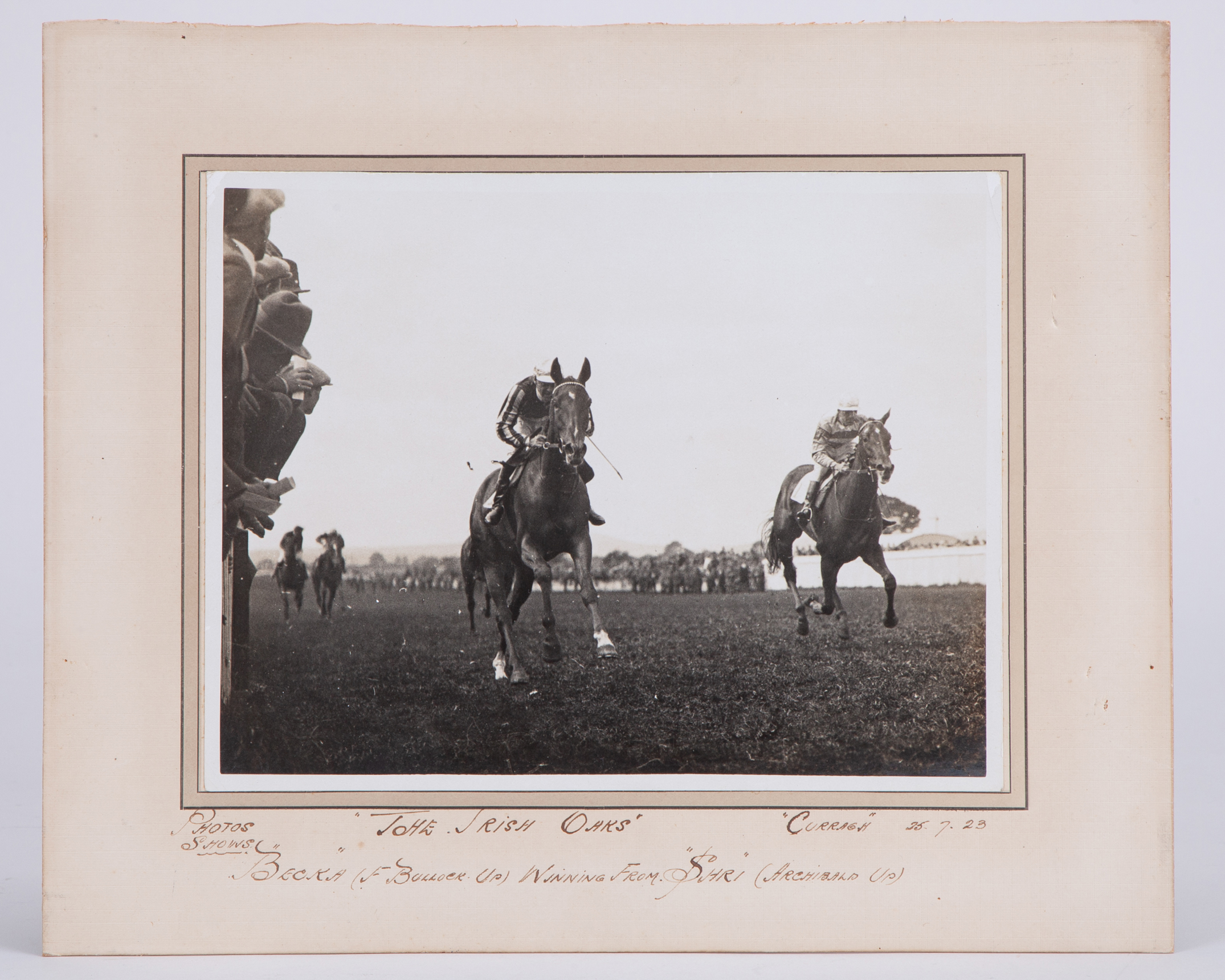 Collection of ten vintage horse racing photographs, framed unless otherwise stated, including seven from the 1920s comprising, framed: Epinard winning the 1923 Stewards' Cup; Condover winning the 1923 Coronation Cup; and a larger frame of Happy Man being led back in after his 1923 Ascot Gold Cup win; and an unframed photograph of Becka winning the 1923 Irish Oaks; later subjects including a triple-mounting of Glorious Goodwood scenes; a Goodwood race finish; other race scenes, one featuring Geoff Lewis; a portrait of the racehorse Grey Sovereign (damaged) and others