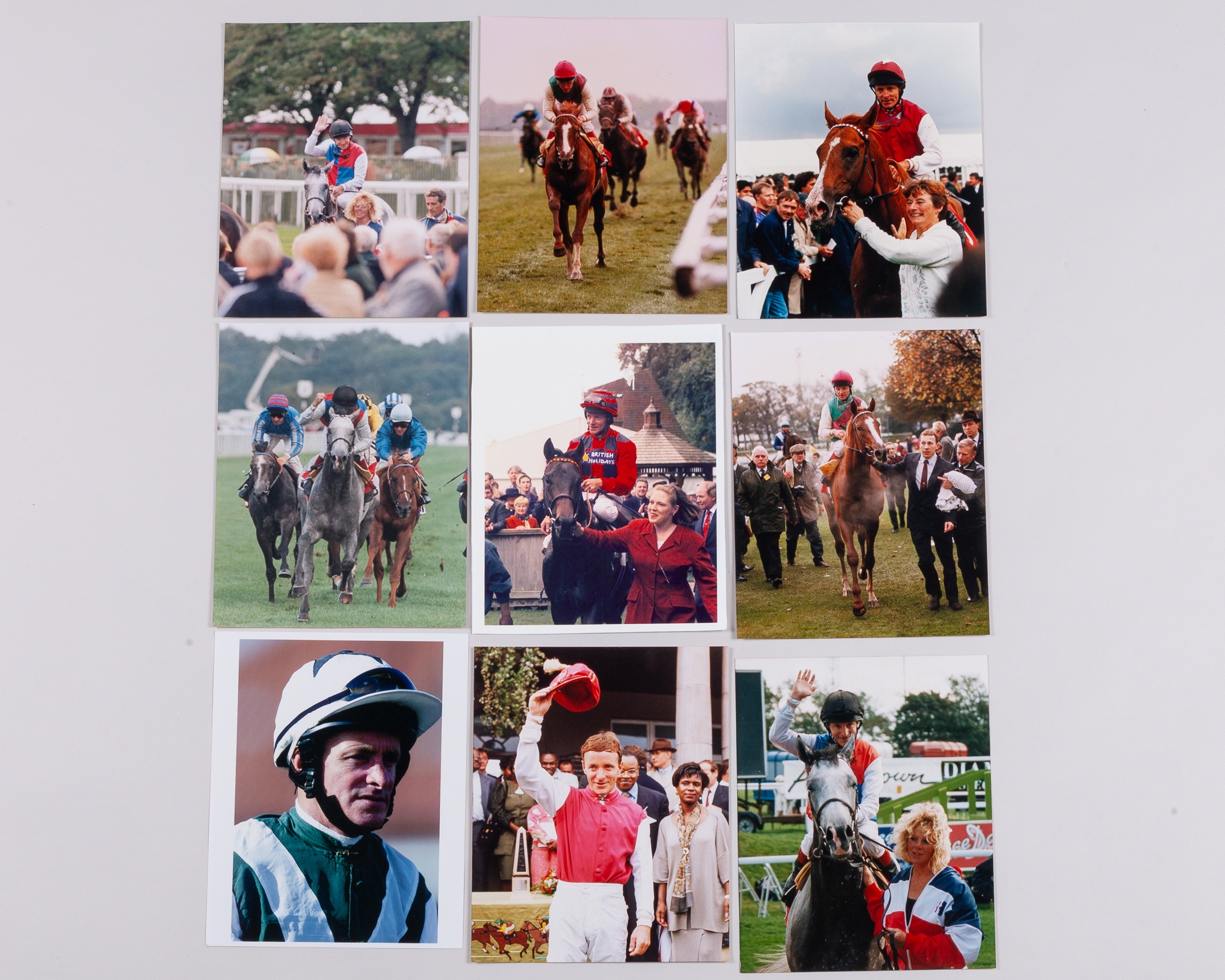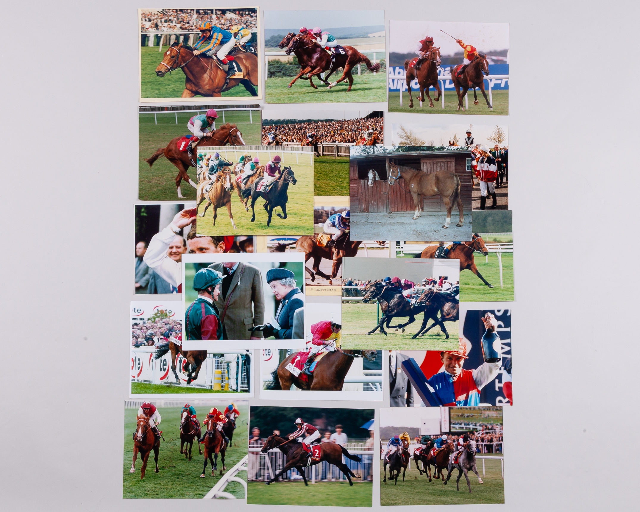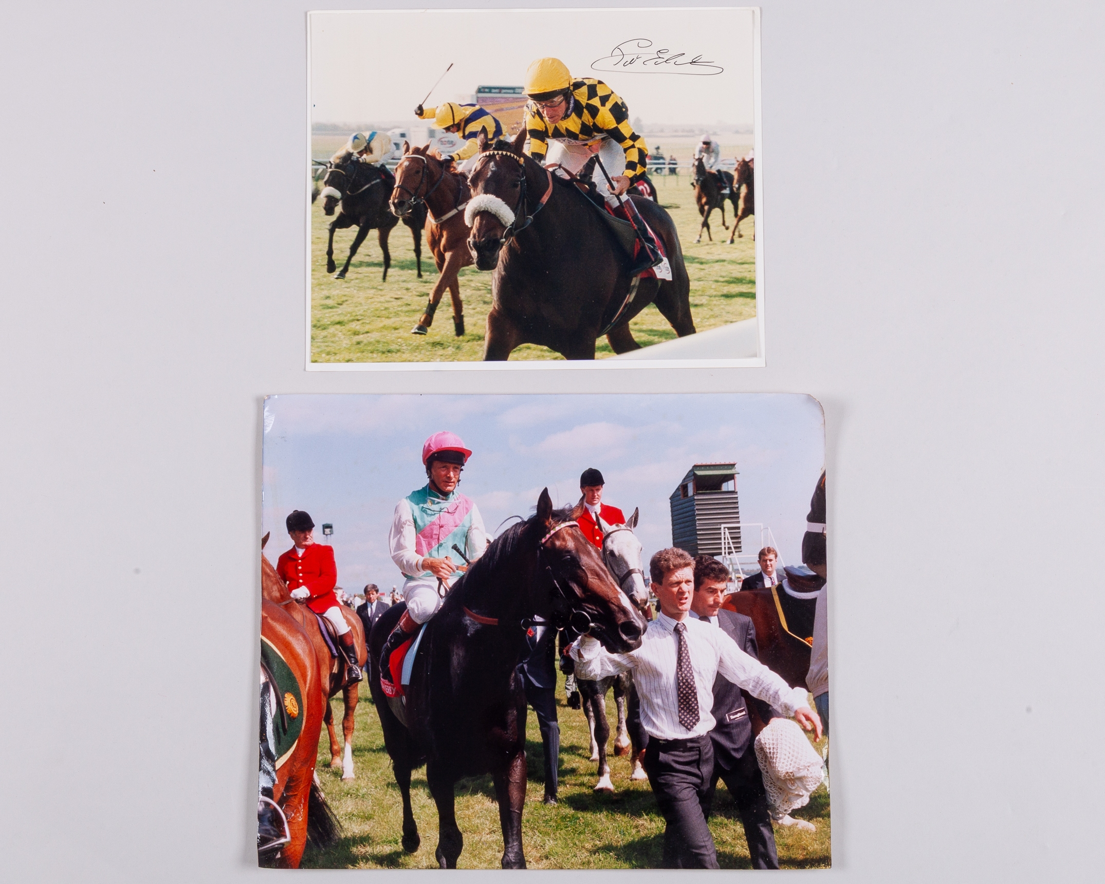 A collection of horse racing press photographs, including an example signed by the jockey Pat Eddery