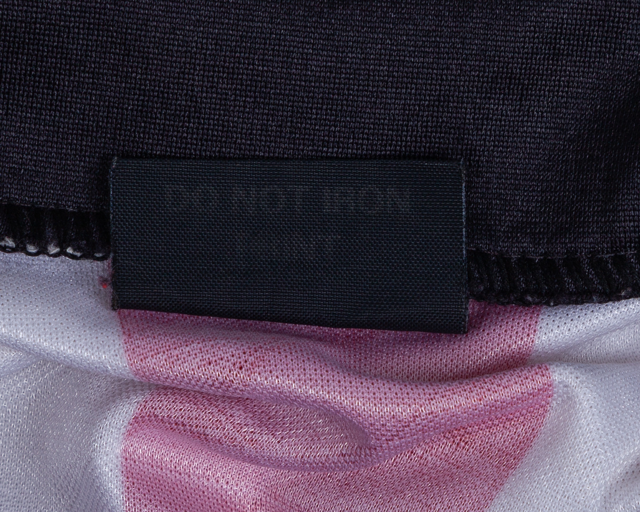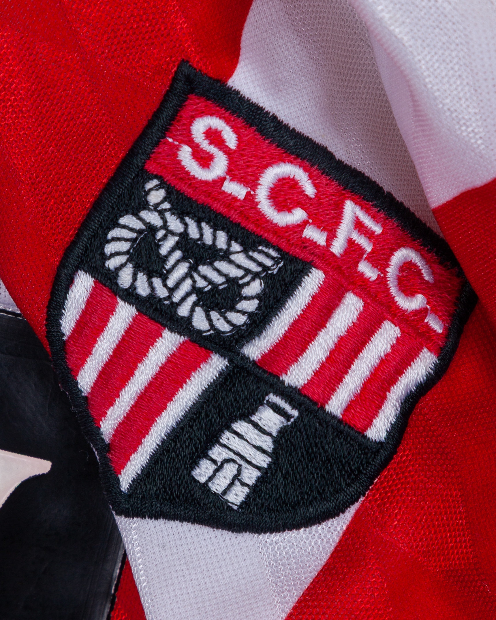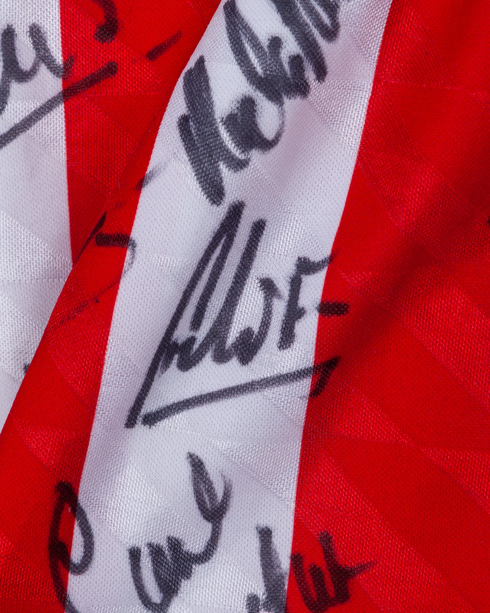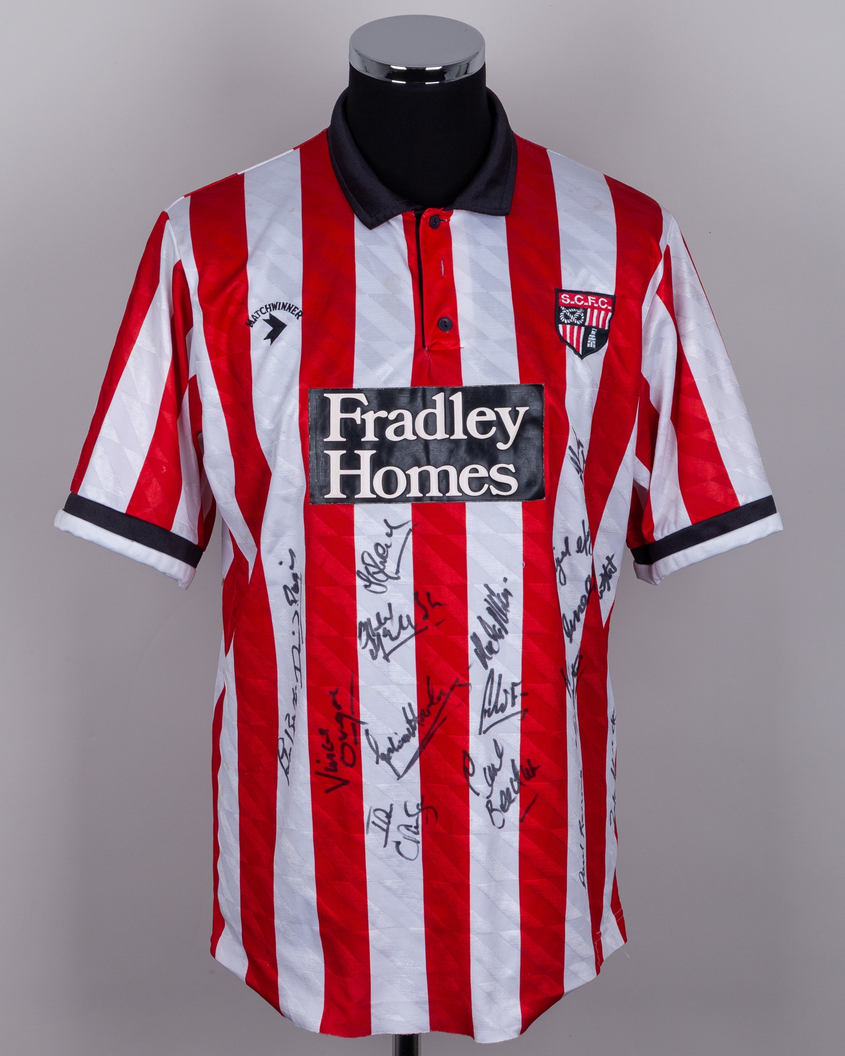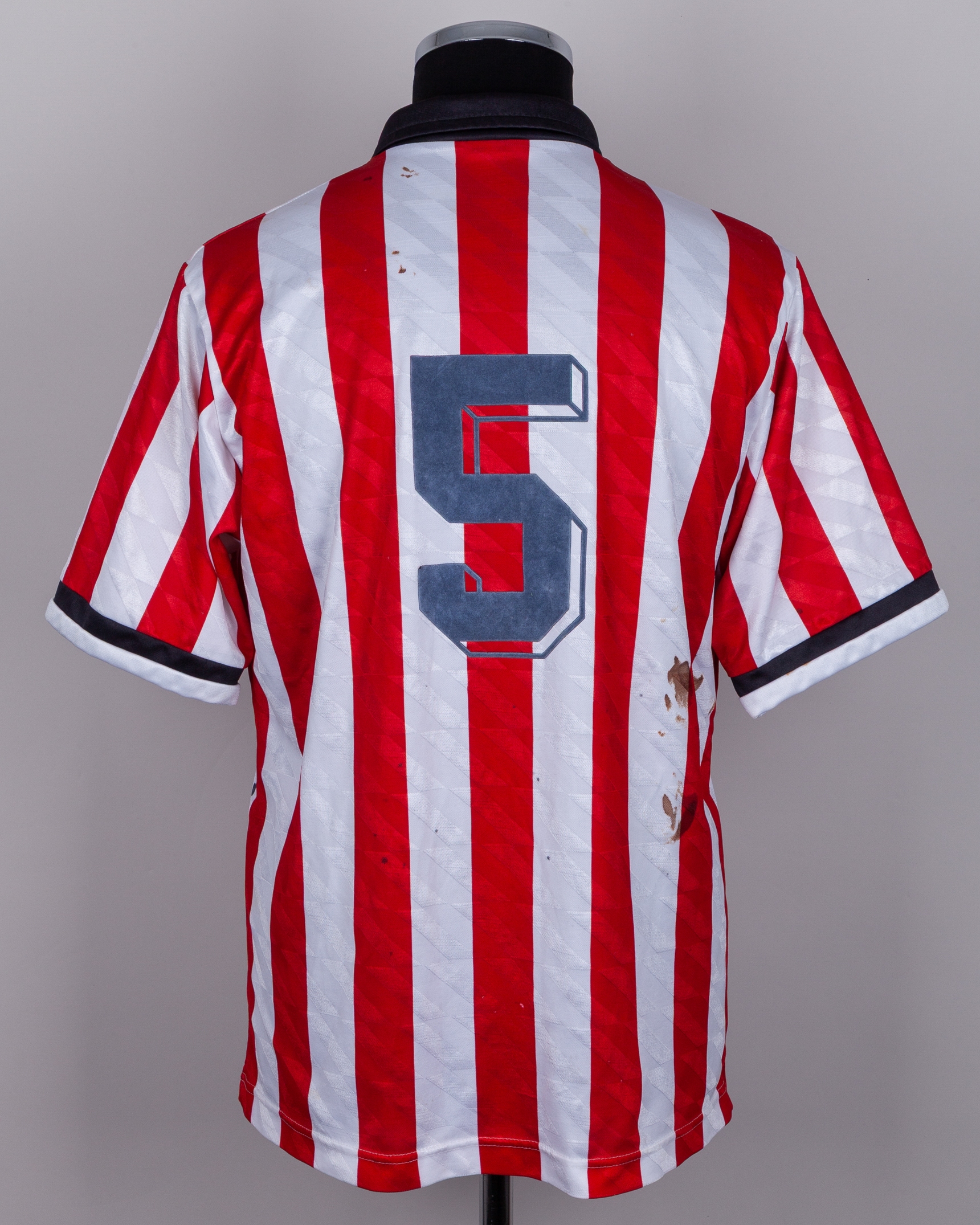 Noel Blake red and white No.5 Stoke City autographed short-sleeved shirt, 1990-91, Matchwinner, 42/44, with button-up collar and embroidered badge inscribed S.C.F.C., with seventeen autographs, with blood staining, staining, some discolouration, pulls, middle button absent and almost half the seam removed from bottom of the shirt
