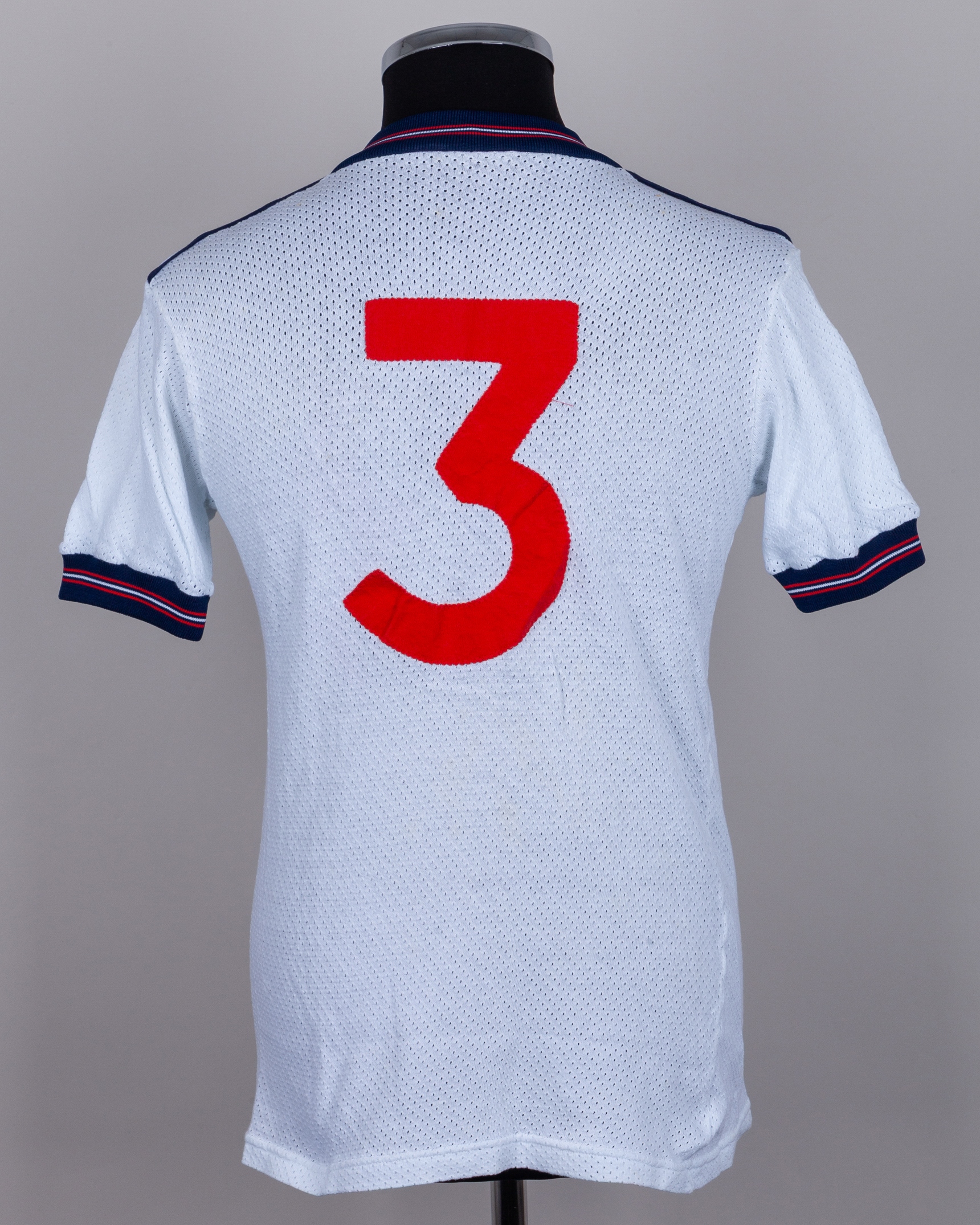 Kenny Sansom white and blue No.3 airtex England v. Italy match worn short-sleeved shirt, 1985