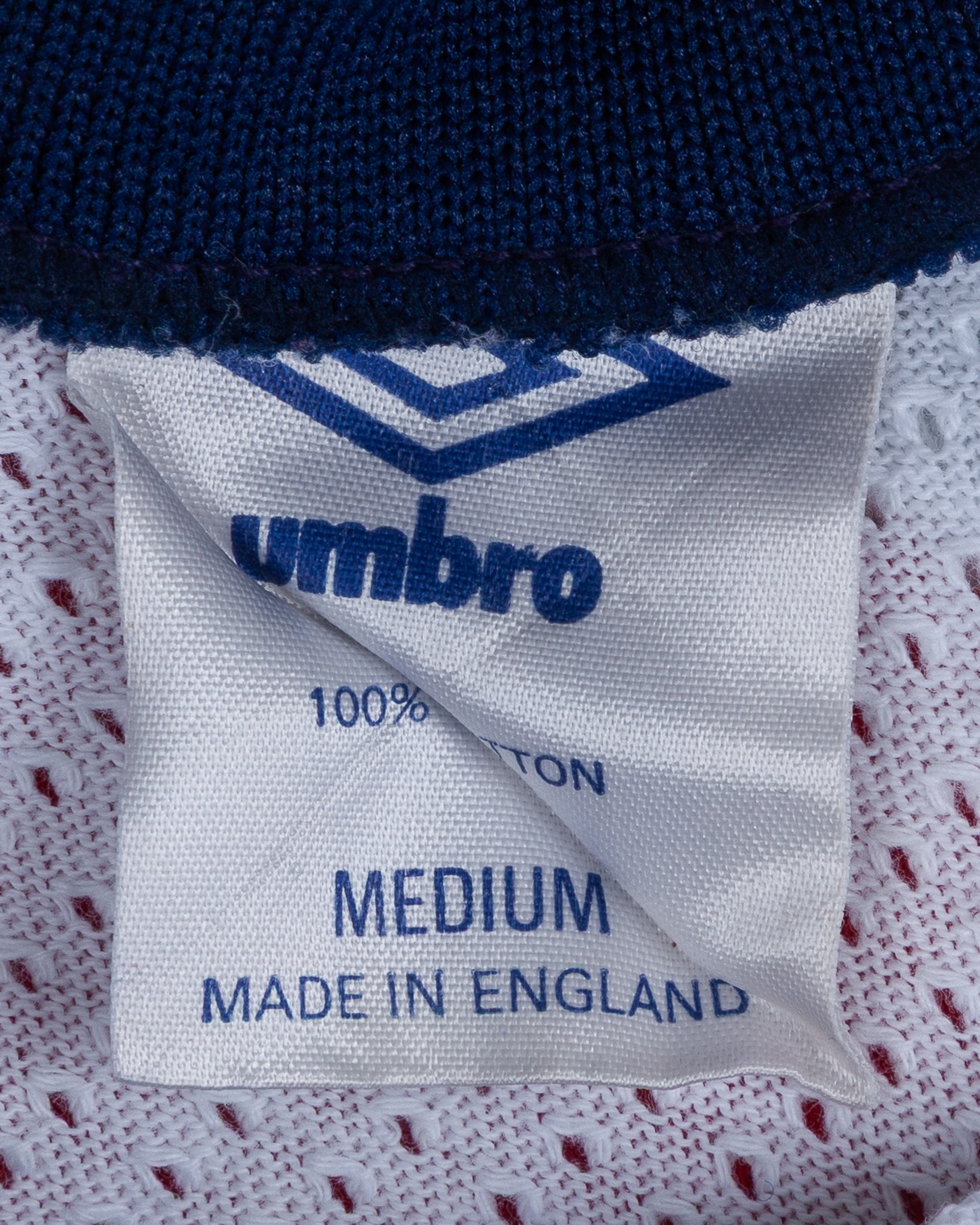 Kenny Sansom white and blue No.3 airtex England v. Italy match worn short-sleeved shirt, 1985, Umbro, Medium, with v-neck collar and embroidered cloth badge, staining front and back and small hole above Umbro logo, with signed COA from Kenny Sansom