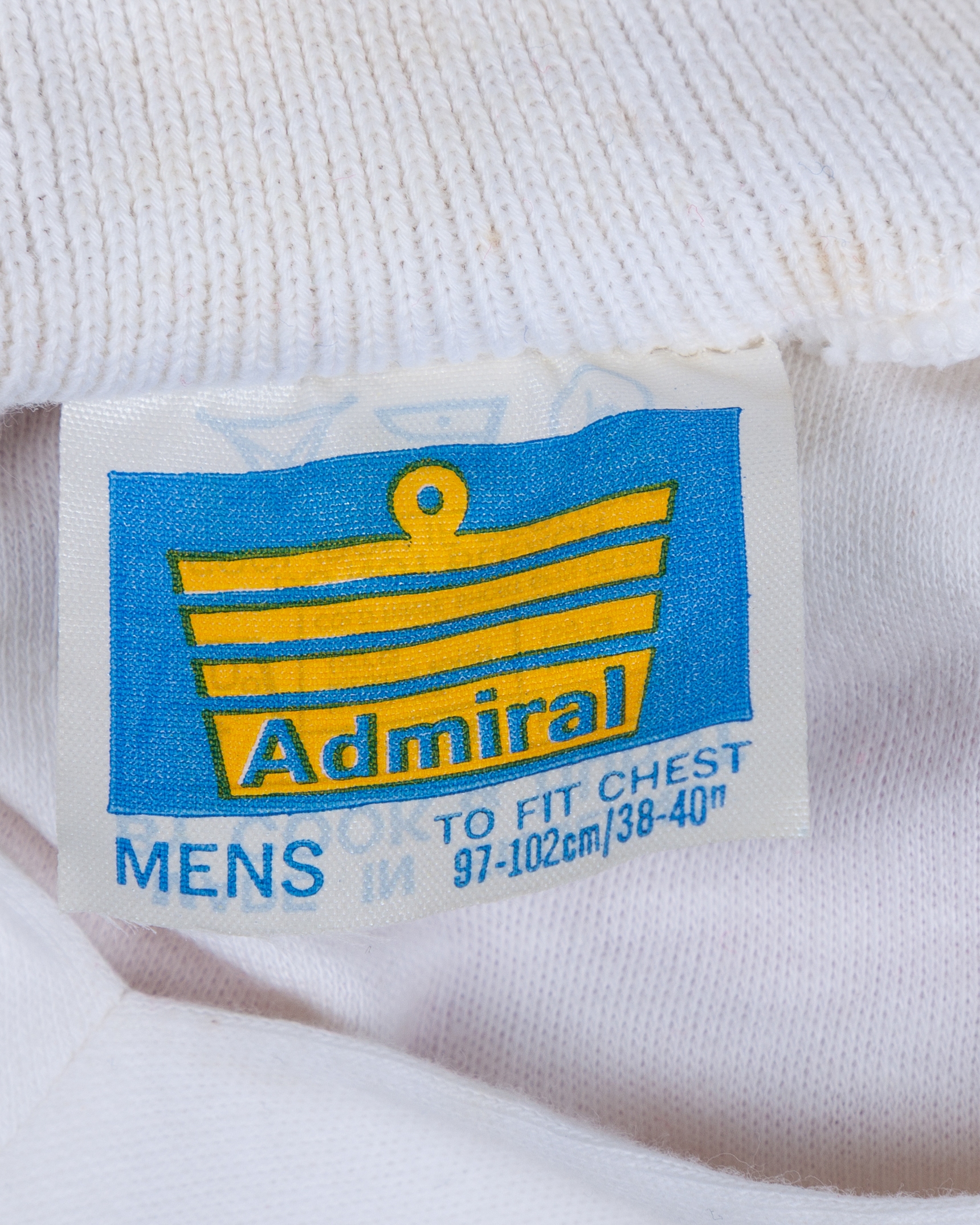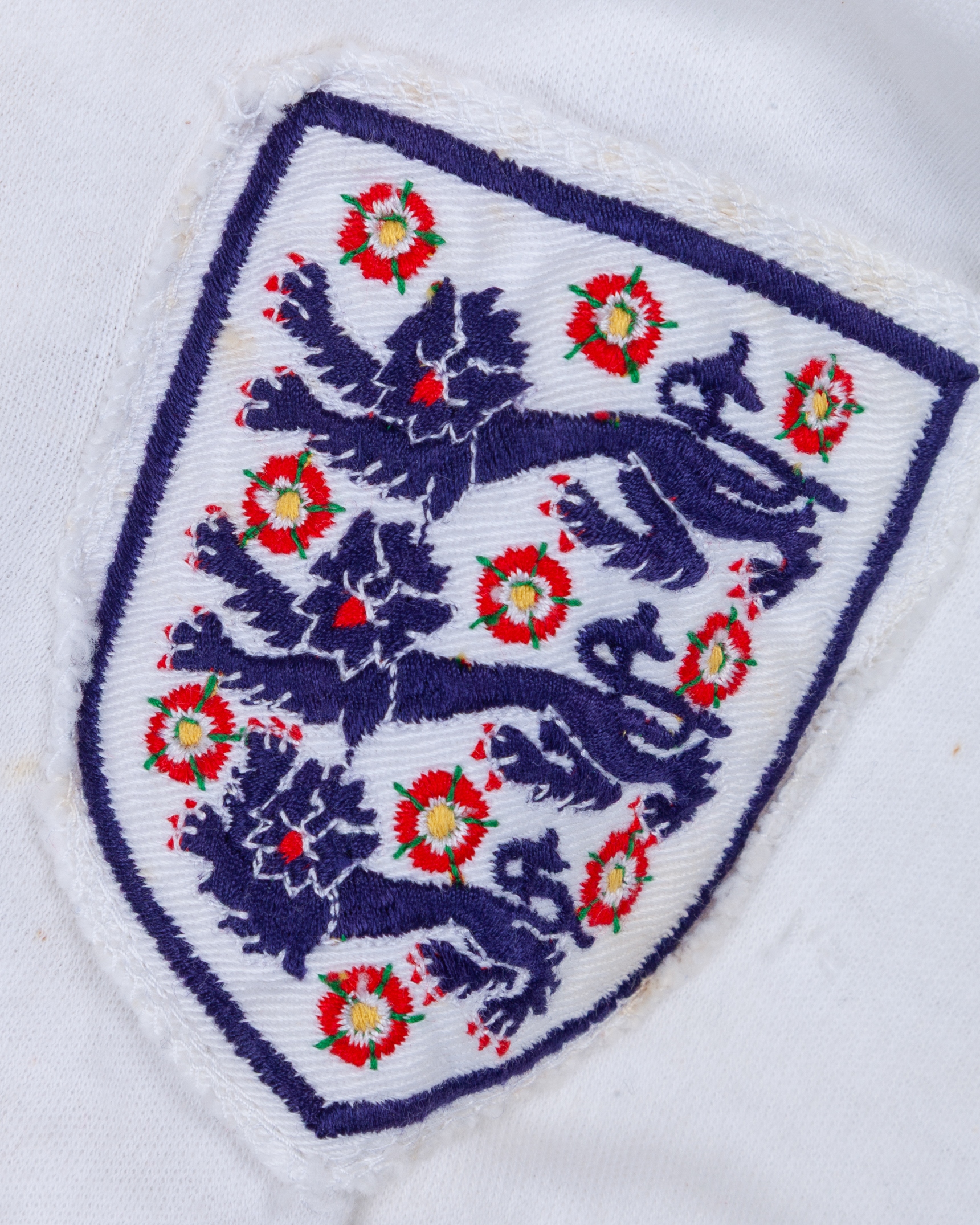 Kenny Sansom white England No.3 England v. Republic of Ireland match worn short-sleeved shirt, 1980, Admiral, Mens, with v-neck collar and embroidered cloth badge, staining front and back