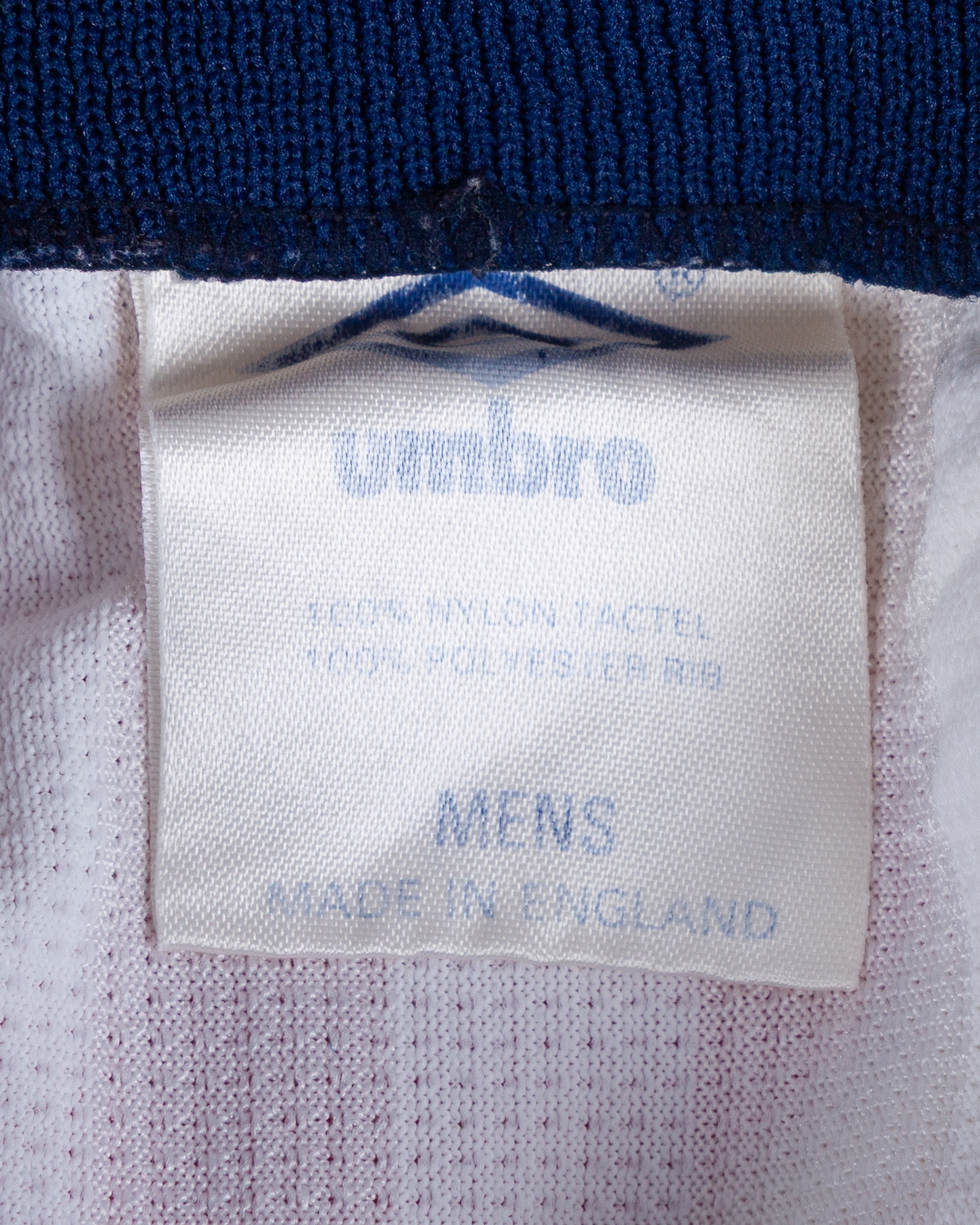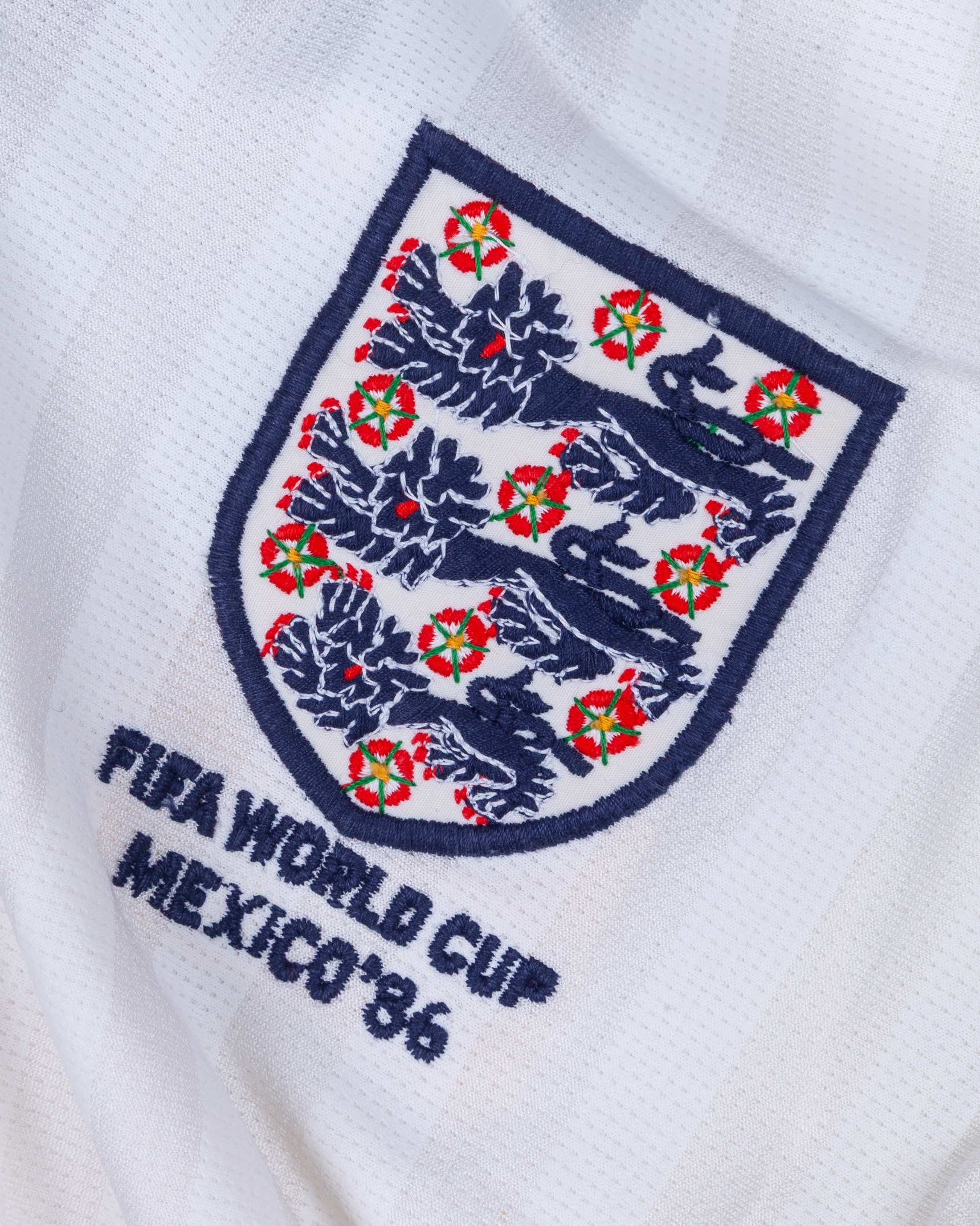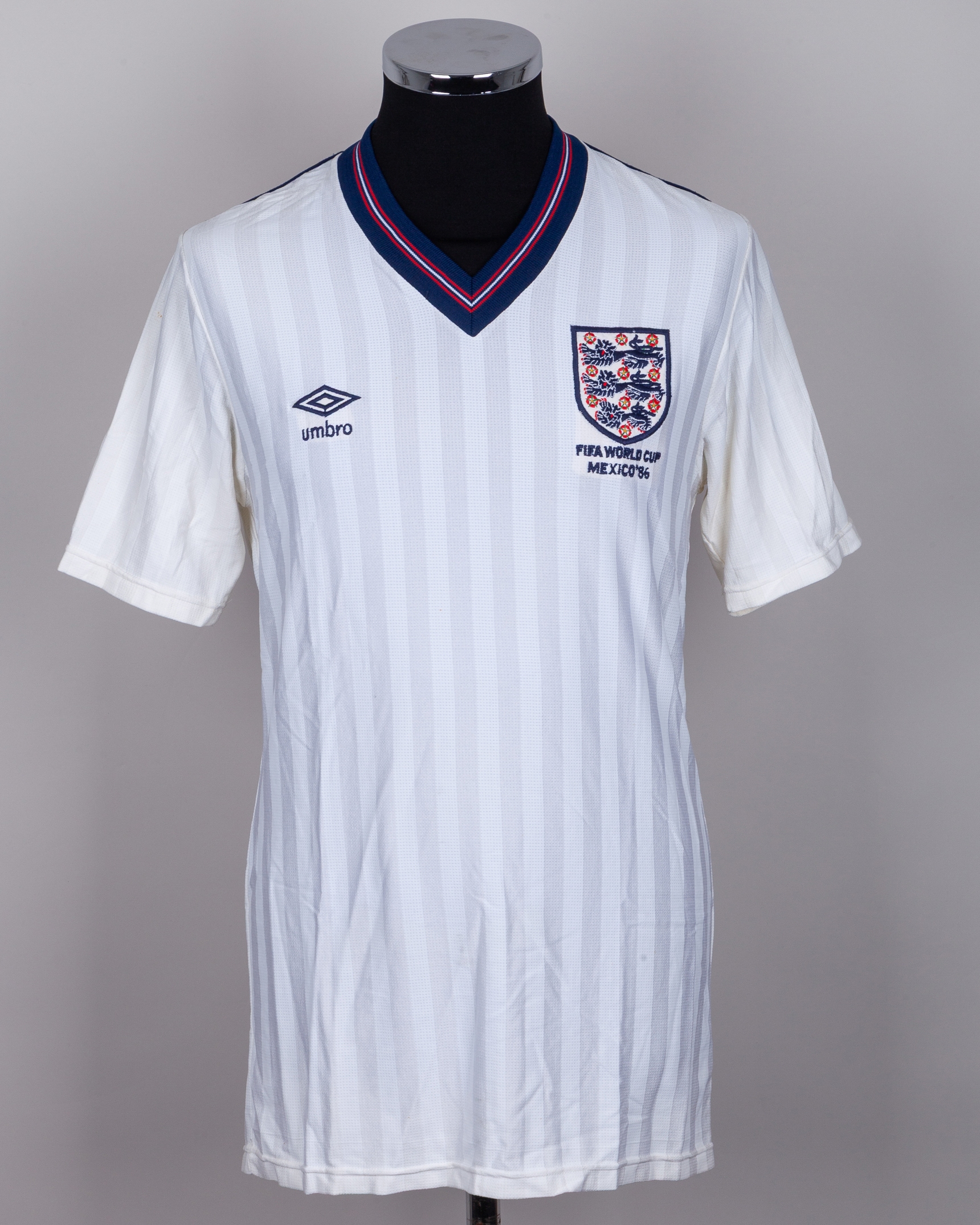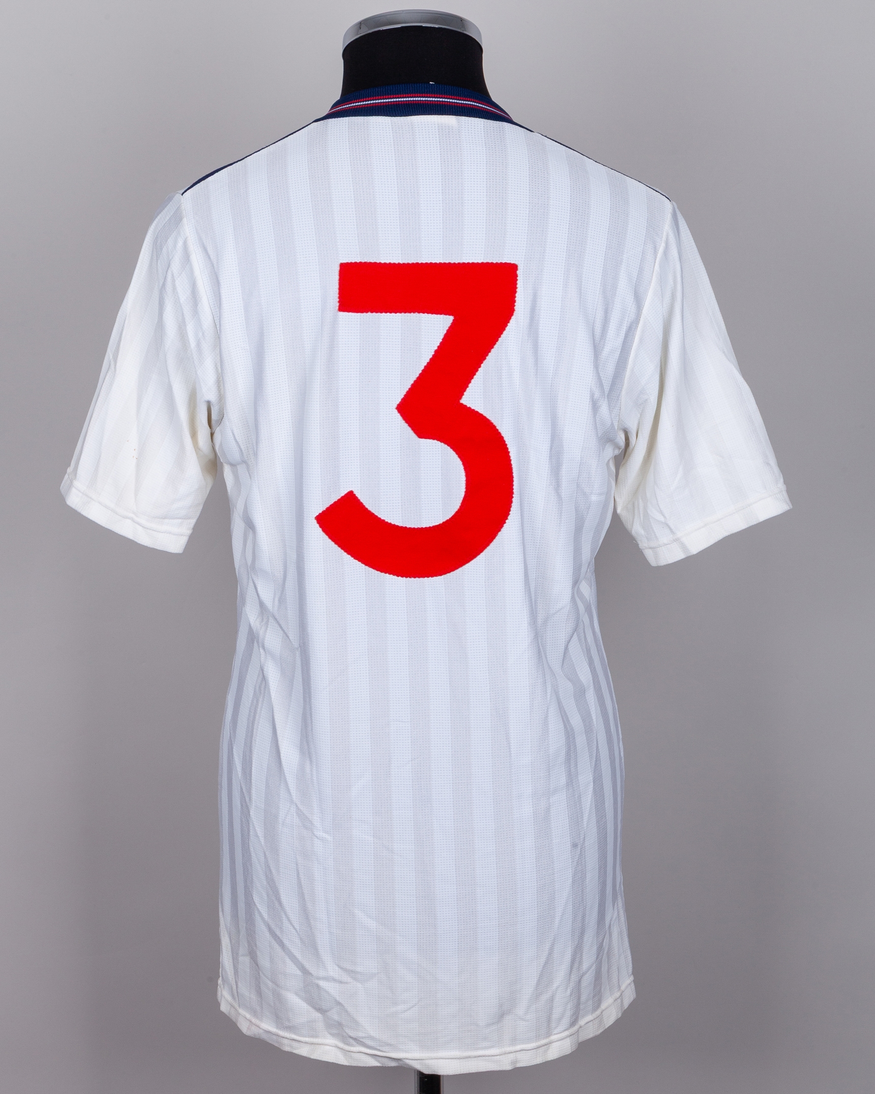 Kenny Sansom white and blue No.3 England 1986 World Cup short-sleeved shirt, Umbro, Mens, with v-neck collar and embroidered cloth badge inscribed FIFA WORLD CUP MEXICO '86