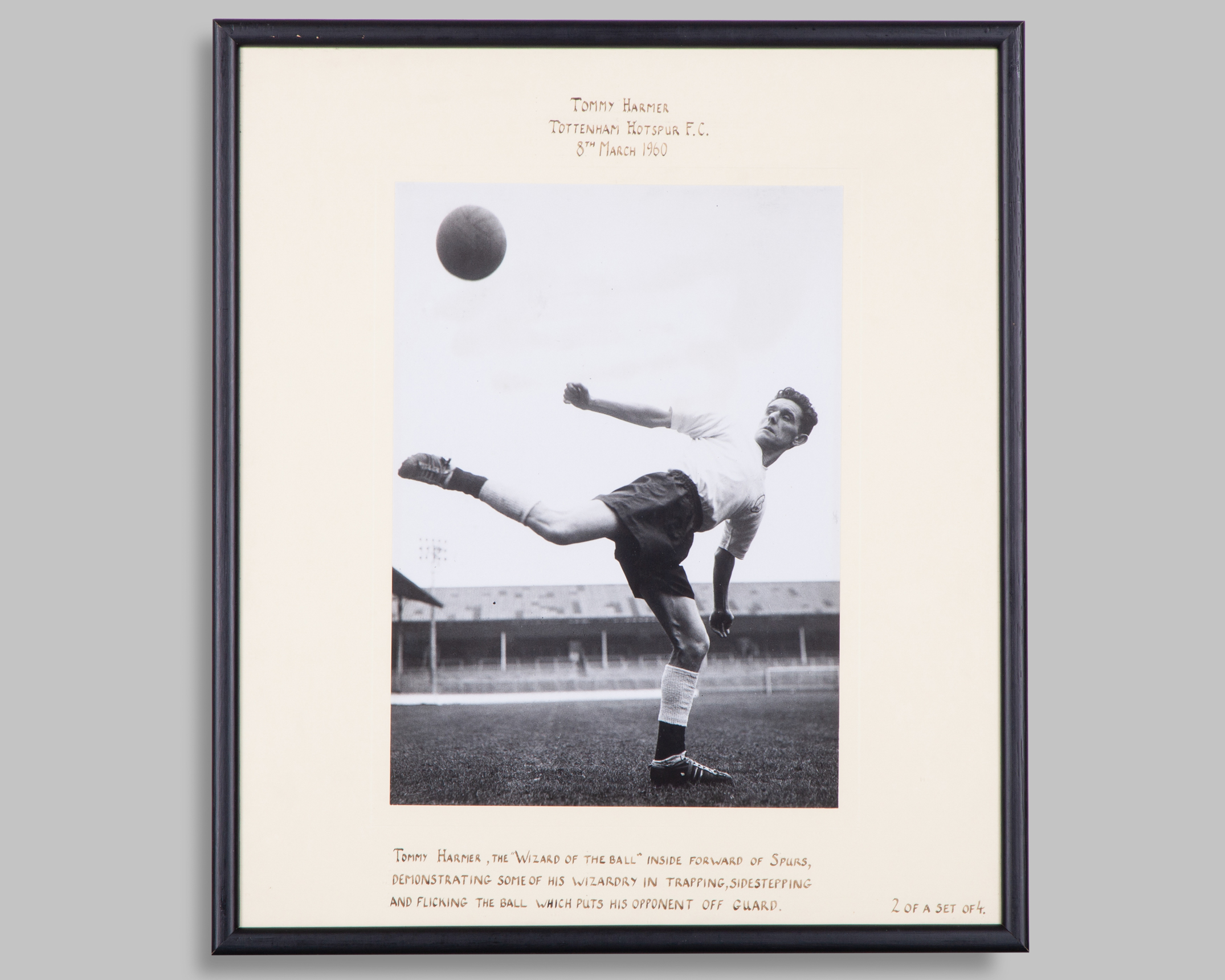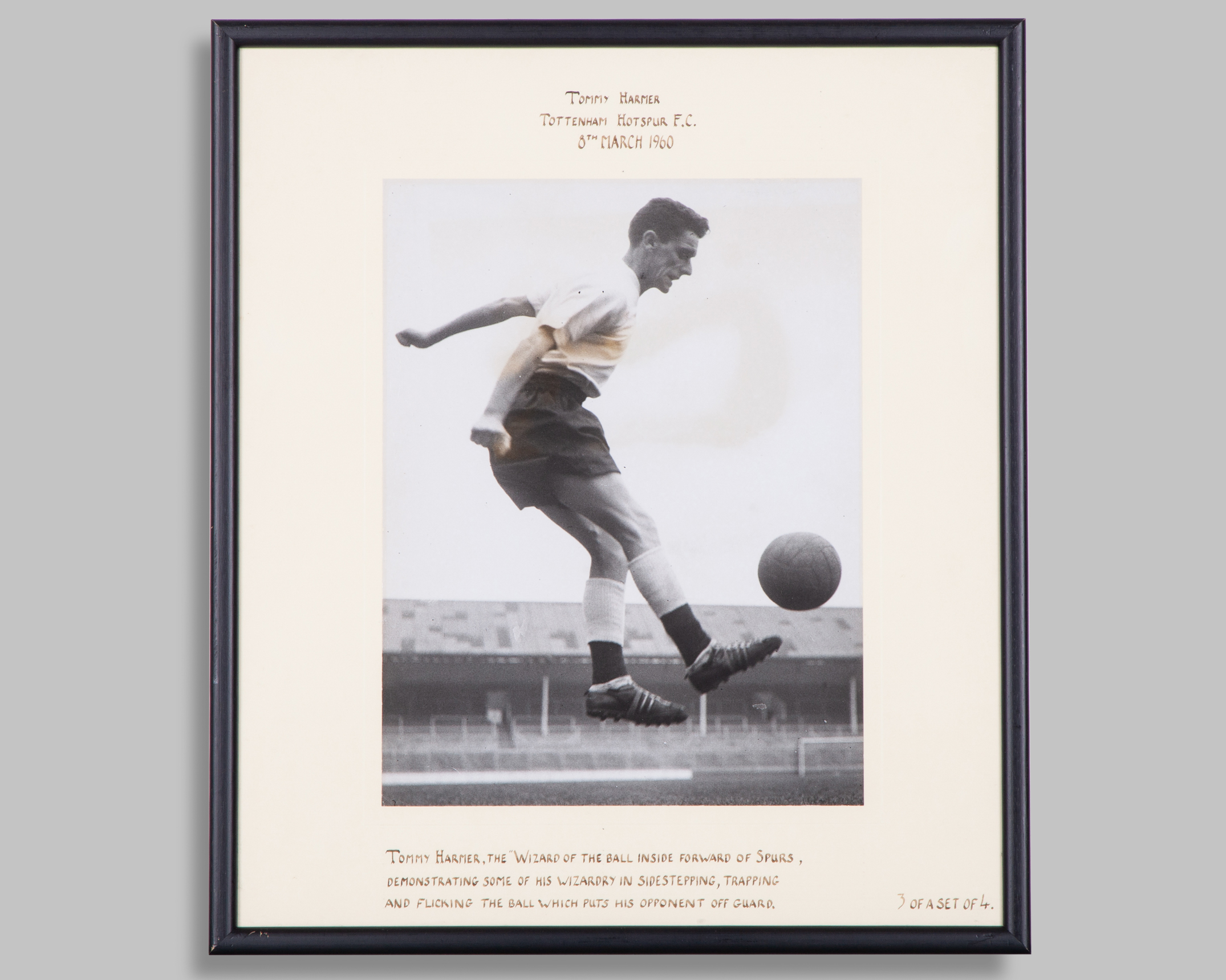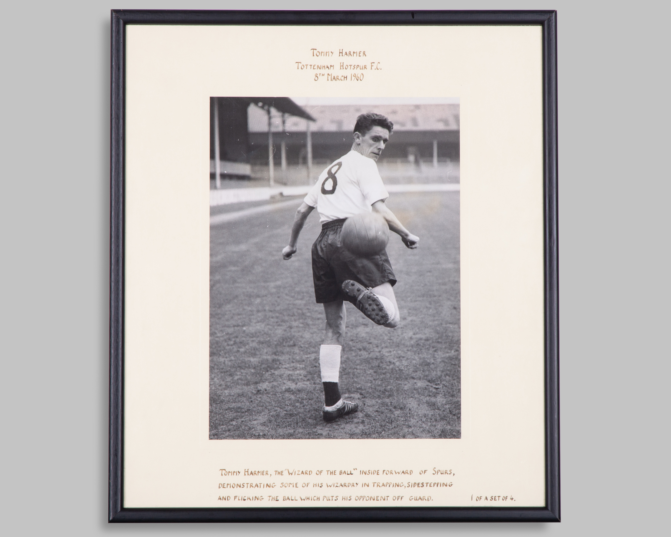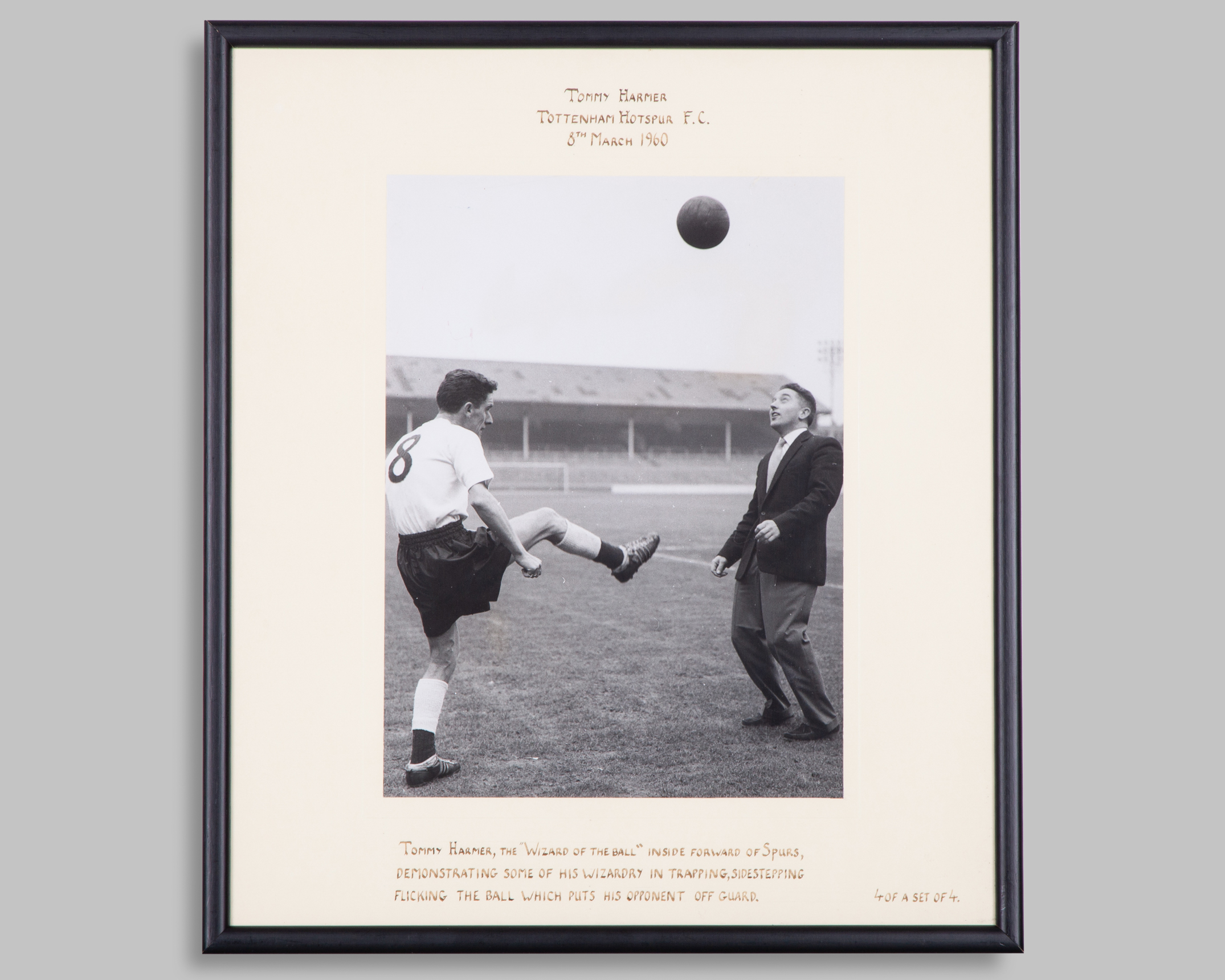 Tommy Harmer, Tottenham Hotspur F.C.: four various black and white press photographs depicting the "Wizard of the ball" displaying his skills during training at White Hart Lane each with cream coloured common mount, inscribed with relevant details and dated 8th March 1960, 42 x 37cm, framed and glazed