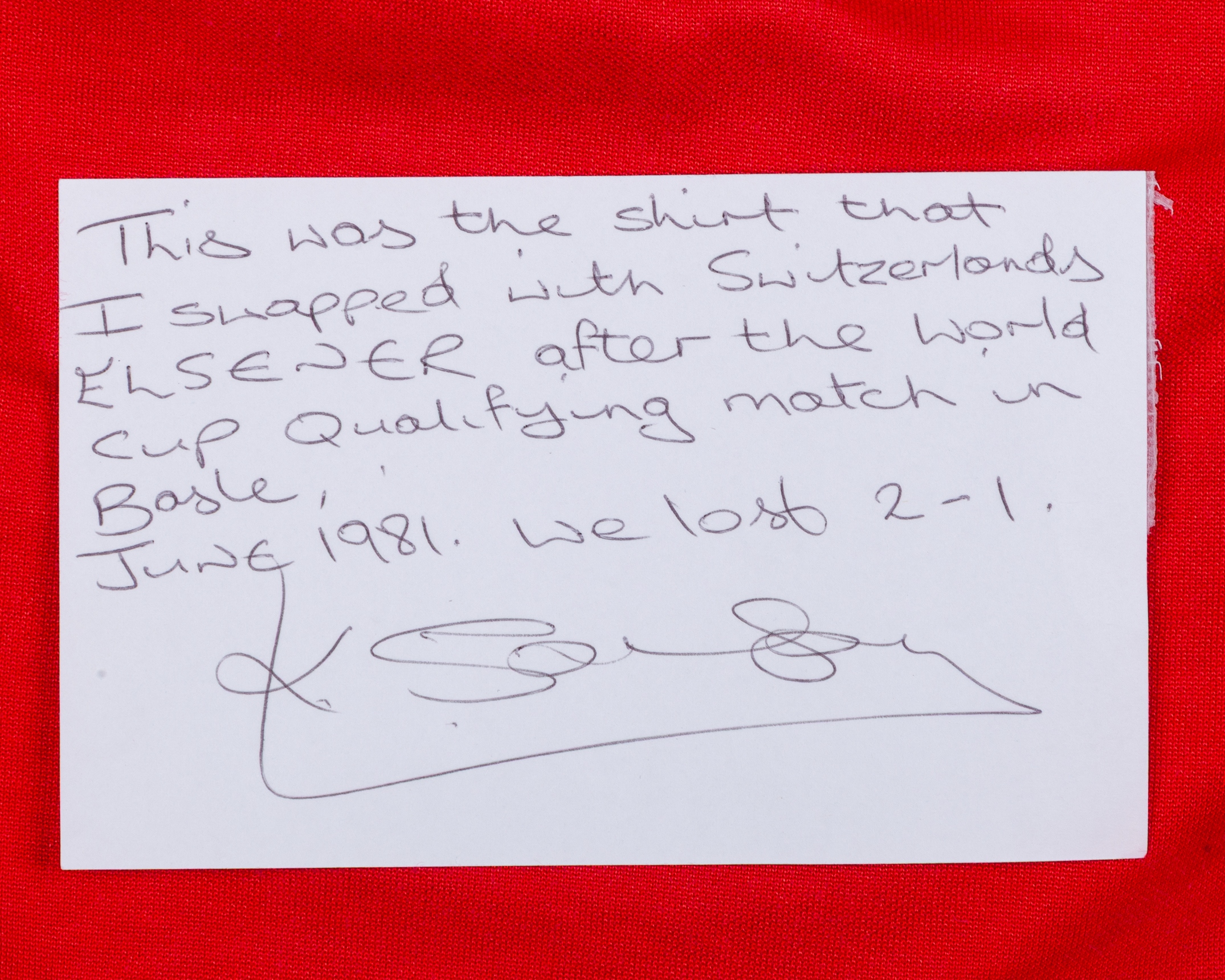 The above shirt was worn by Elsener and gained by Kenny Sansom as a swap after the World Cup qualifying match played on 30th May 1981 in Basel, The Swiss defeating England 2-1