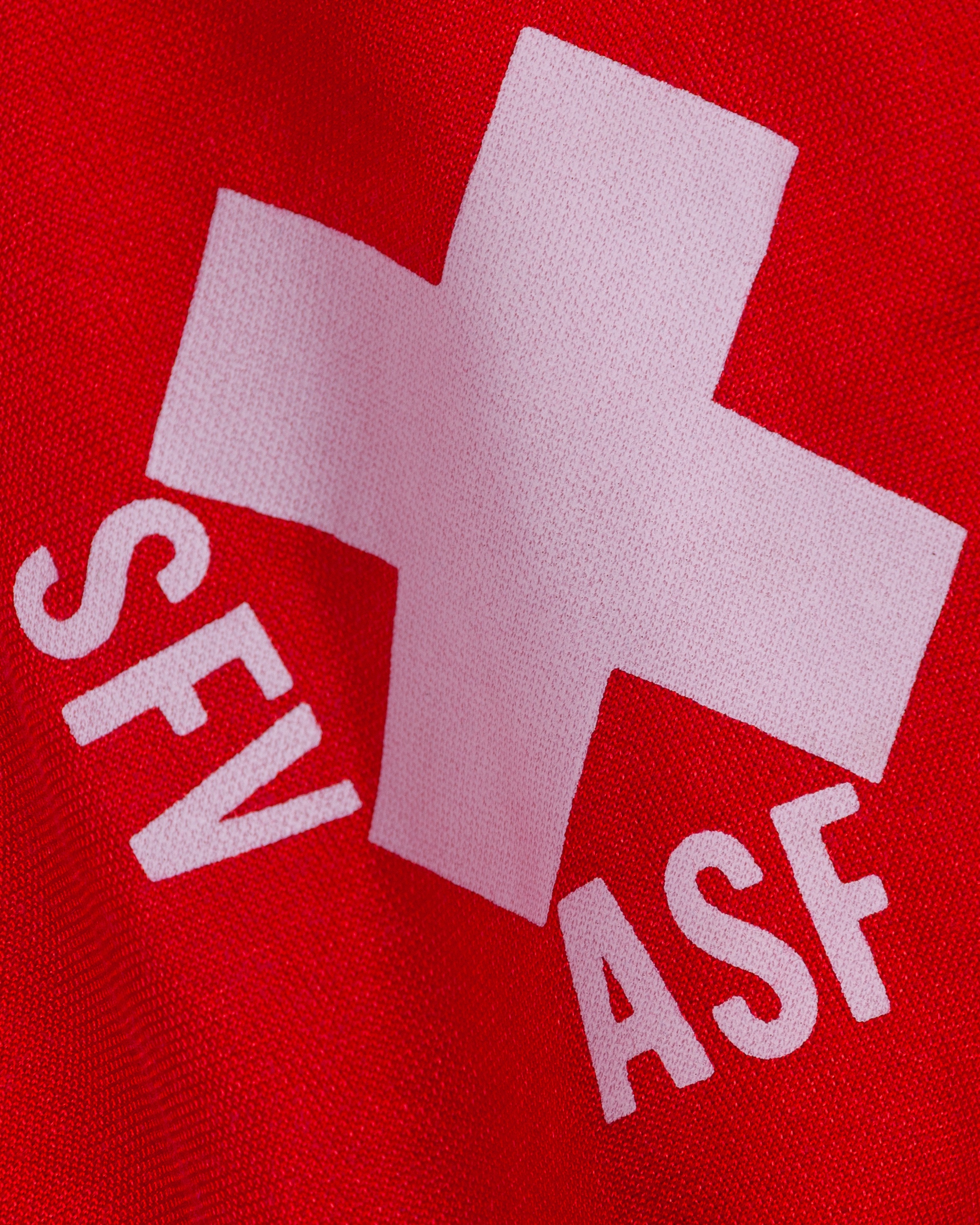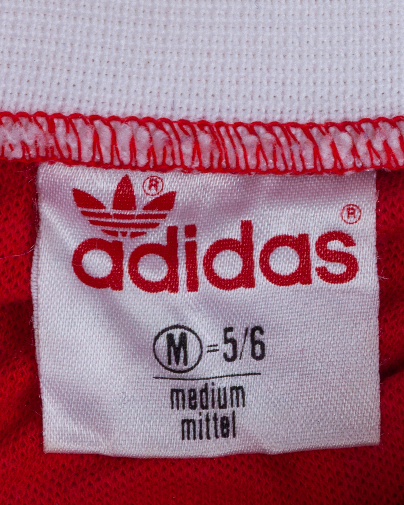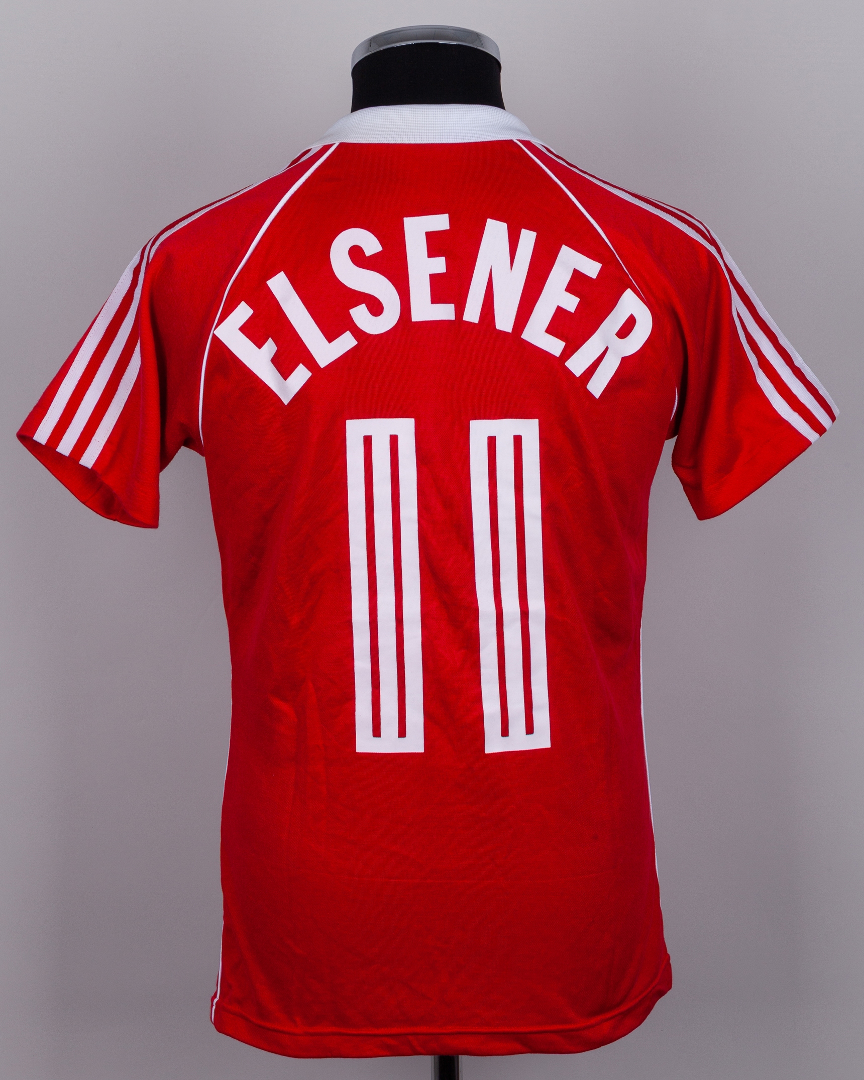 Rudolf Elsener red and white No11 Switzerland v. England match worn short-sleeved shirt, 1981, Adidas, M, with v-neck collar and printed badge, the reverse lettered ELSENER, with signed COA from Kenny Sansom