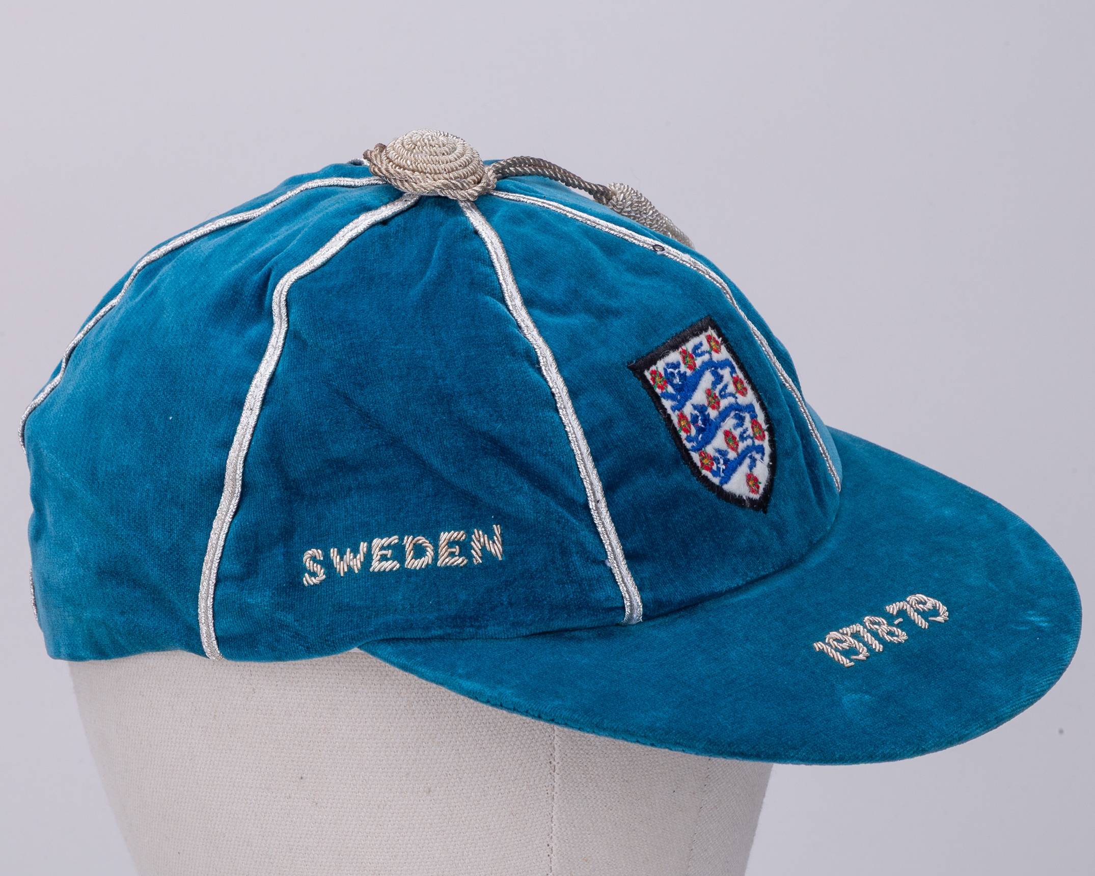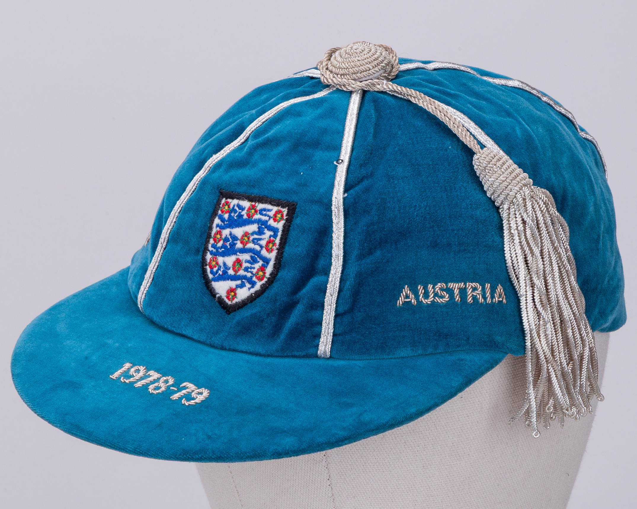 Peter Shilton blue England v. Sweden and Austria International cap, 1978-79, the blue velvet cap with silver tassel and silvered braiding, embroidered with the England three lion crest inscribed SWEDEN AUSTRIA 1978-79