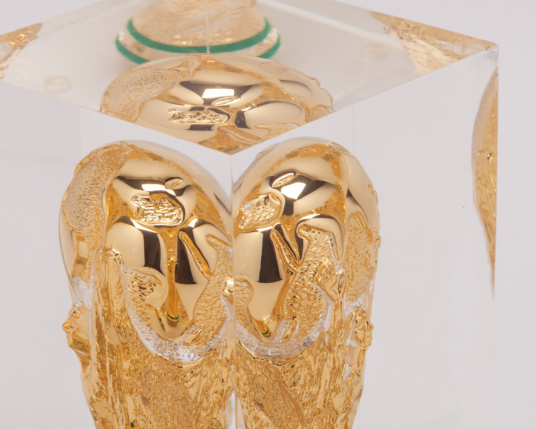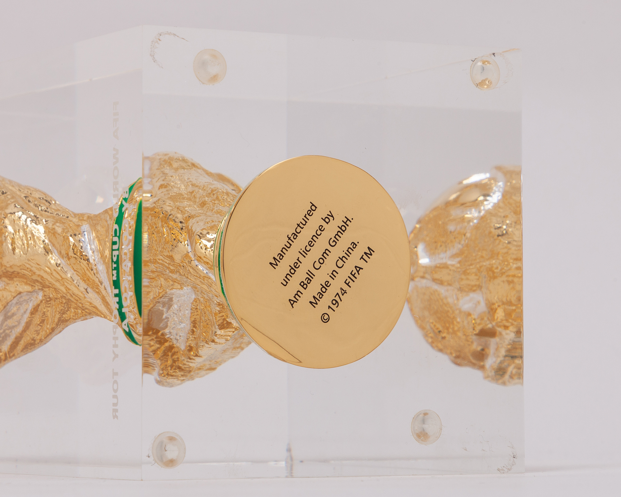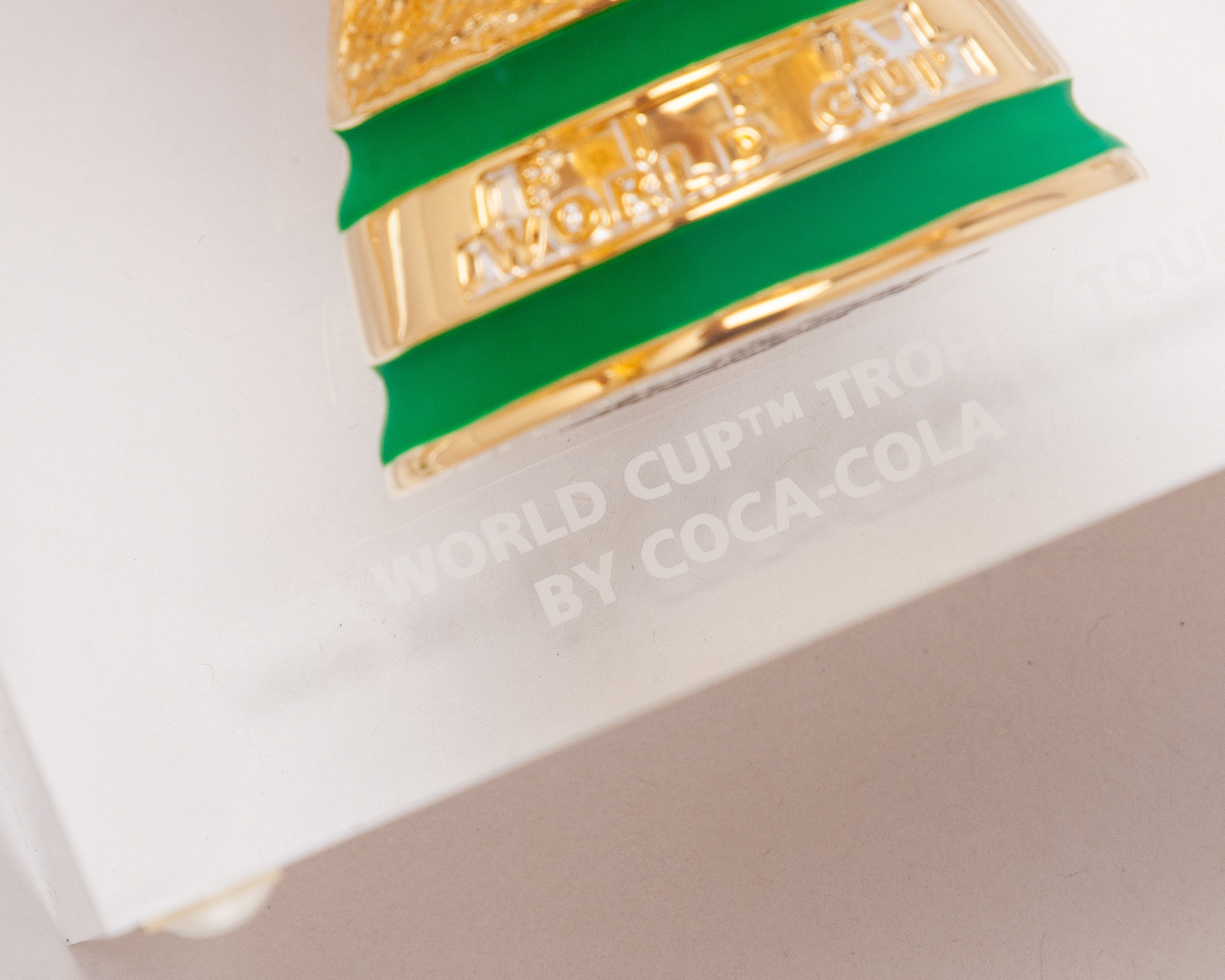 FIFA World Cup replica trophy commemorating the 2022 trophy tour in Wales, incased in resin and inscribed WALES FIFA WORLD CUP TROPHY TOUR BY COCA-COLA, 19cm high