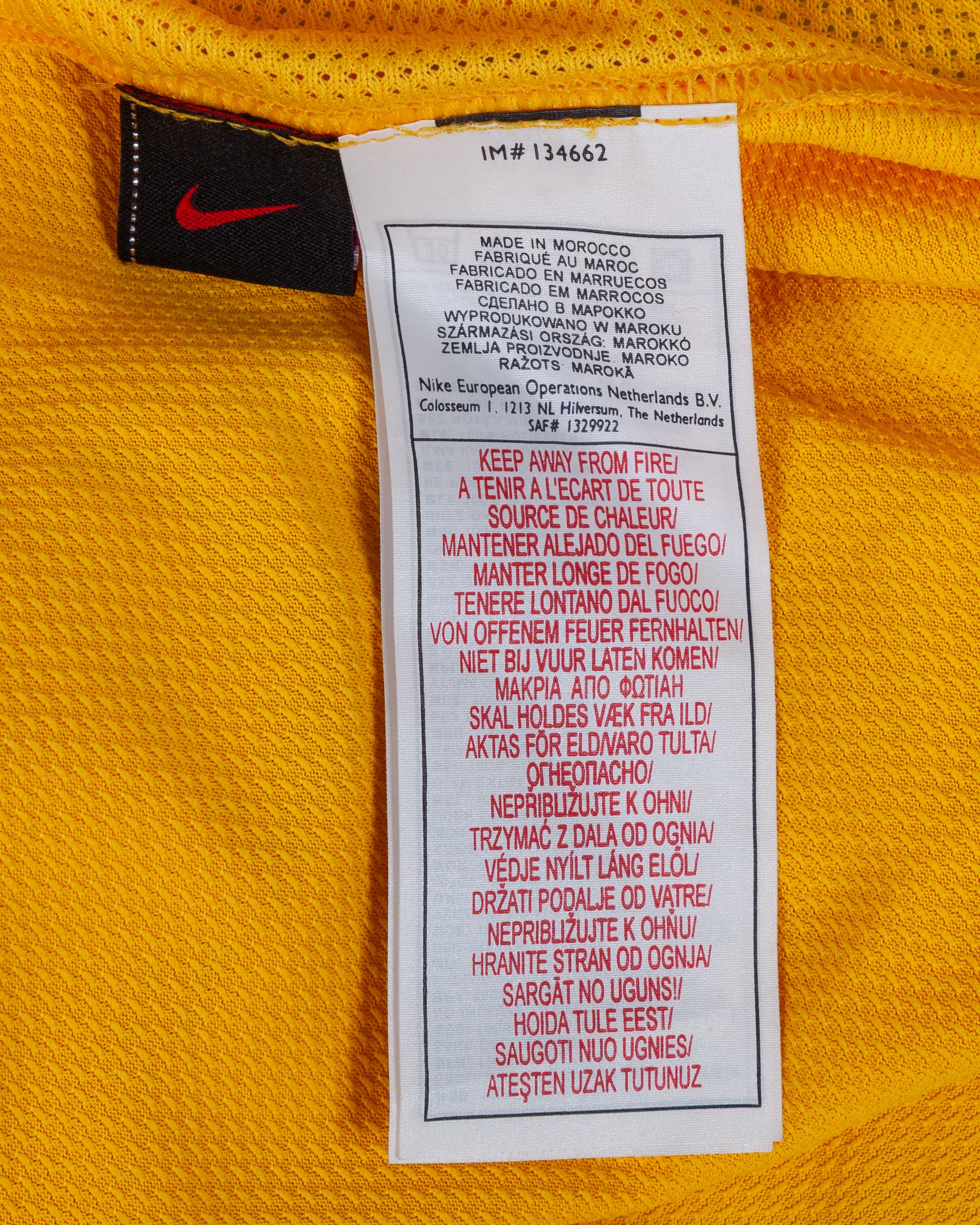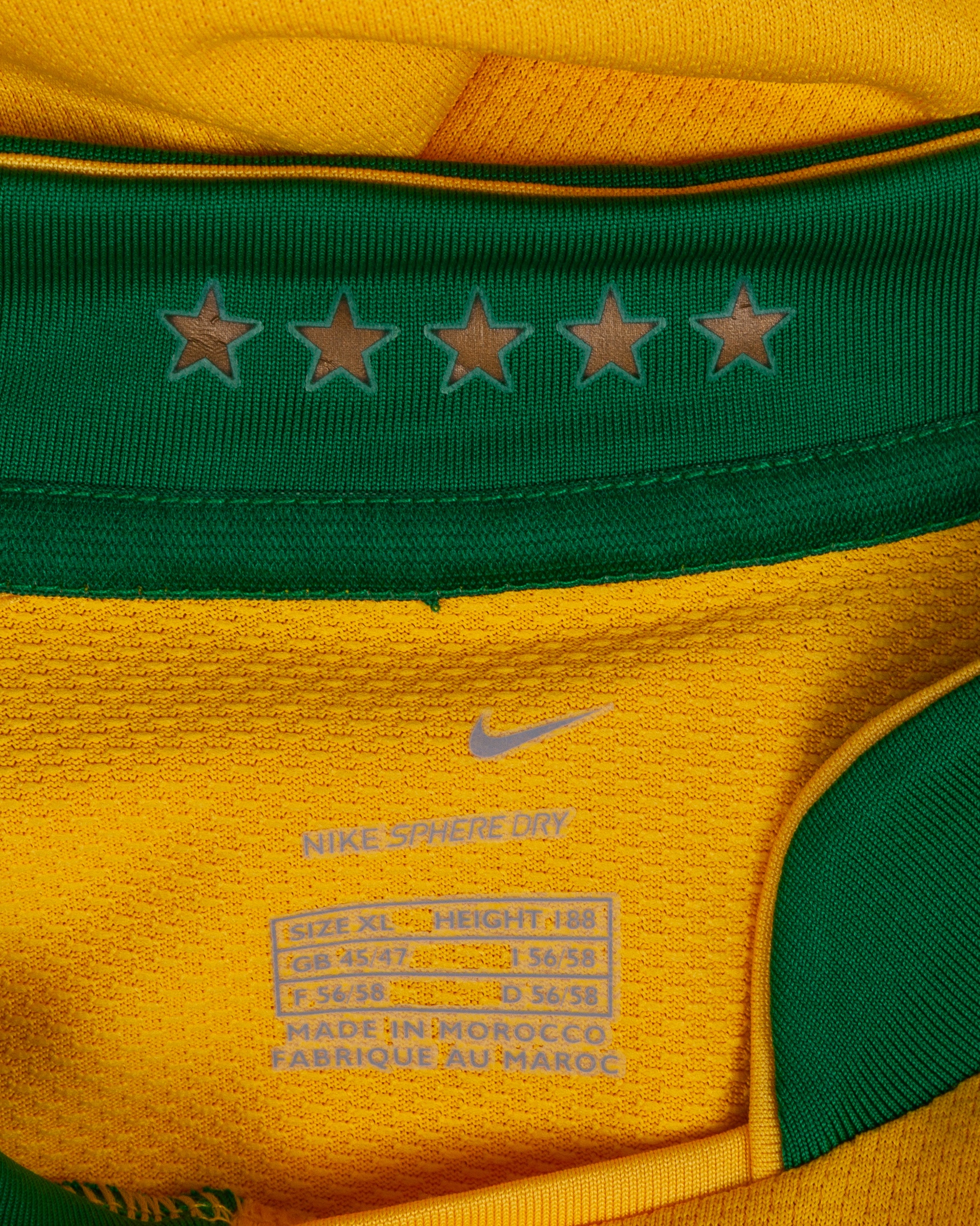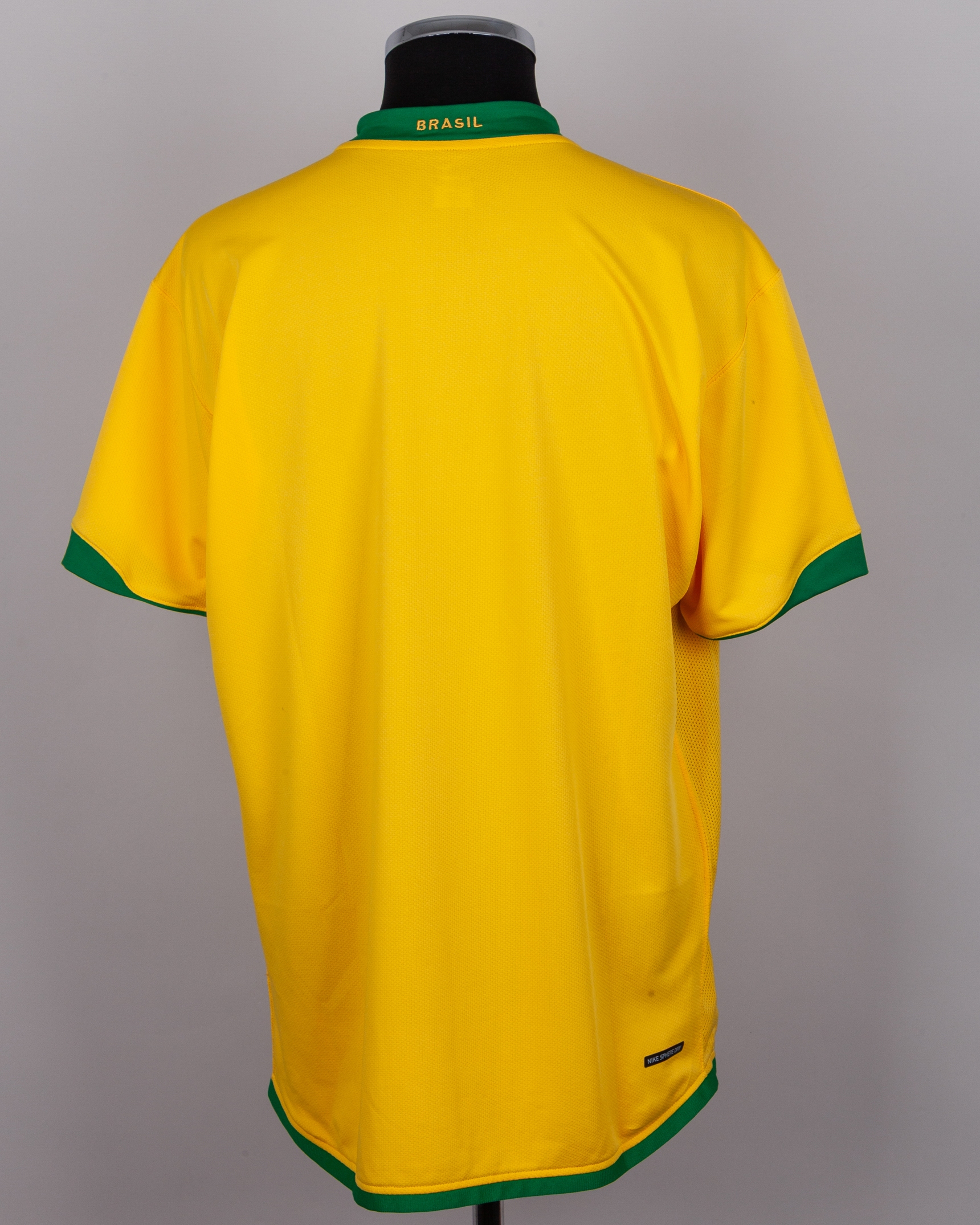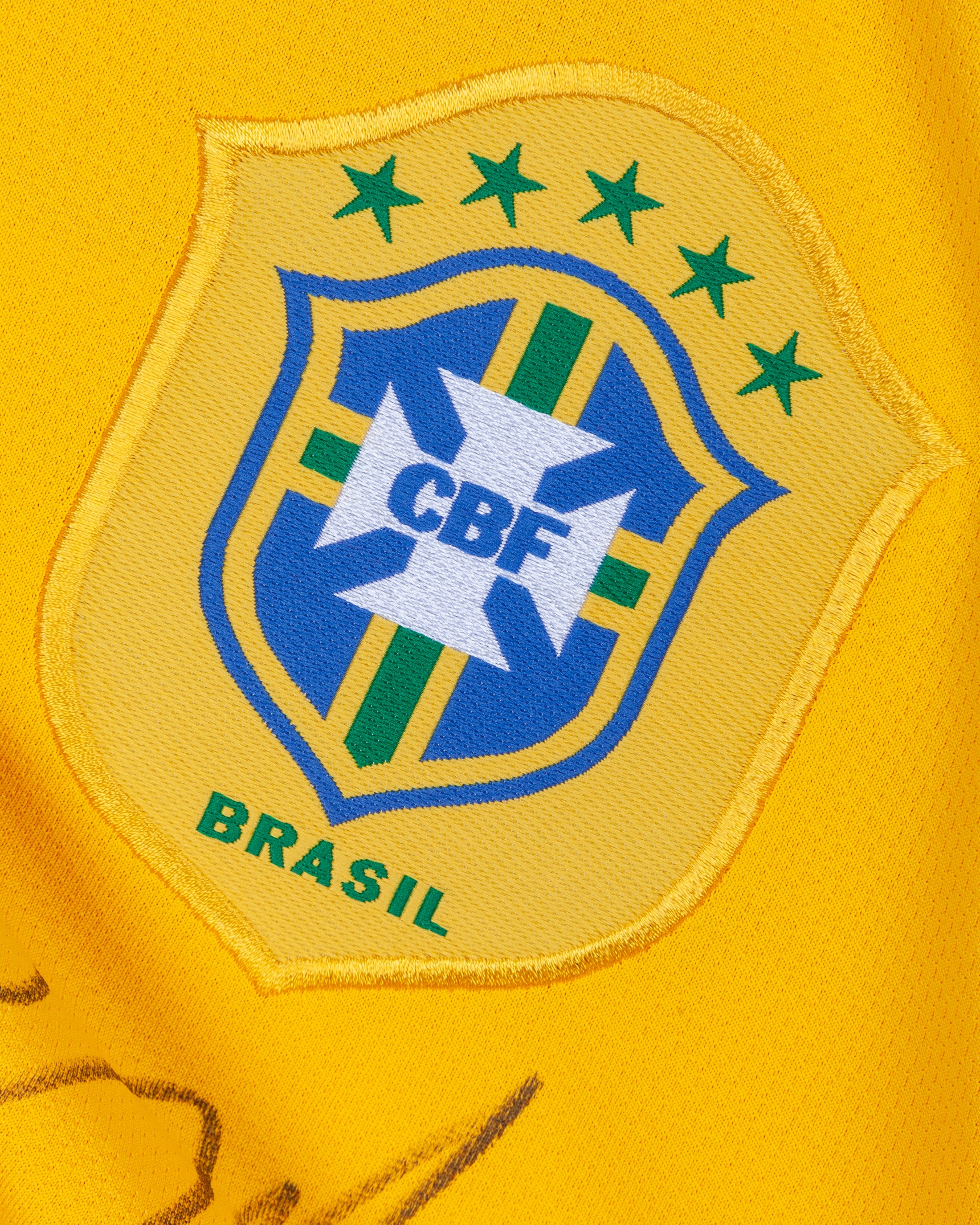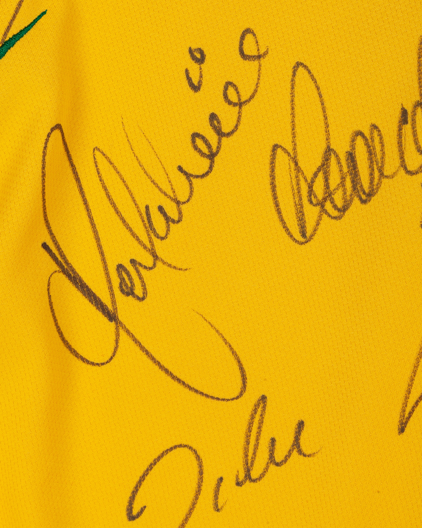 A yellow and green Brazil replica autographed shirt, the front bearing nine autographs