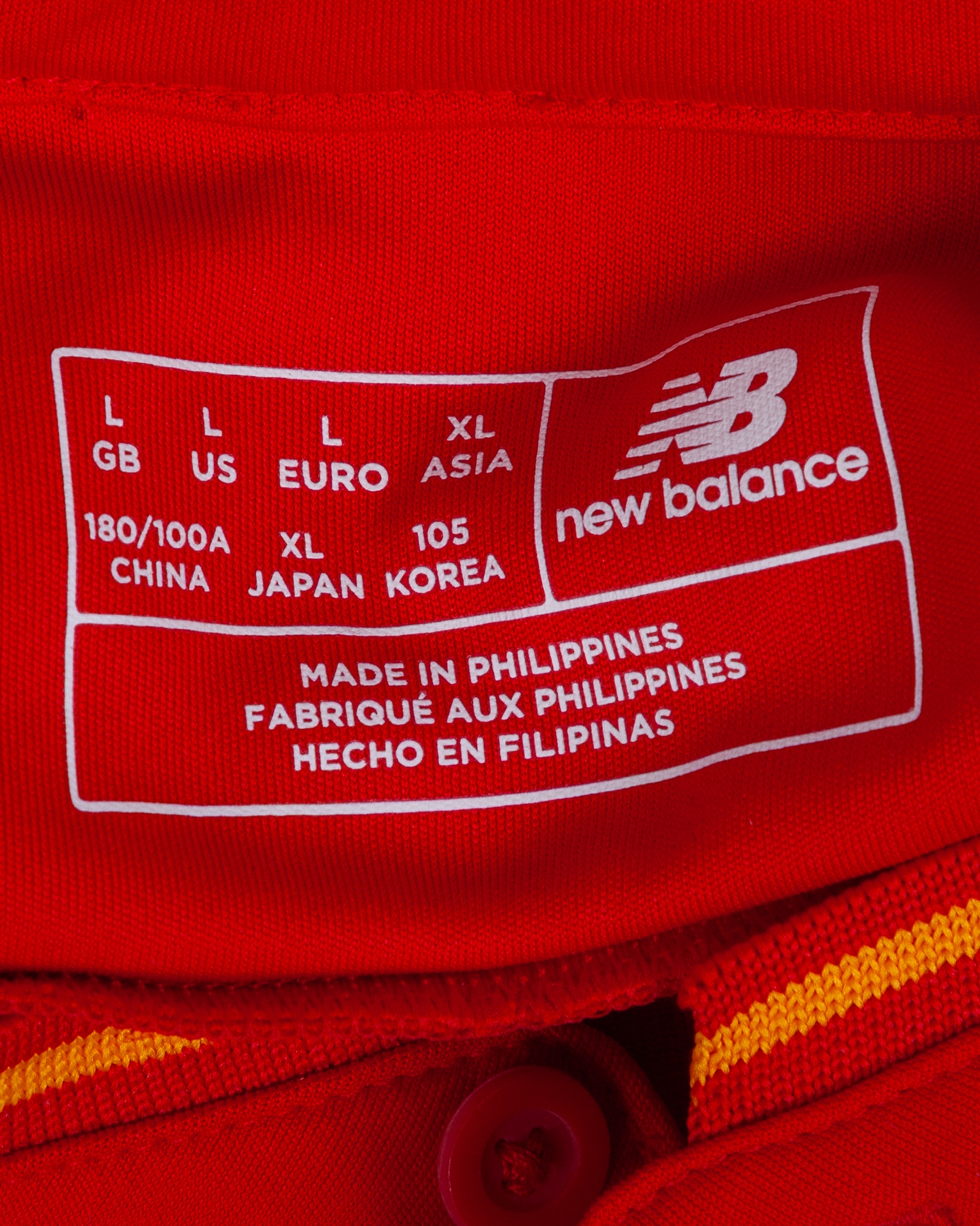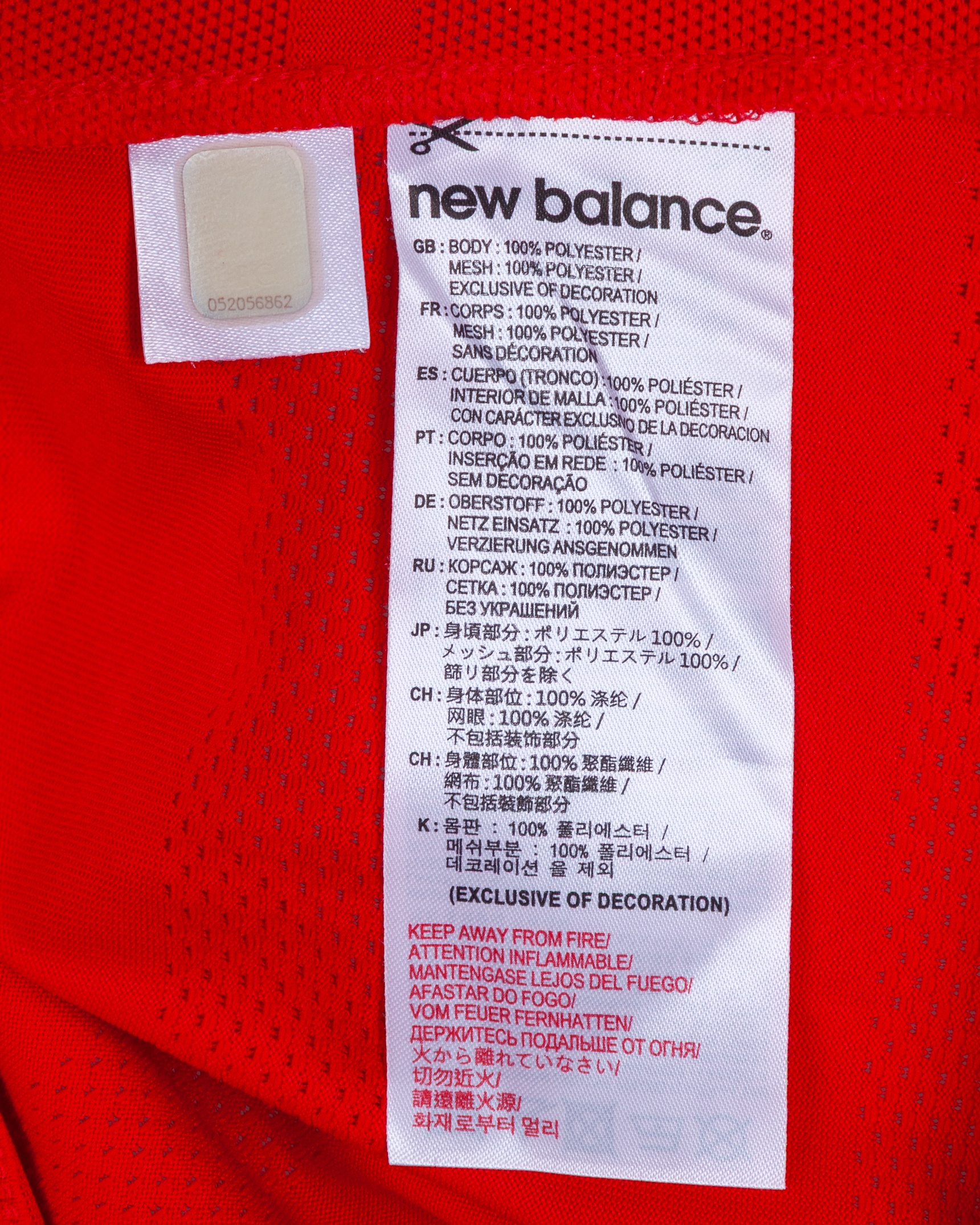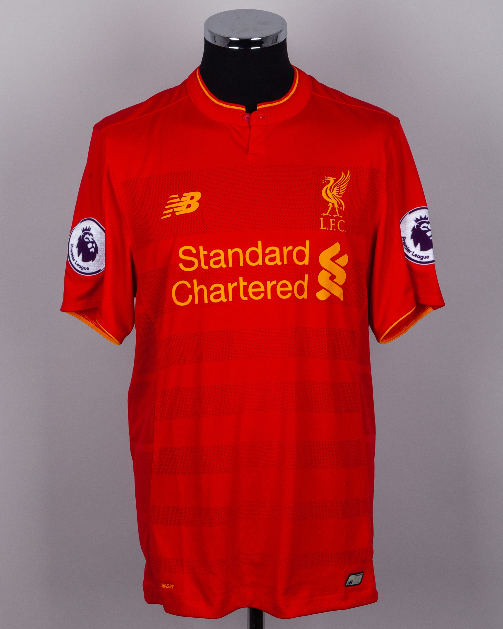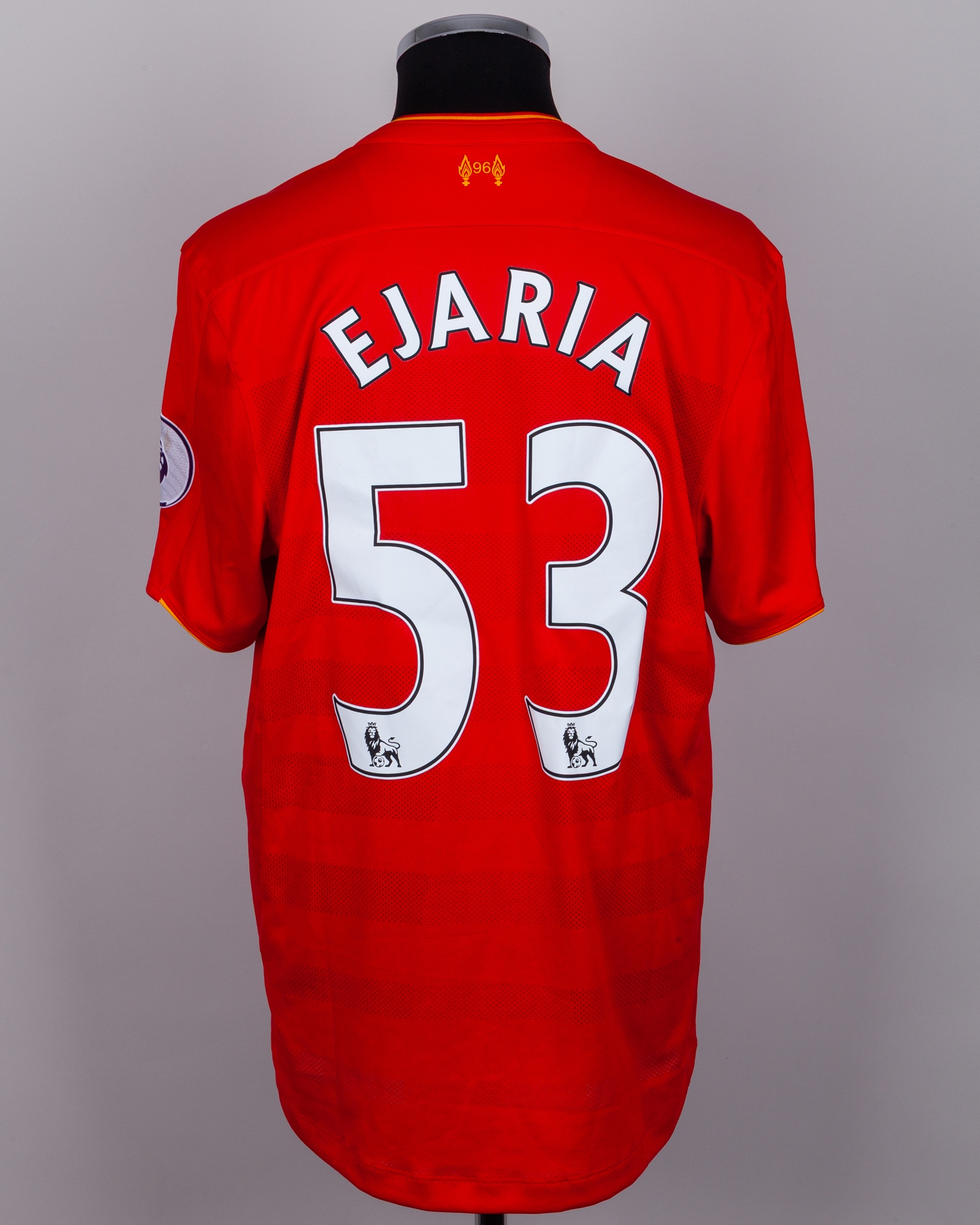 Ovie Ejaria red No.53 Liverpool match issue short-sleeved shirt, 2016, New Balance, L, with button-up collar and printed badge, the reverse lettered EJARIA, the sleeves with Premier League flashes